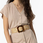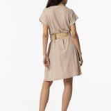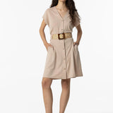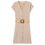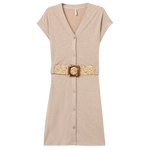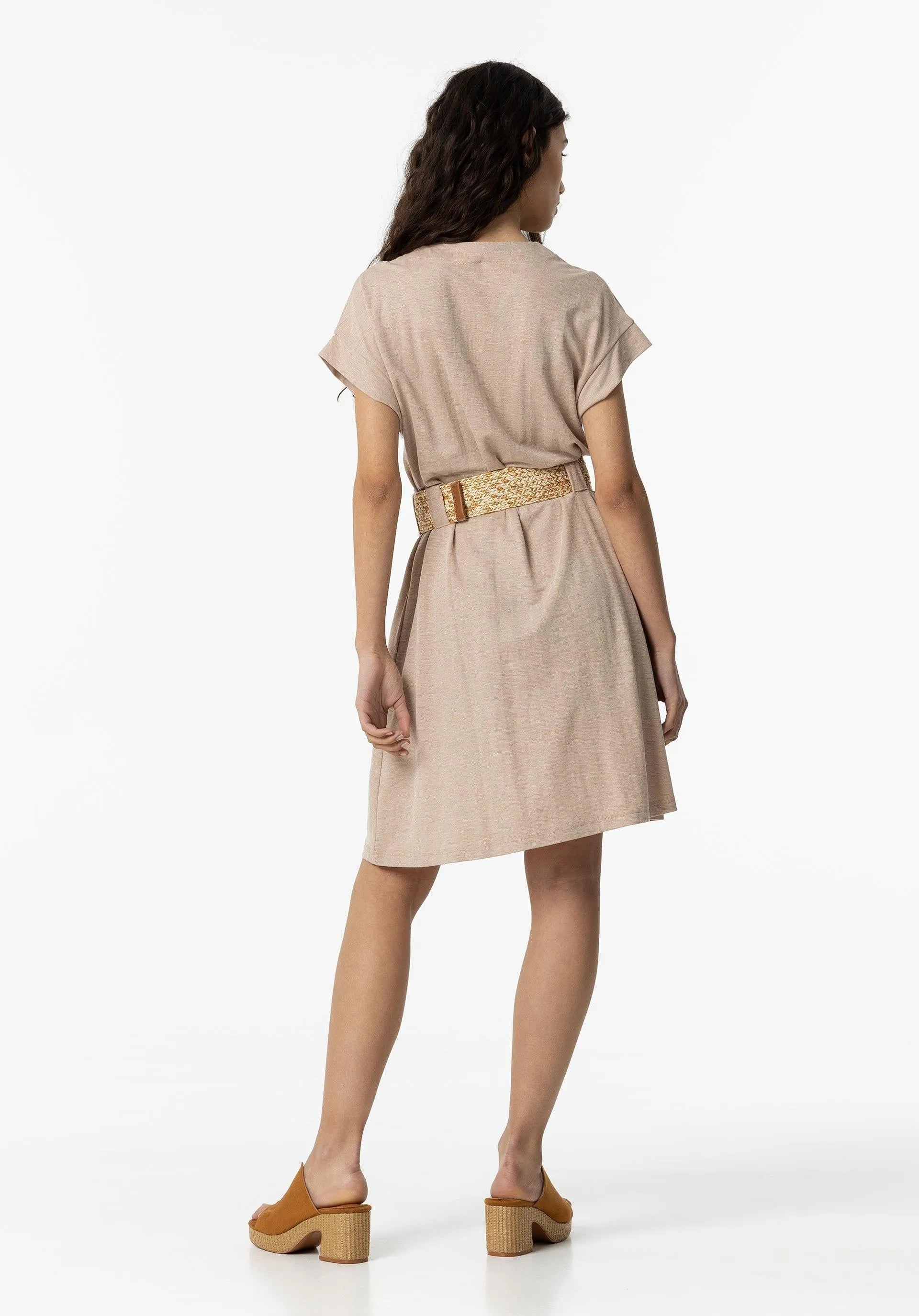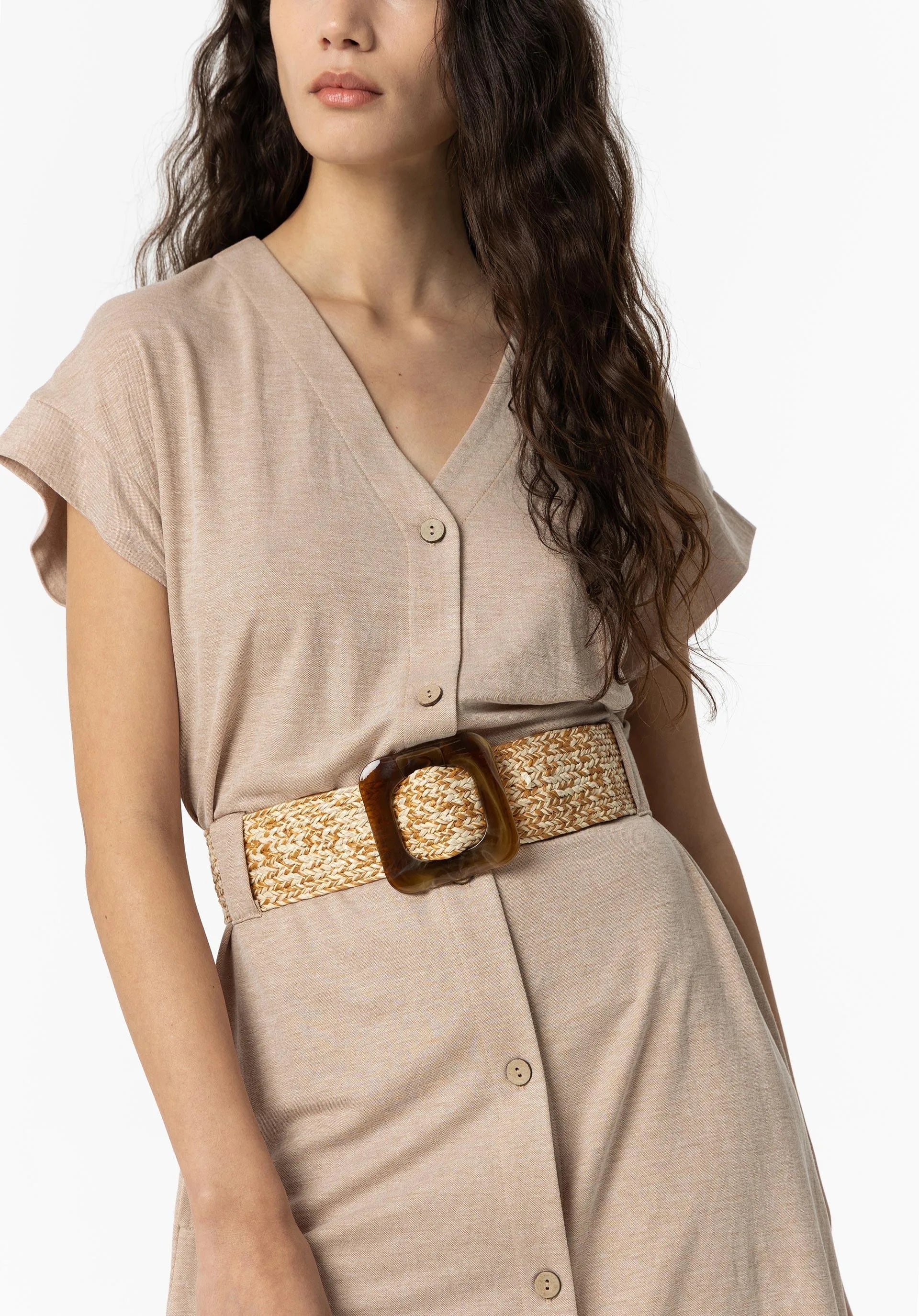 Kleid mit V-Ausschnitt und kurzen Ärmeln. Knopfverschluss vorne. Zweifarbige geflochtene Gürtelapplikation. Seitentaschen.