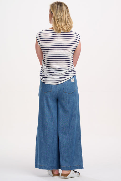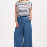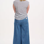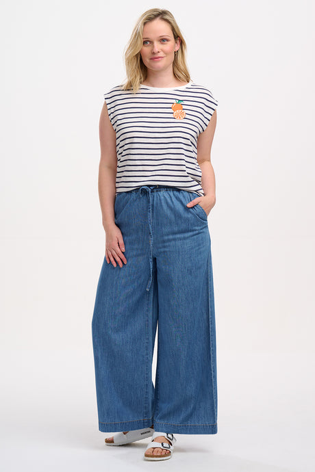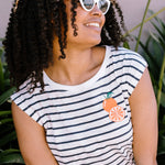 The new Chrissy tank top has a loose, boxy fit. Perfect for casual days or sunbathing. Pair it with your favorite jeans for a simple summer look. Featuring orange embroidery on the chest and a thin navy stripe on an off-white base.