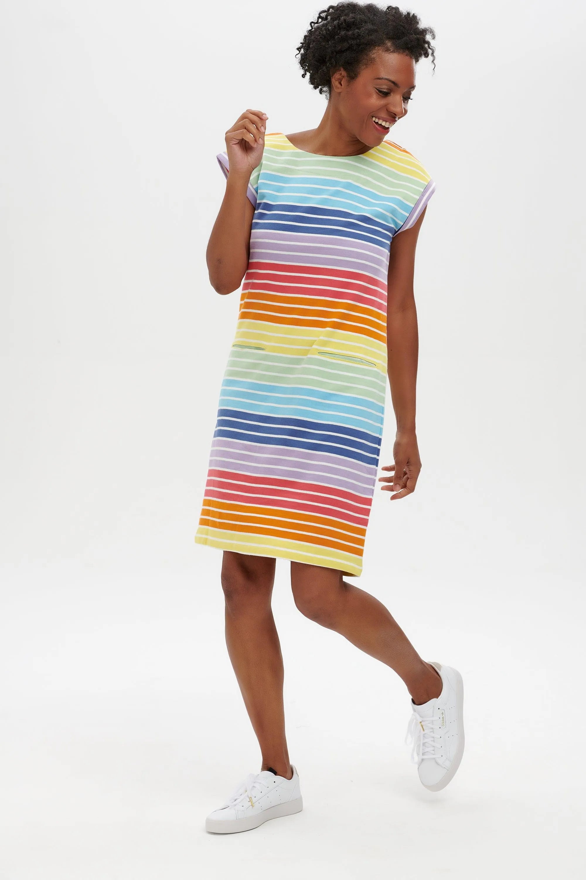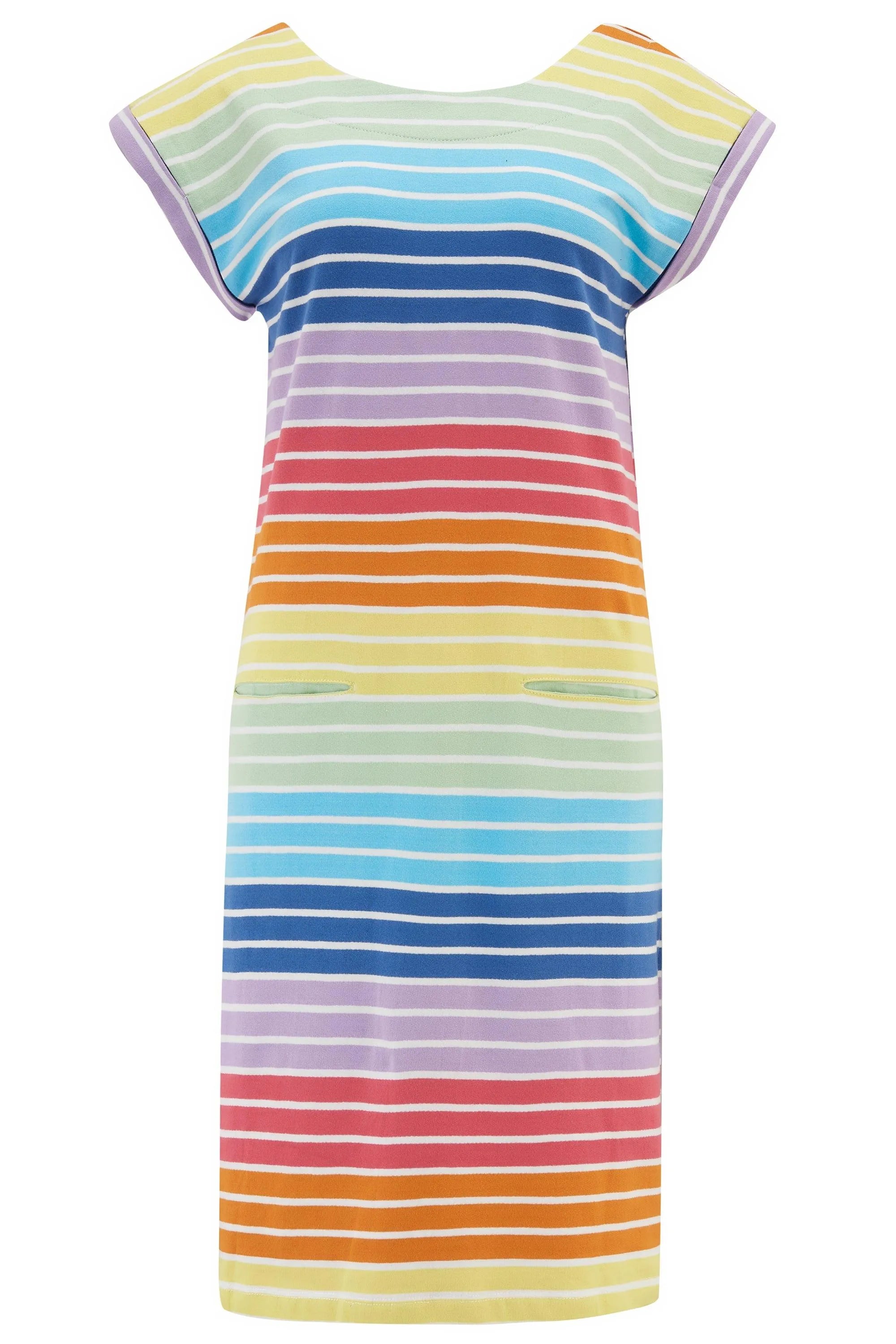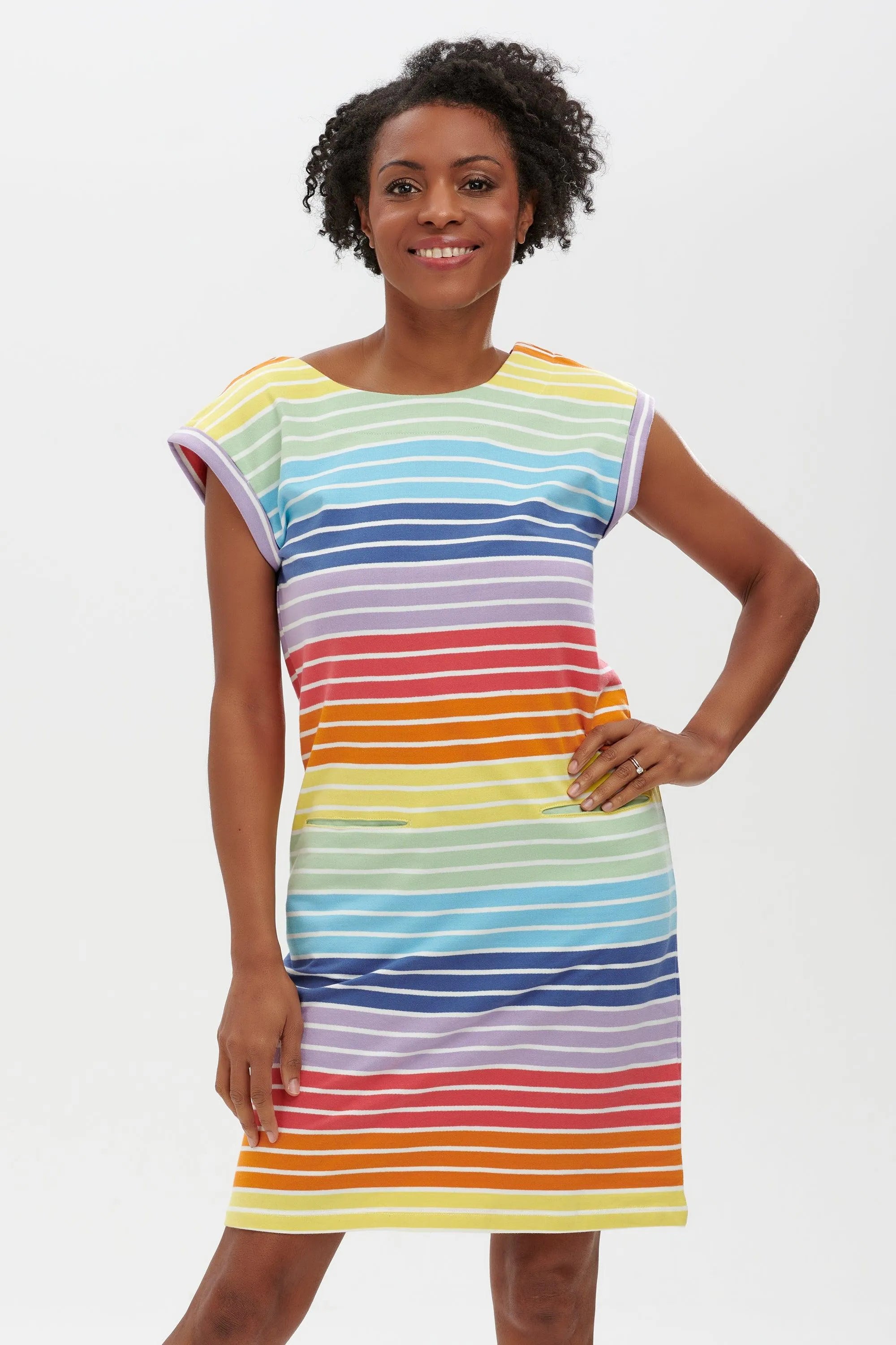 A casual tunic dress, made for summer days. Thicker and softer 100% organic flamed cotton cut. The Odette is finished with short sleeves with a hem, a V-neckline at the back and practical front pockets, perfect for showing off the fun multicolored dinosaur print on a dark navy base.