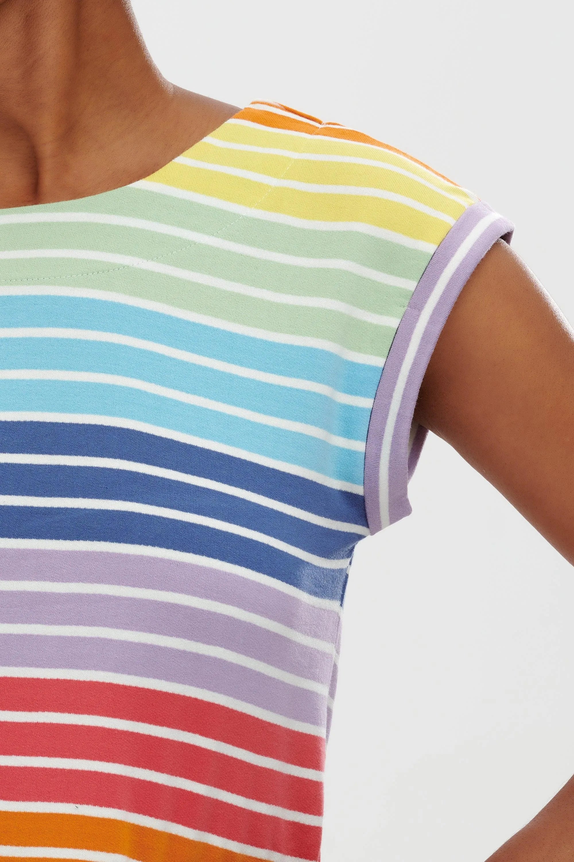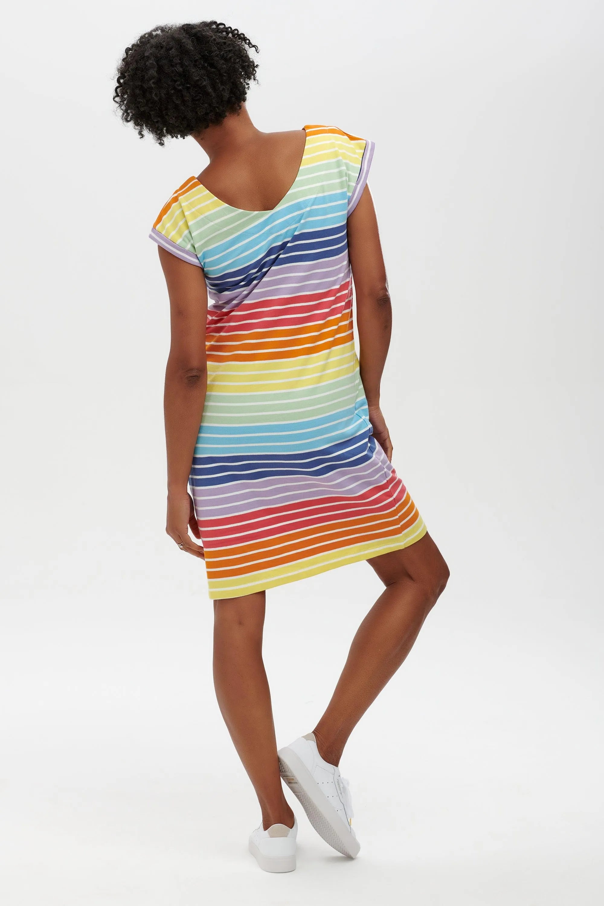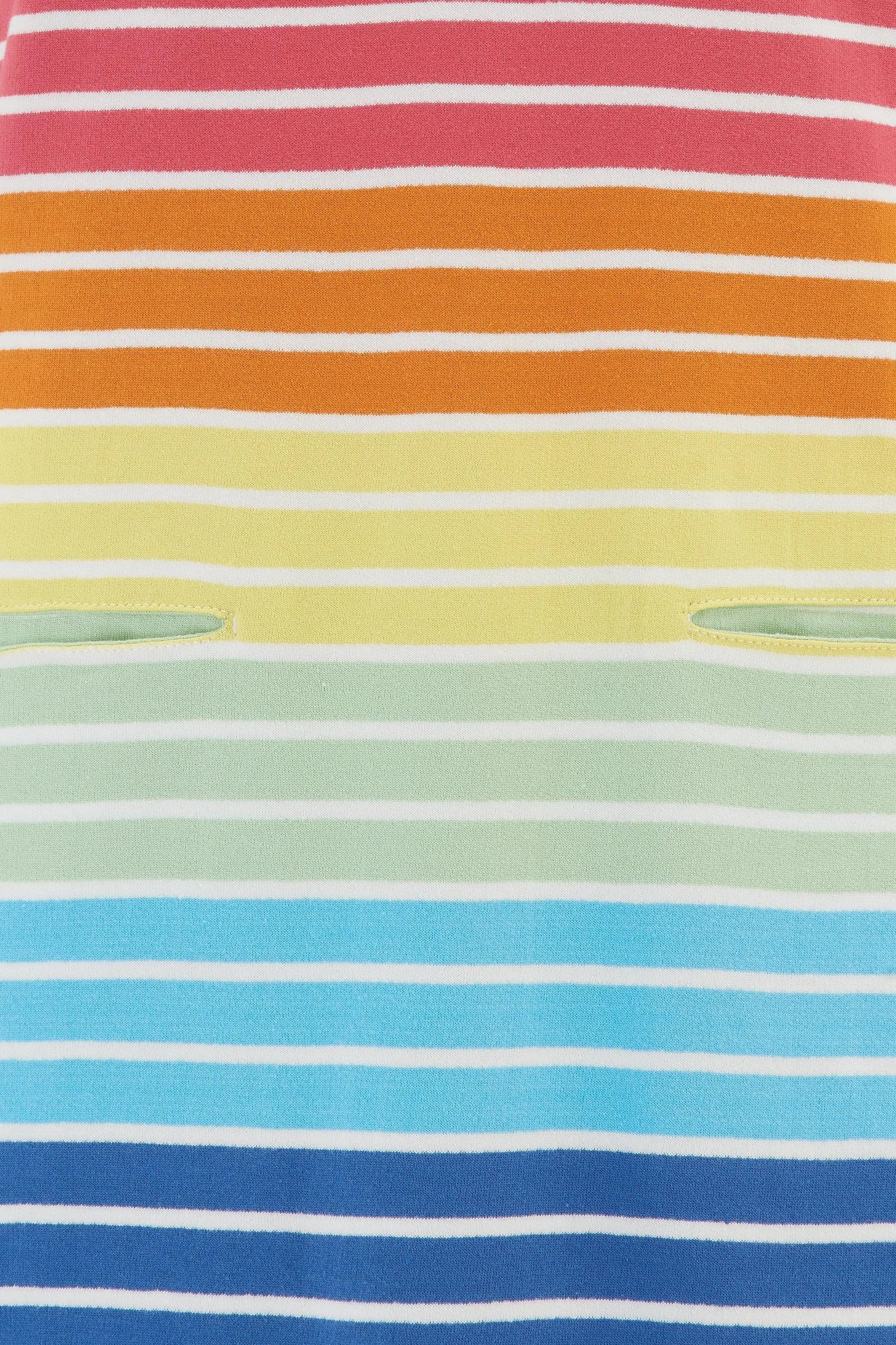 A casual tunic dress, made for summer days. Thicker and softer 100% organic flamed cotton cut. The Odette is finished with short sleeves with a hem, a V-neckline at the back and practical front pockets, perfect for showing off the fun multicolored dinosaur print on a dark navy base.