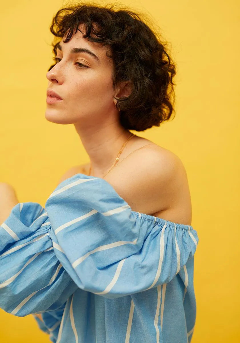 Straight dress in denim fabric printed with vertical stripes. Square neckline. Puffed French sleeve with rubber bands. Far over the knee. The model is wearing size S.