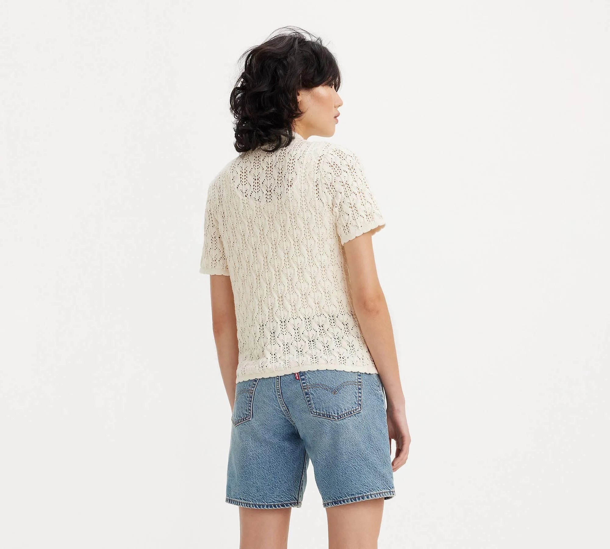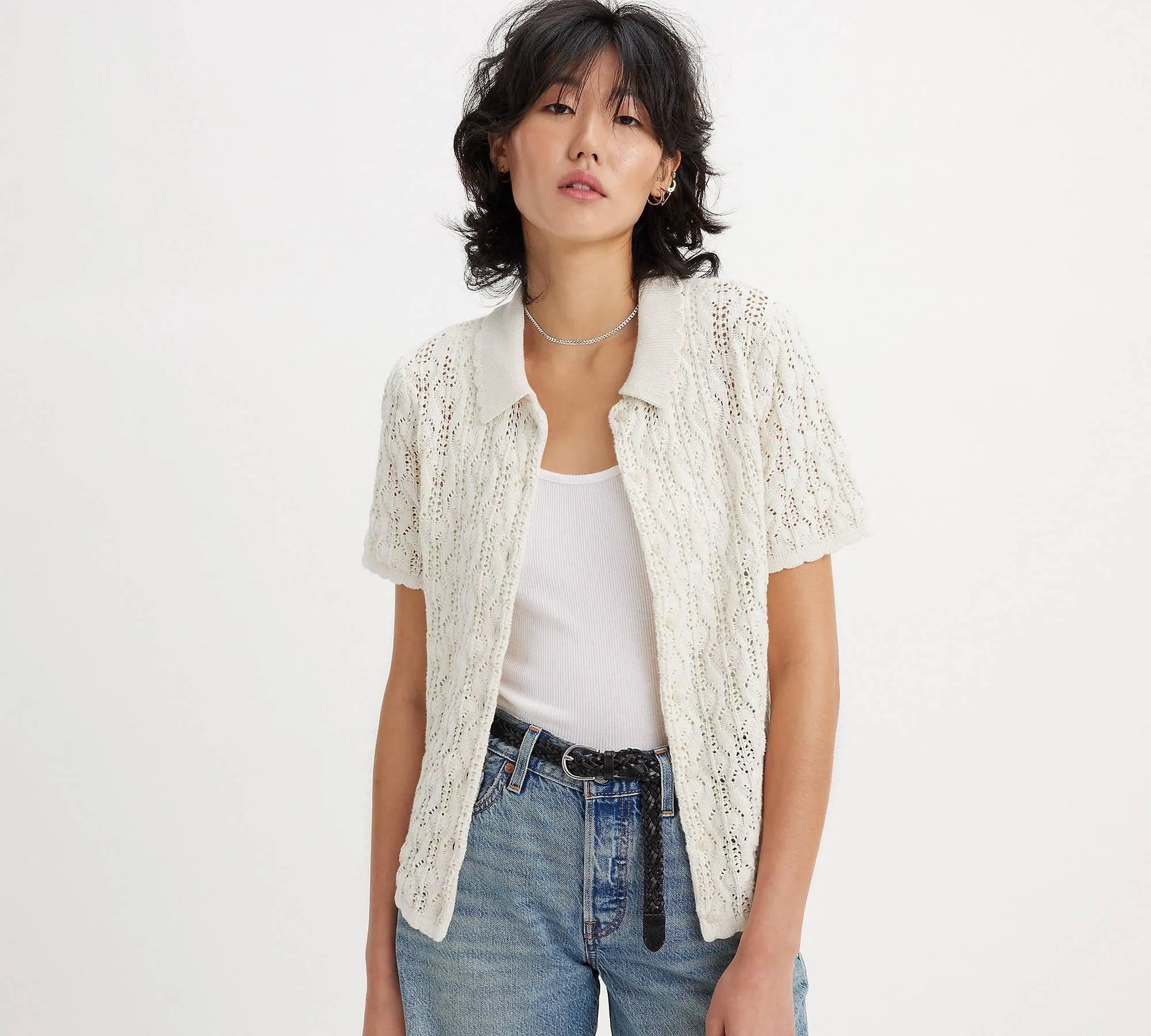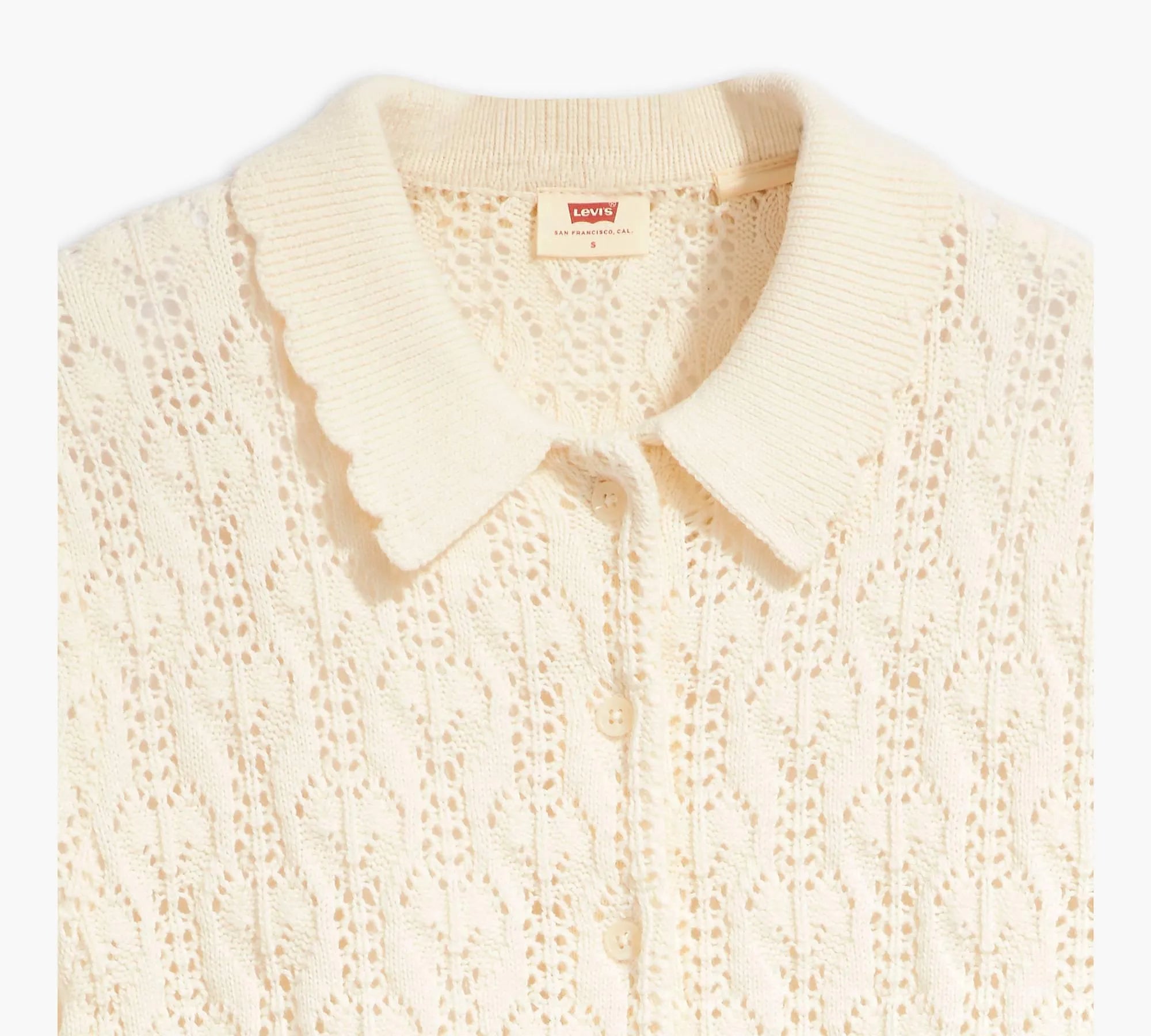 A comfortable short-sleeved sweater for hot nights. Designed with a classic collar, button front, scalloped edges and a very beachy style.