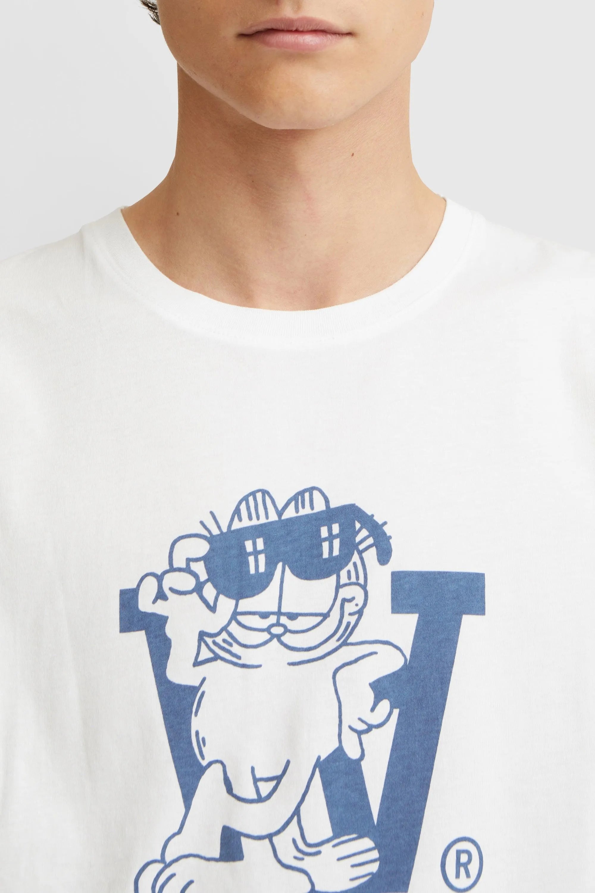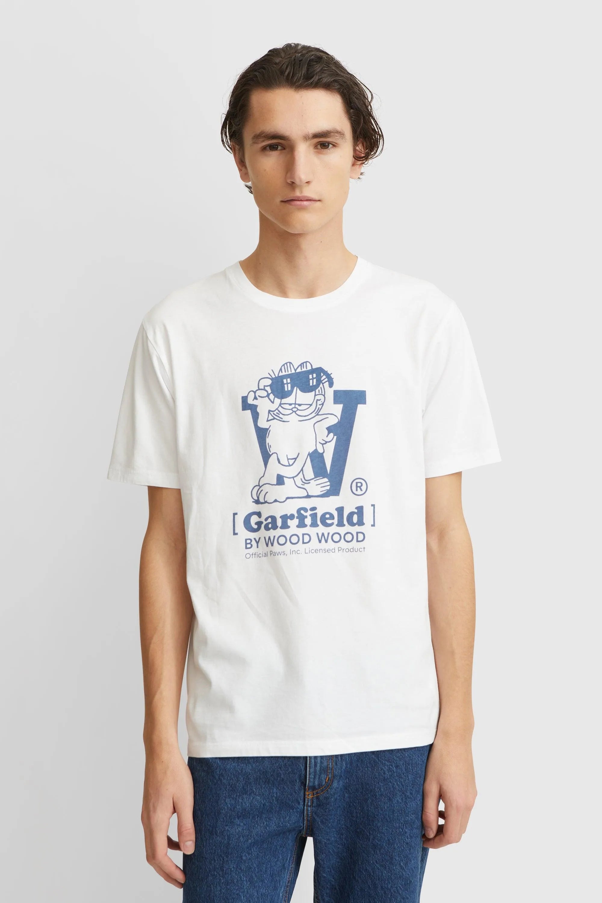 Made from 100% organic cotton, the Ace Crew Neck T-Shirt features a graphic illustrated by Wood Wood co-founder Brian SS Jensen. In a striking blue colorway, Garfield is featured leaning against the iconic Double A logo. Garfield by Wood Wood co-branded features underneath.