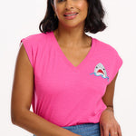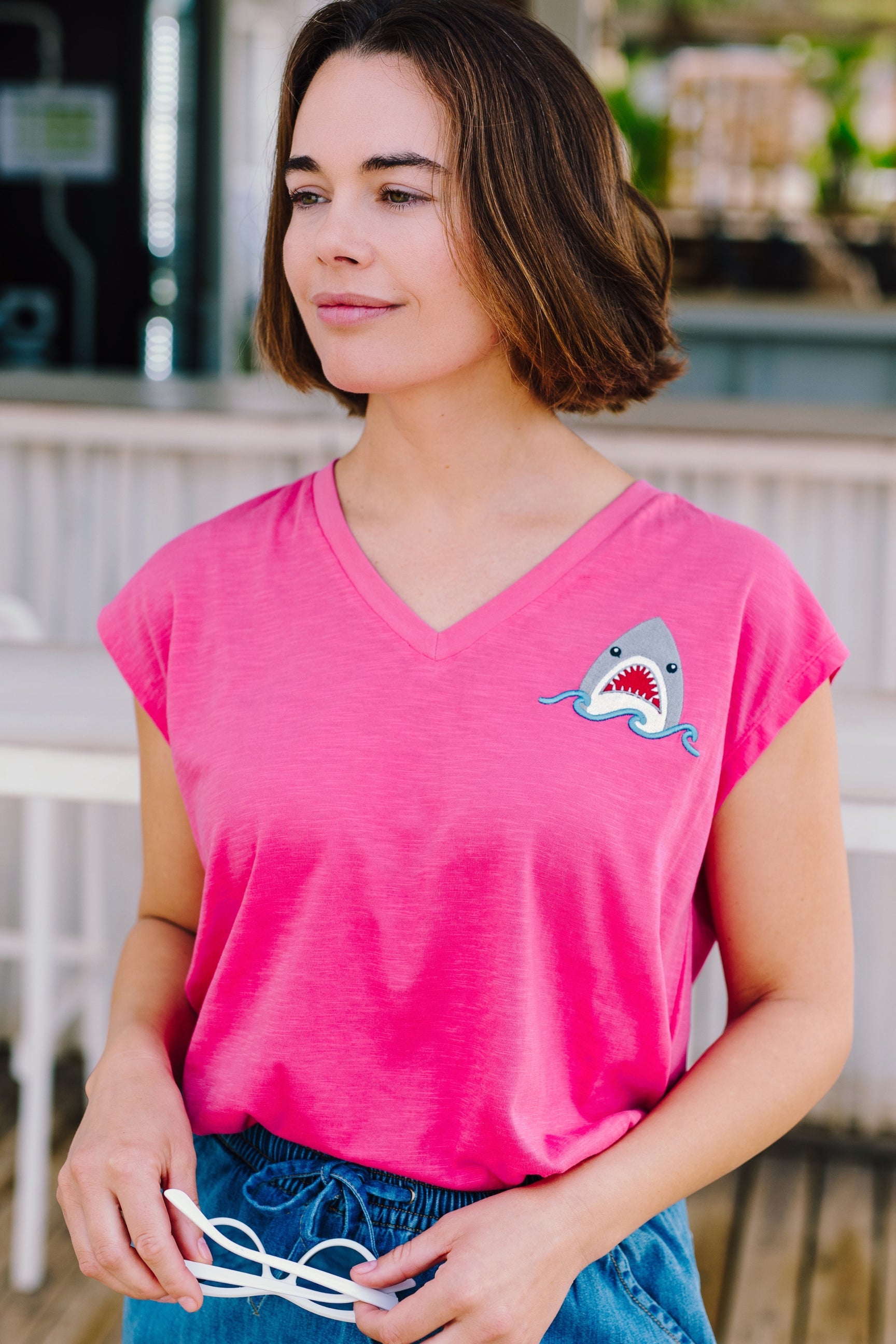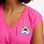 The Ariana is a V-neck version of the Chrissy tee, made from soft 100% organic cotton. It features a relaxed fit with dropped sleeves and a fun embroidered shark detail.