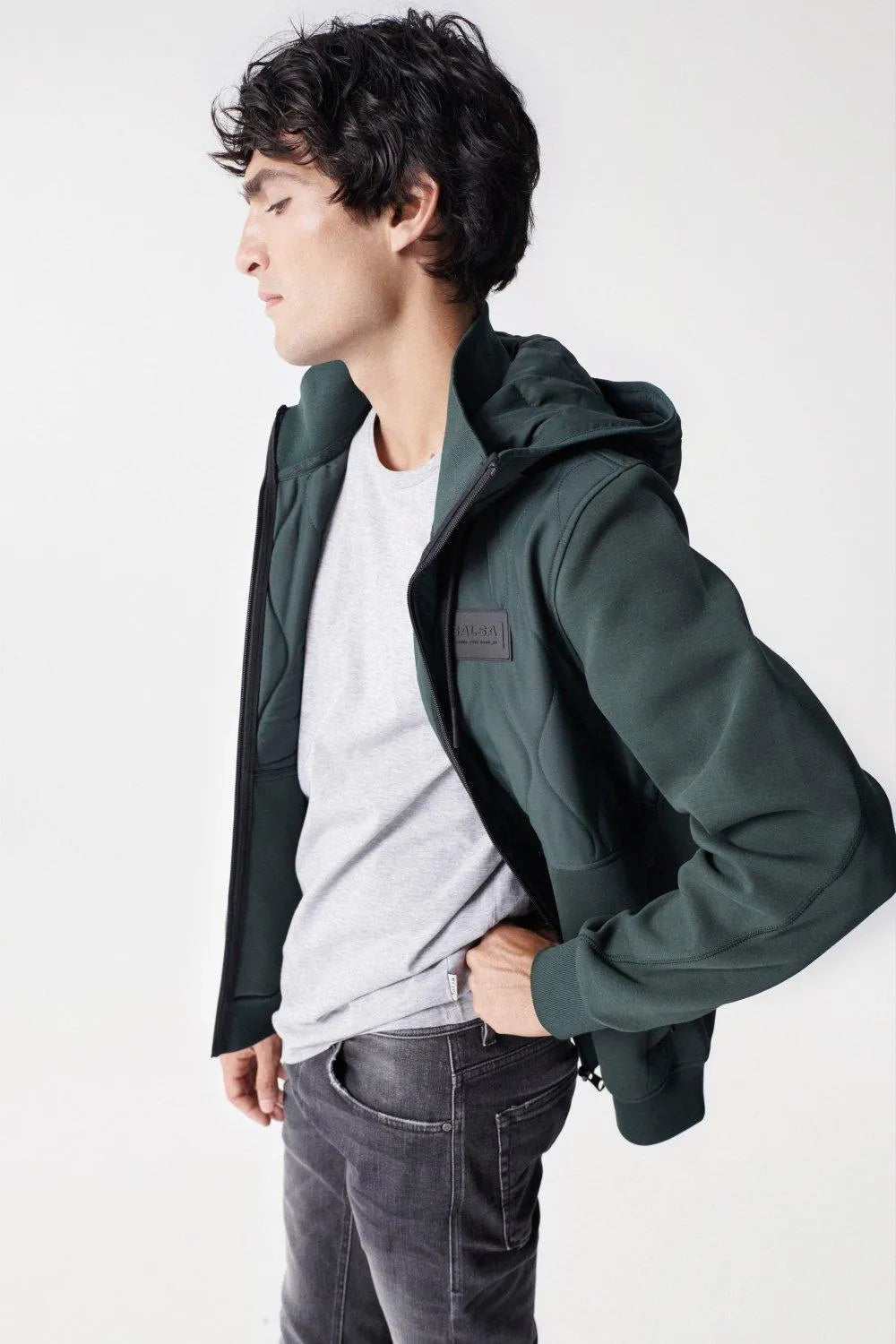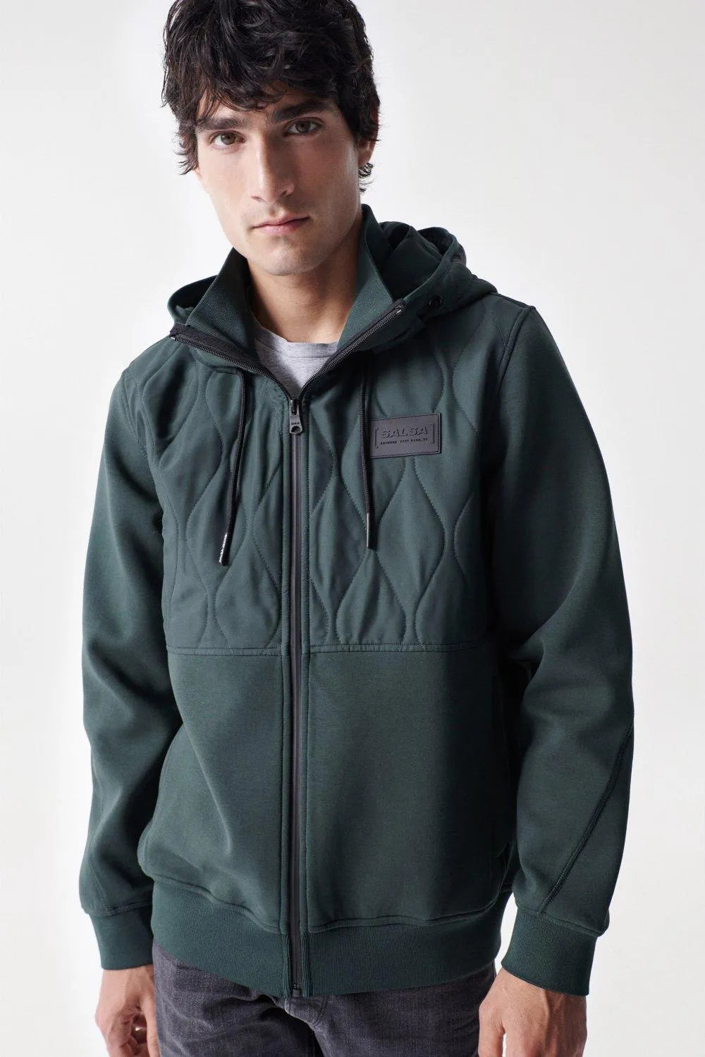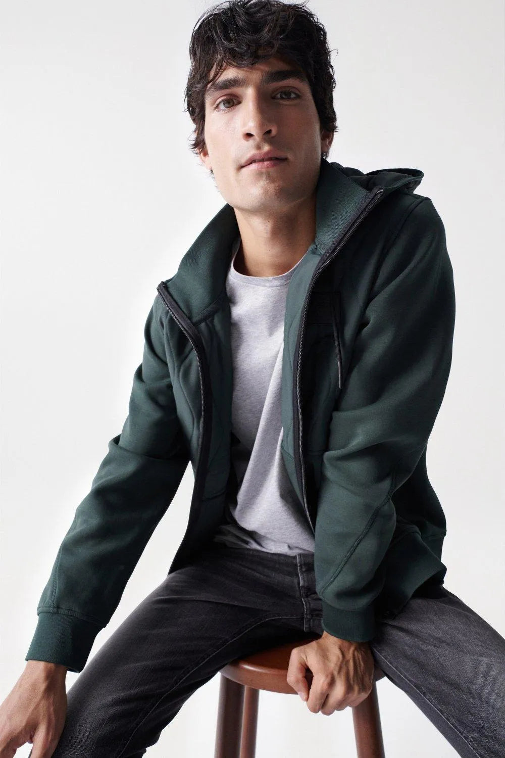 Hooded fleece jacket. Green color. regular fit Long sleeves with cuffs. Zipper. Two side pockets. Padded hood and top.