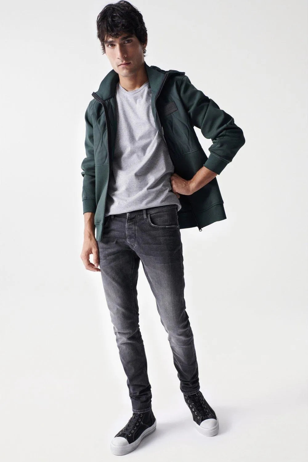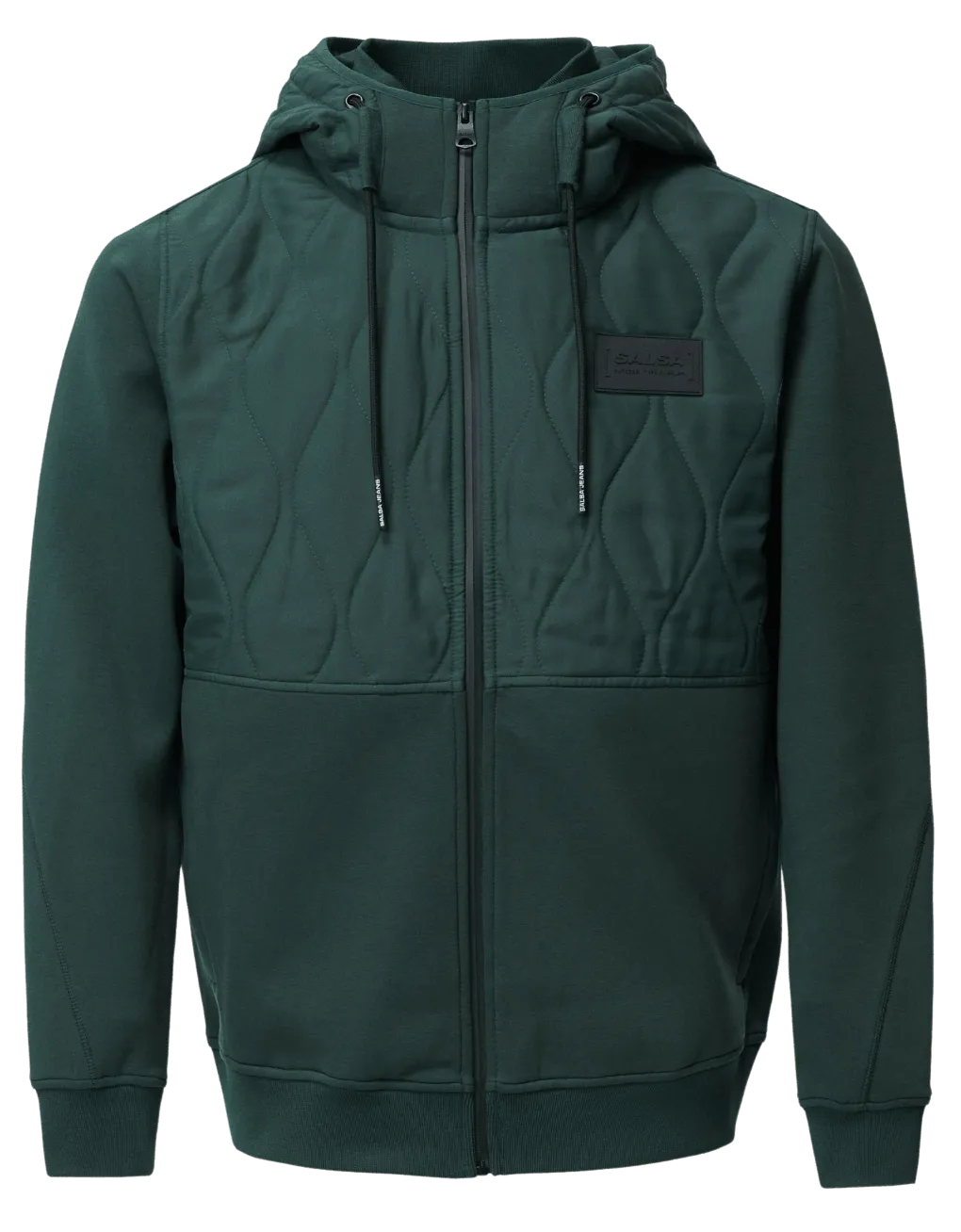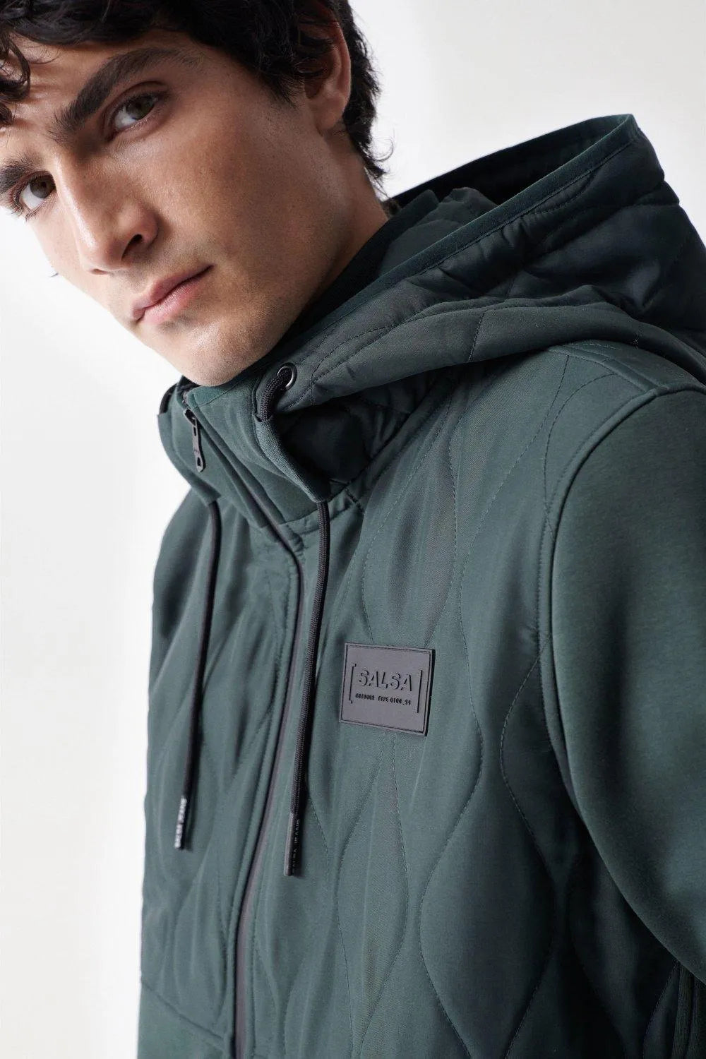 Hooded fleece jacket. Green color. regular fit Long sleeves with cuffs. Zipper. Two side pockets. Padded hood and top.