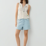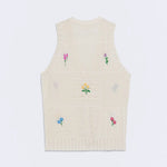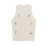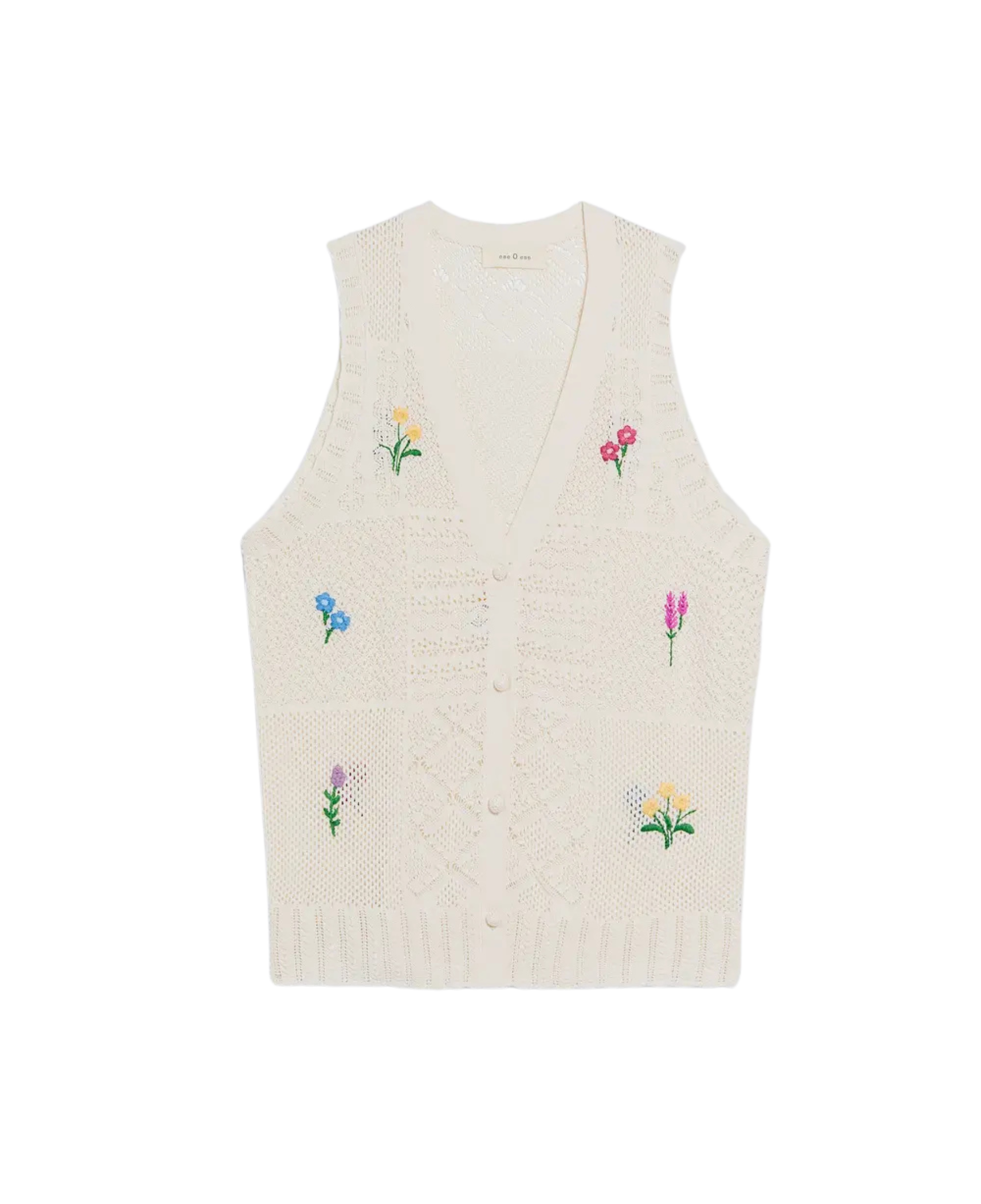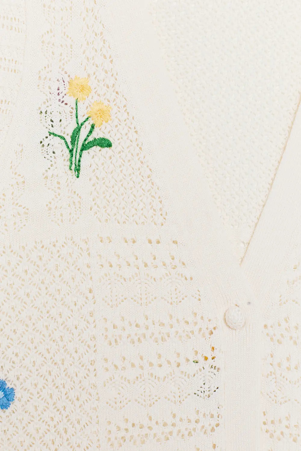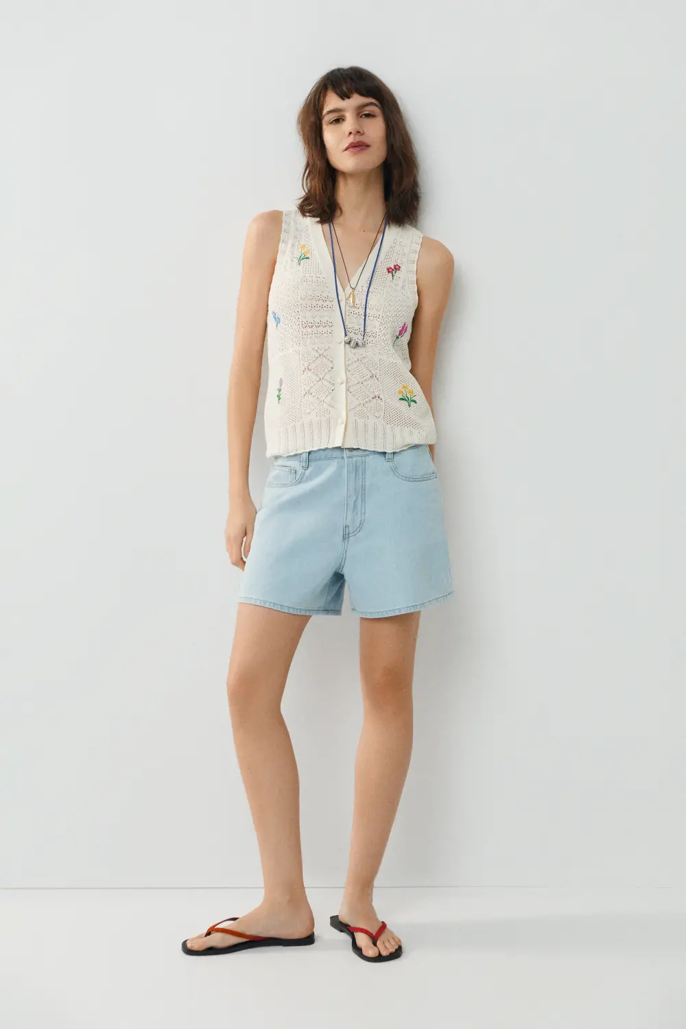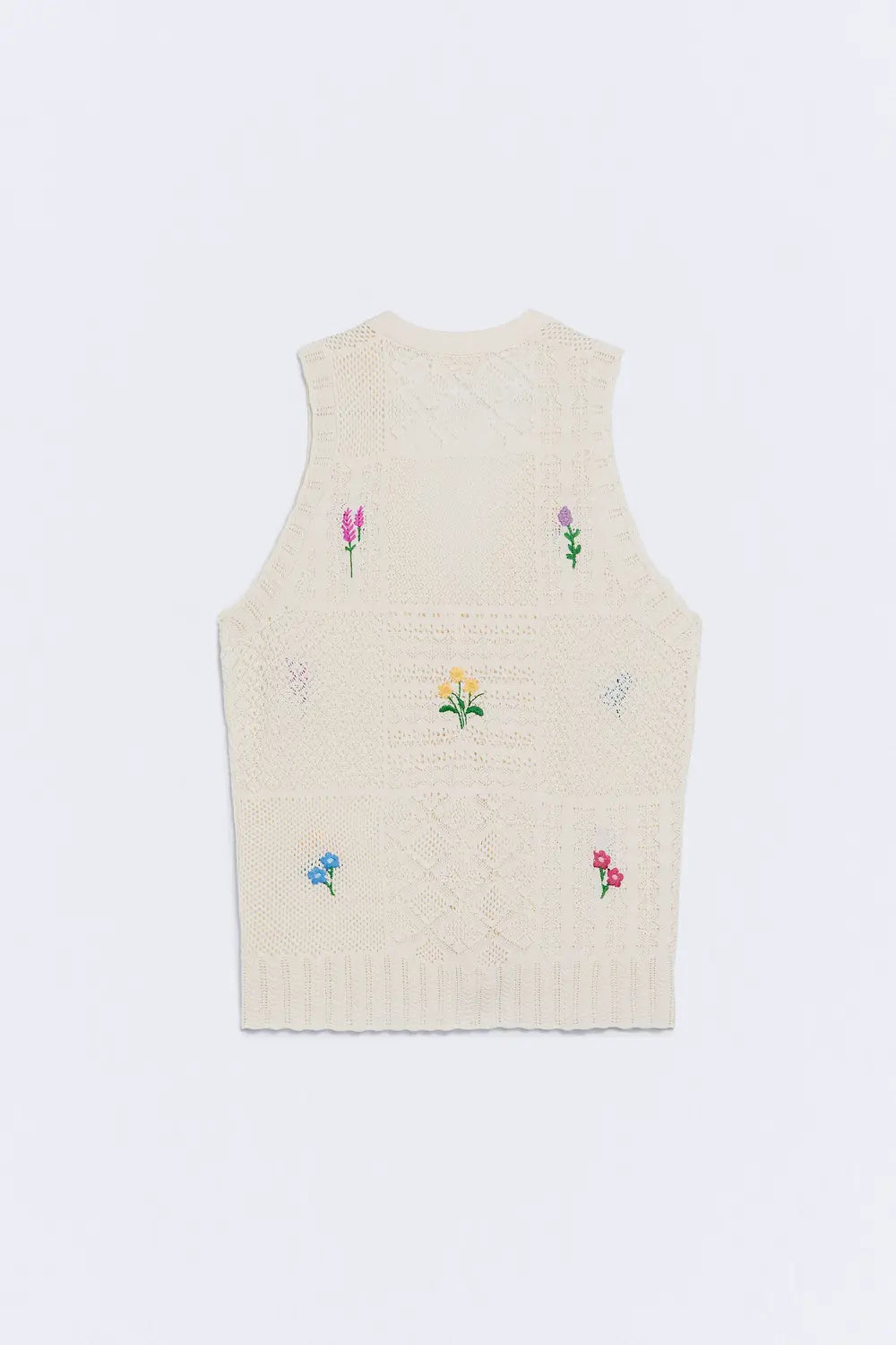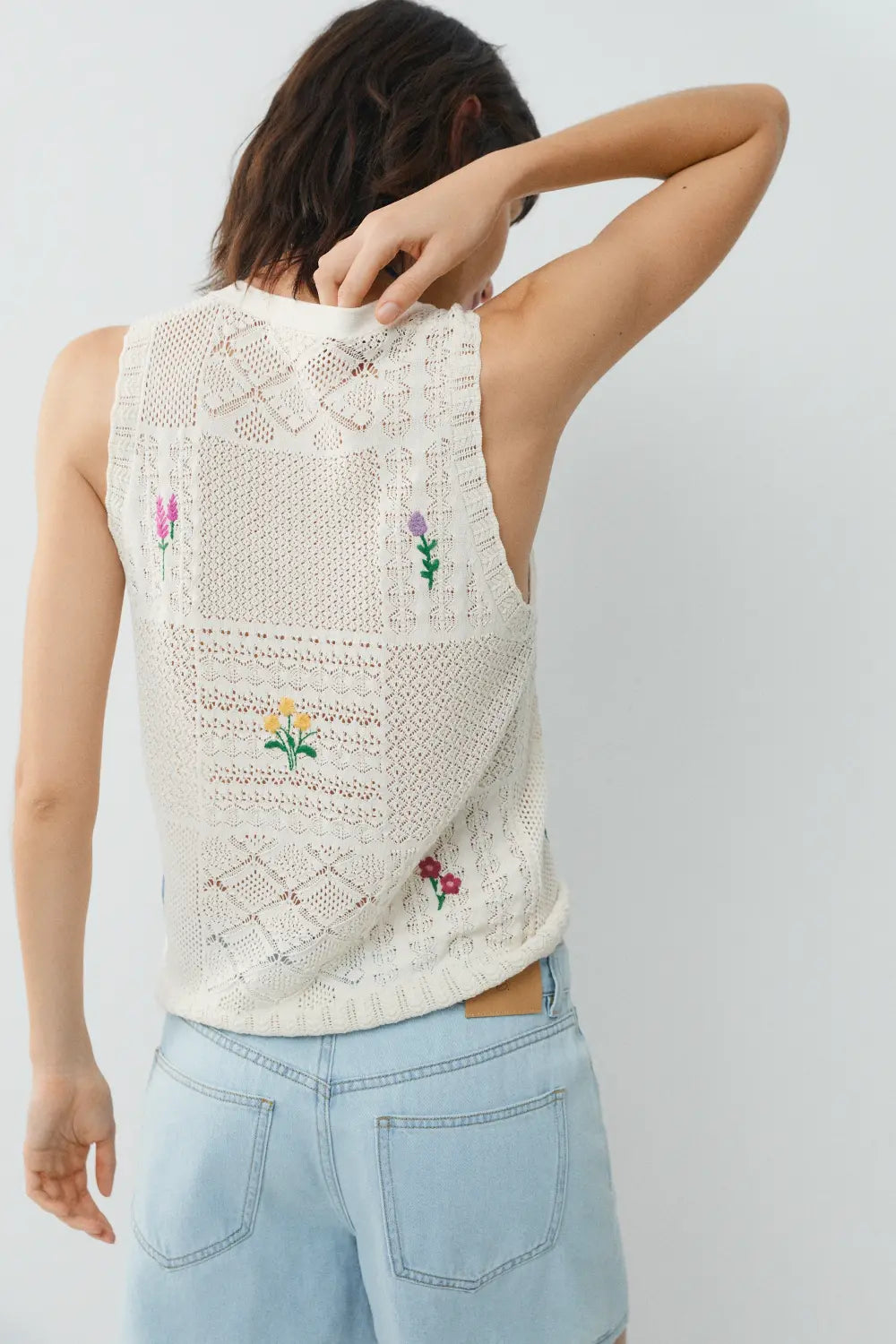 Fine knit openwork vest with a patchwork structure. BCI cotton and modal blend. Floral embroidered details. V-neckline. Sleeveless. Button closure. Straight fit. Garment length for size S: 53.5 cm.