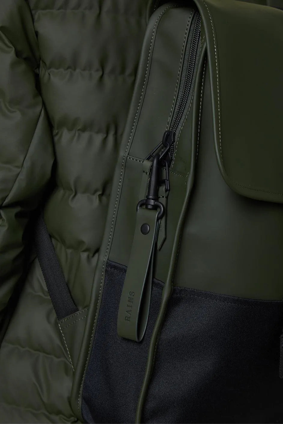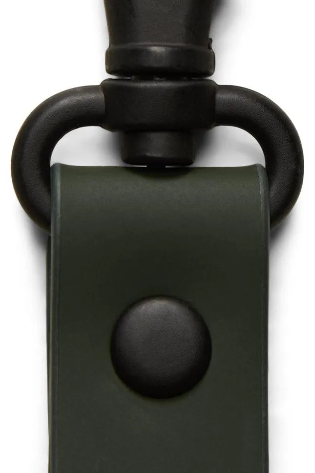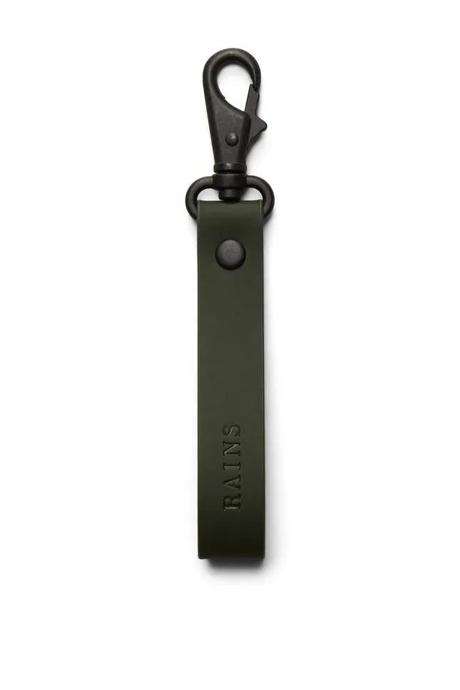 The keychain is made from Rains exclusive durable, waterproof PU coated material. The minimalist design features a small engraved logo and a large lobster clasp with Rains's signature to hold keys or clip to a bag.