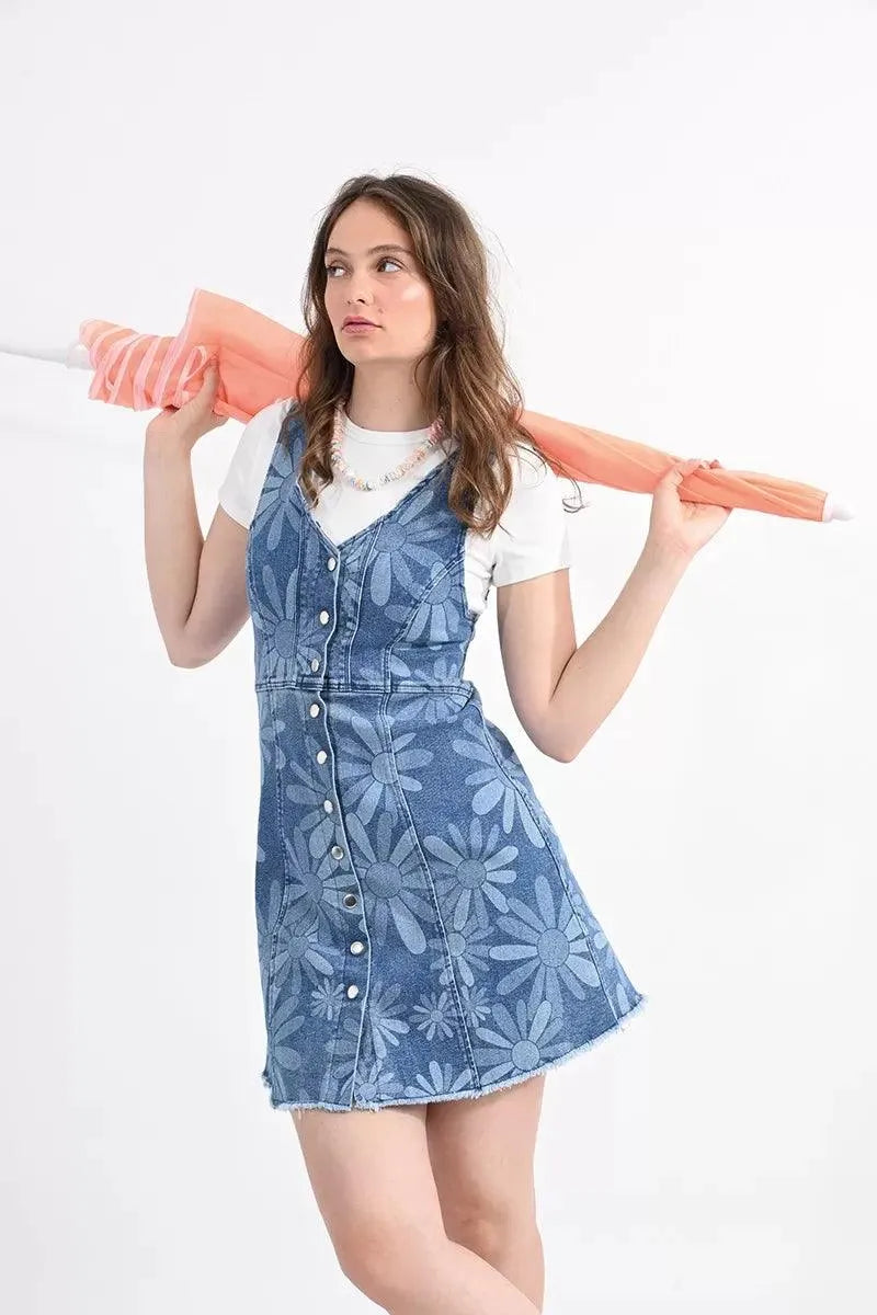 Short, sleeveless denim dress with a wide V neckline. Tight waist model, with floral print and front button closure.