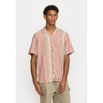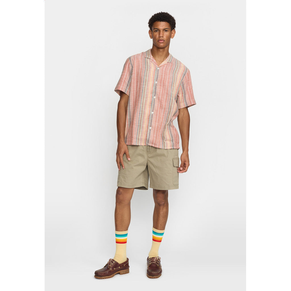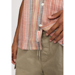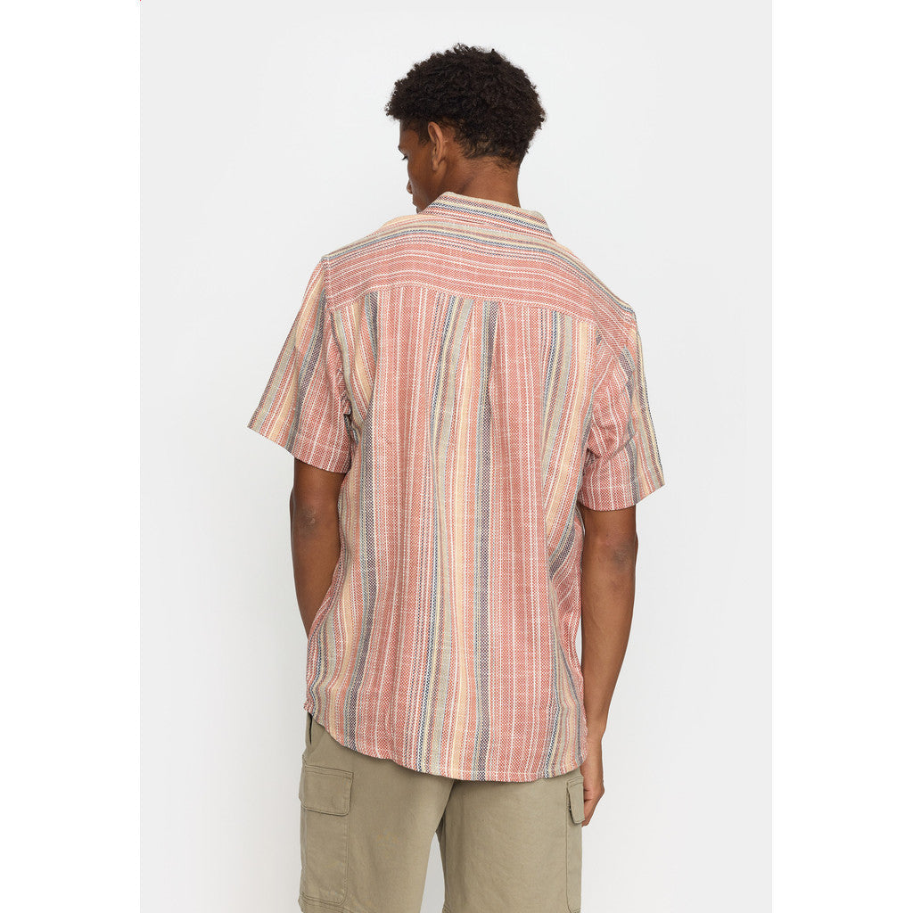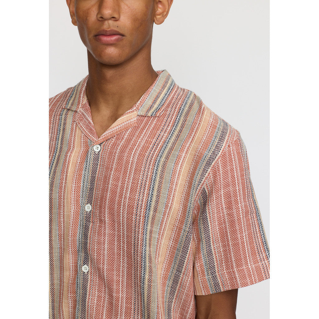 This short-sleeved Cuban shirt is crafted from lightweight, yarn-dyed organic cotton. Yarn-dyed fabric is created by pre-dying the yarns before weaving, ensuring greater colorfastness and durability. The faded vertical stripe pattern combined with the white threads in the fabric gives the shirt a vintage feel. Details like the white 4-hole buttons on the button-down front, combined with the Cuban collar, give the shirt a beautiful finish. The back is designed with a traditional double-layered yoke with a pleat for added comfort.