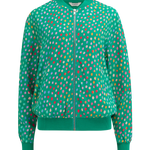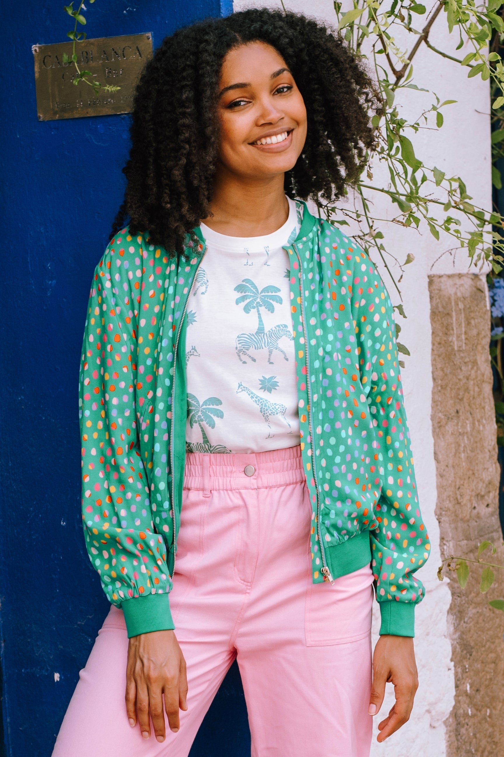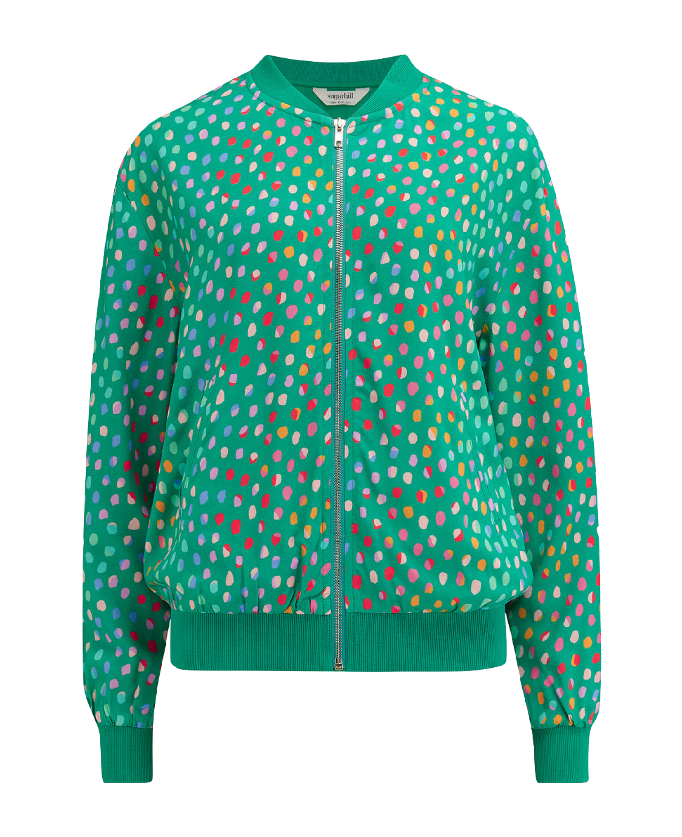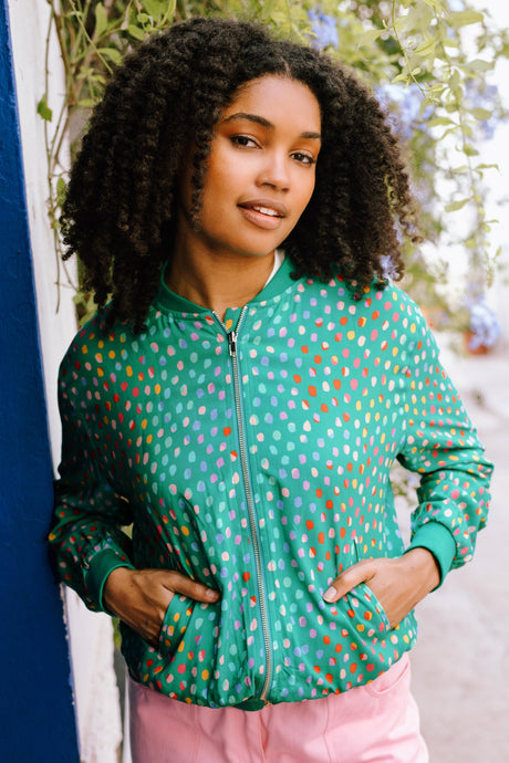 The Bobbi is Sugarhill's new style this season, with a relaxed fit, zip closure, and pockets. It features the new Rainbow Pebbles print of muted rainbow polka dots on a green base. This lightweight bomber jacket is ideal for layering and looks great with jeans.
