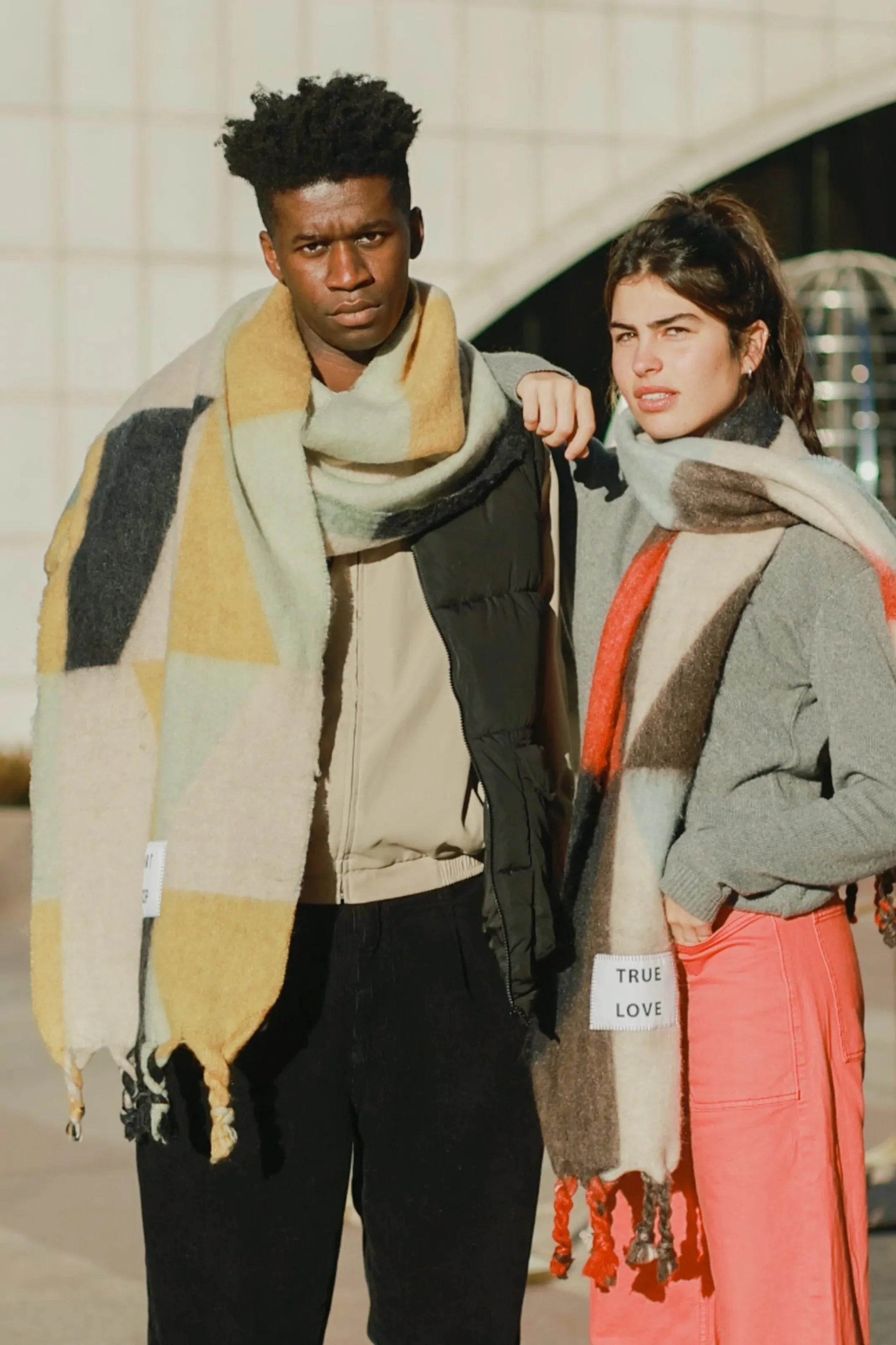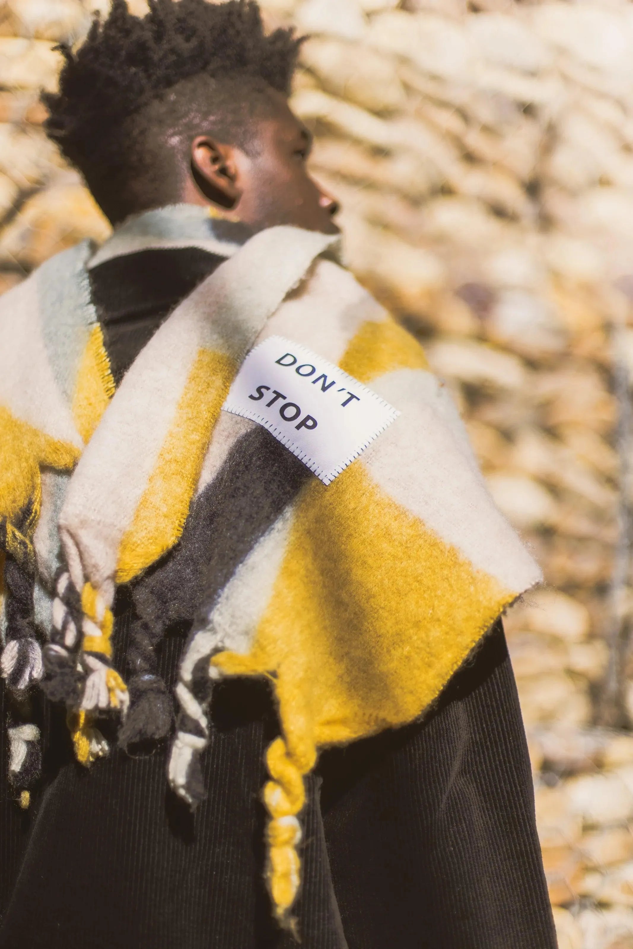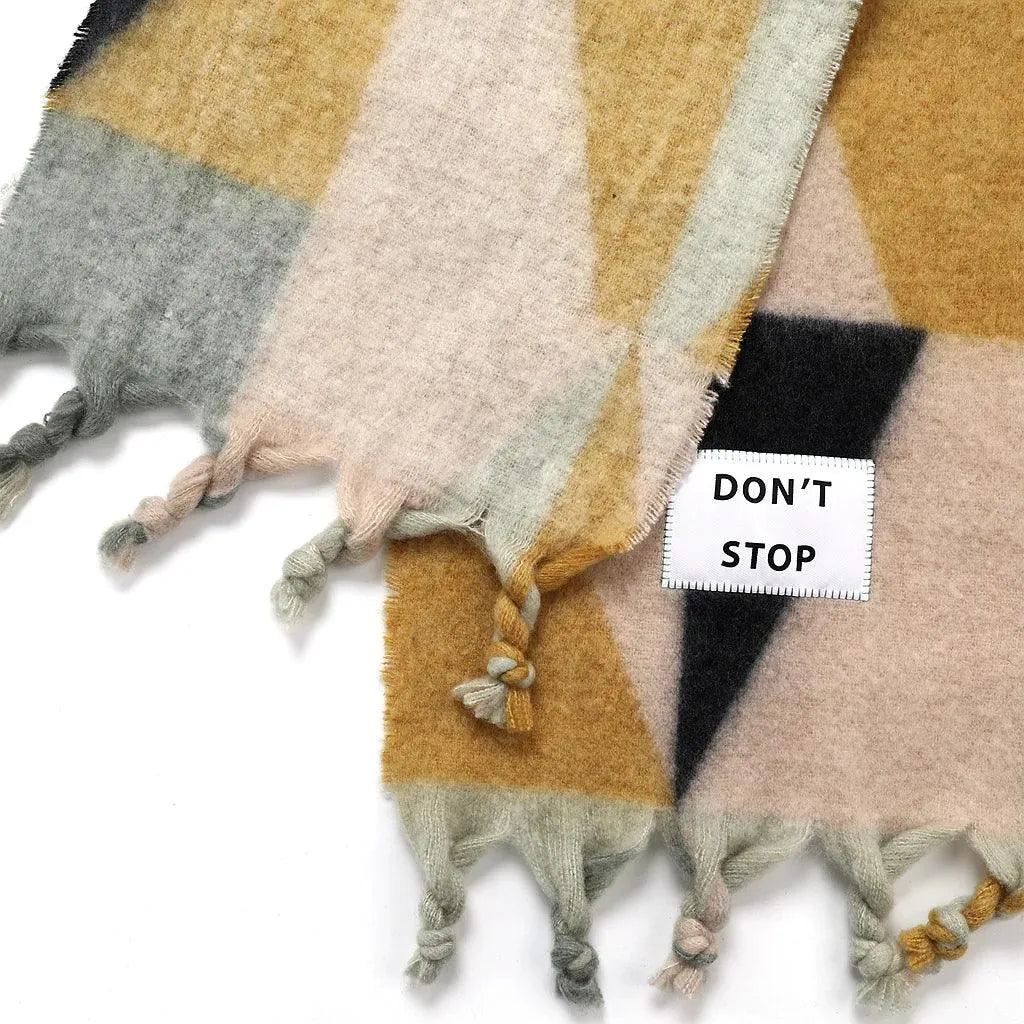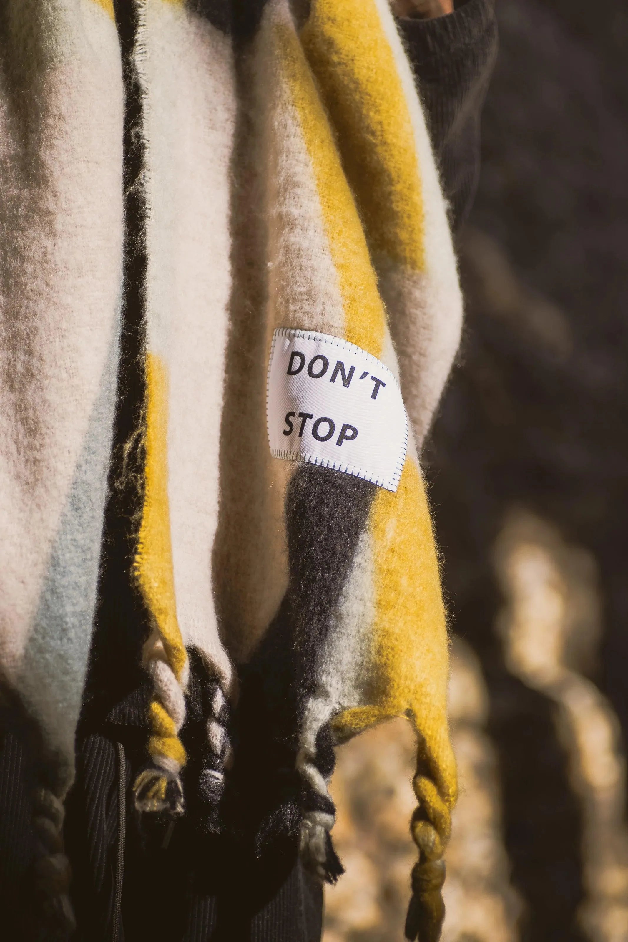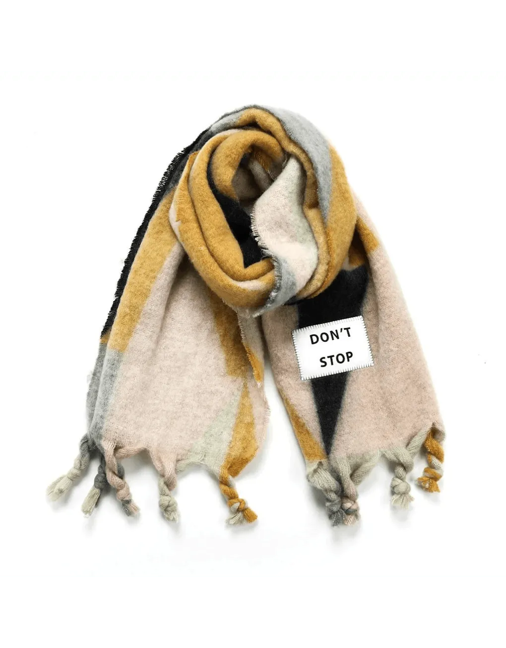 Maxi multicolored scarf with a patch that includes a phrase or motto.