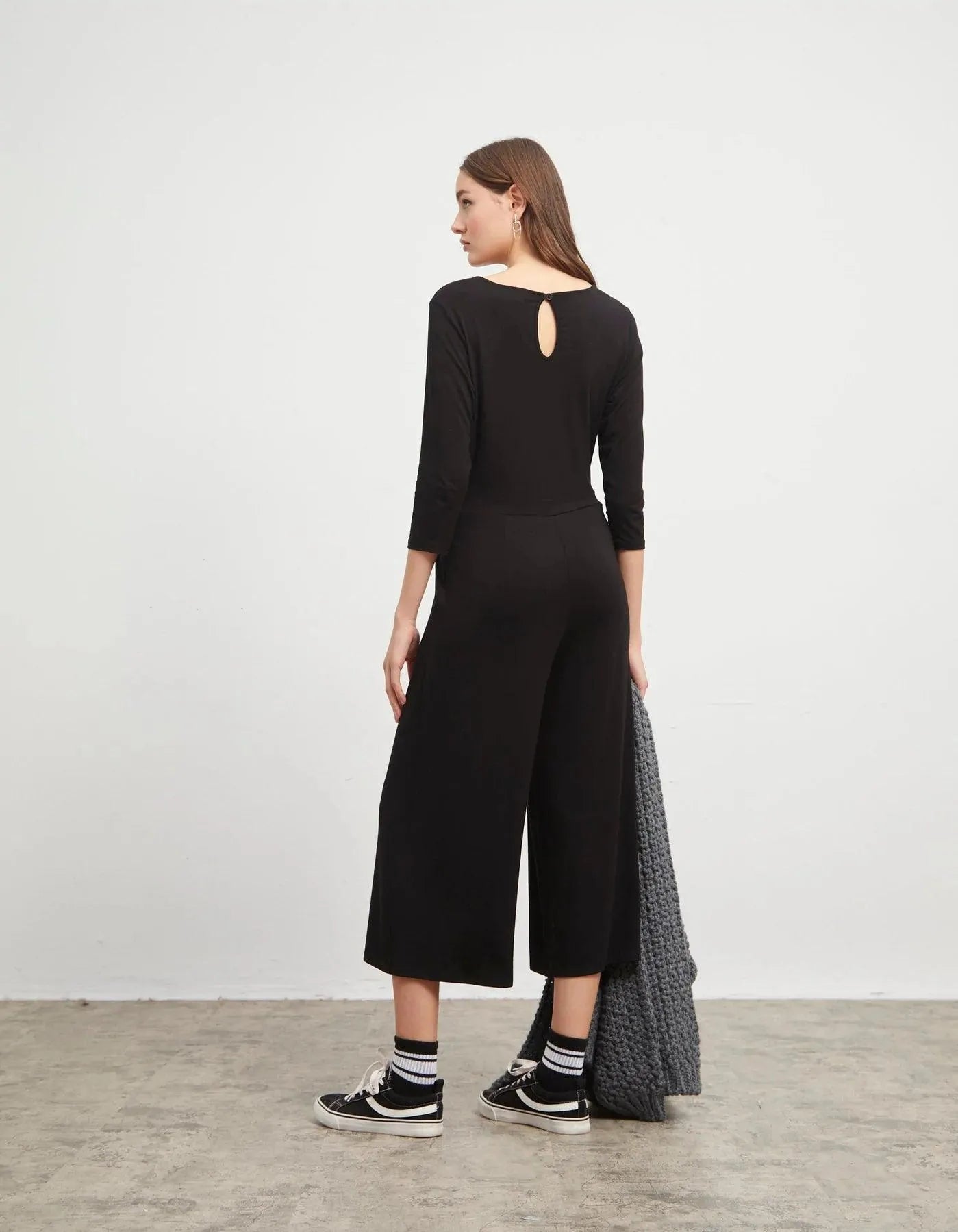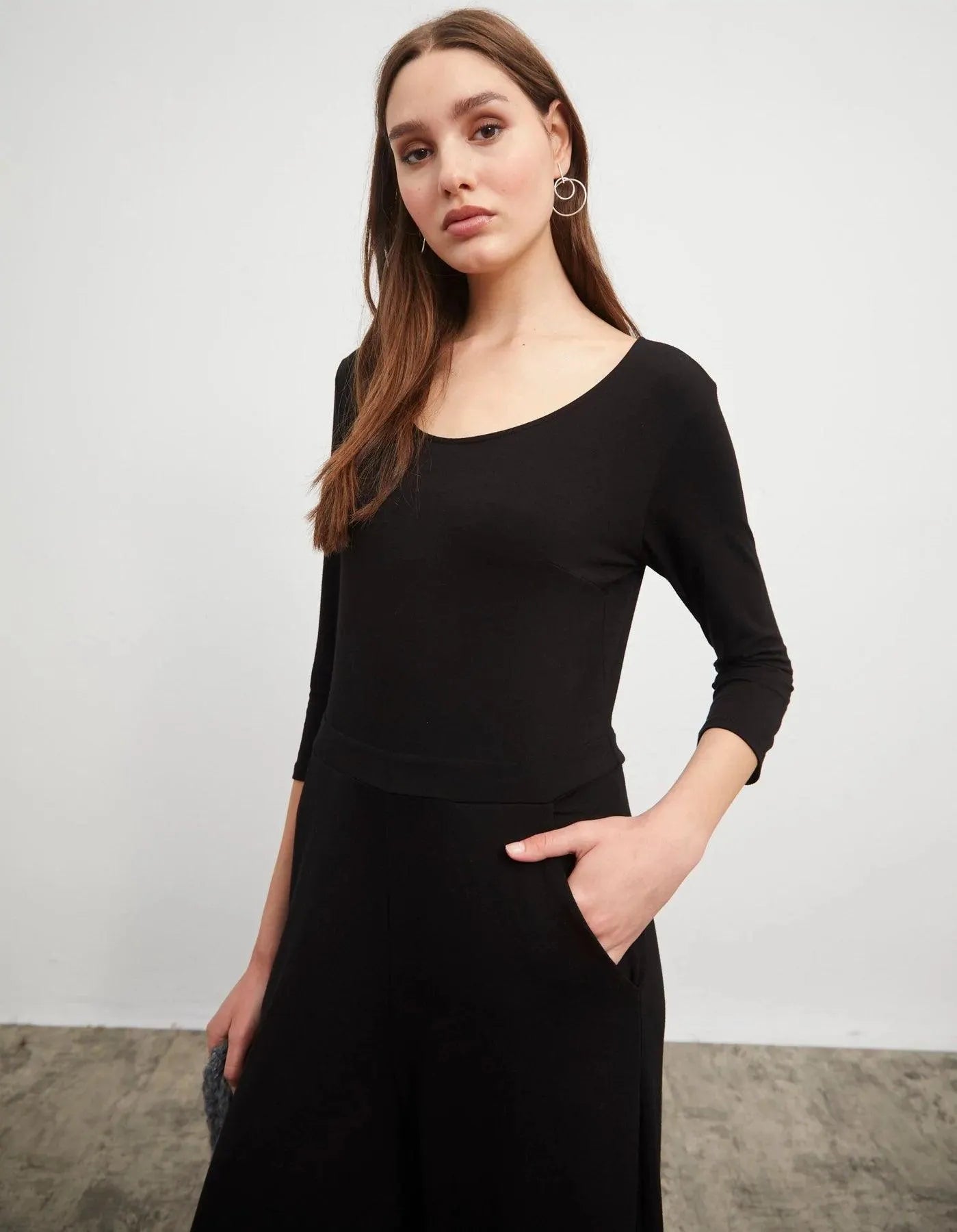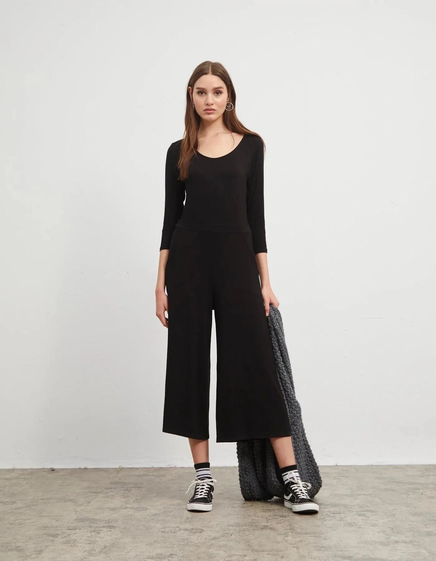 Long black jumpsuit. 3/4 sleeve and pockets. Composition: Viscose 95% Elastane 5%.