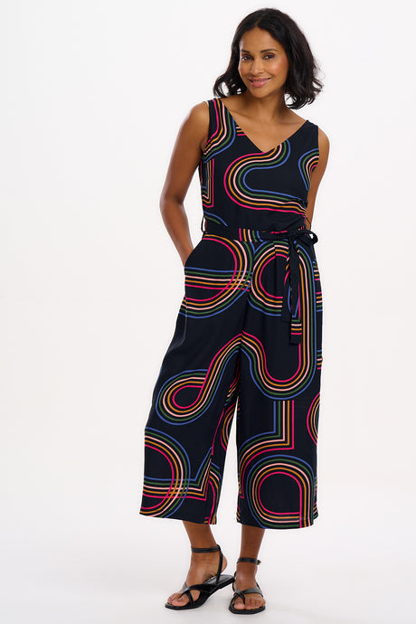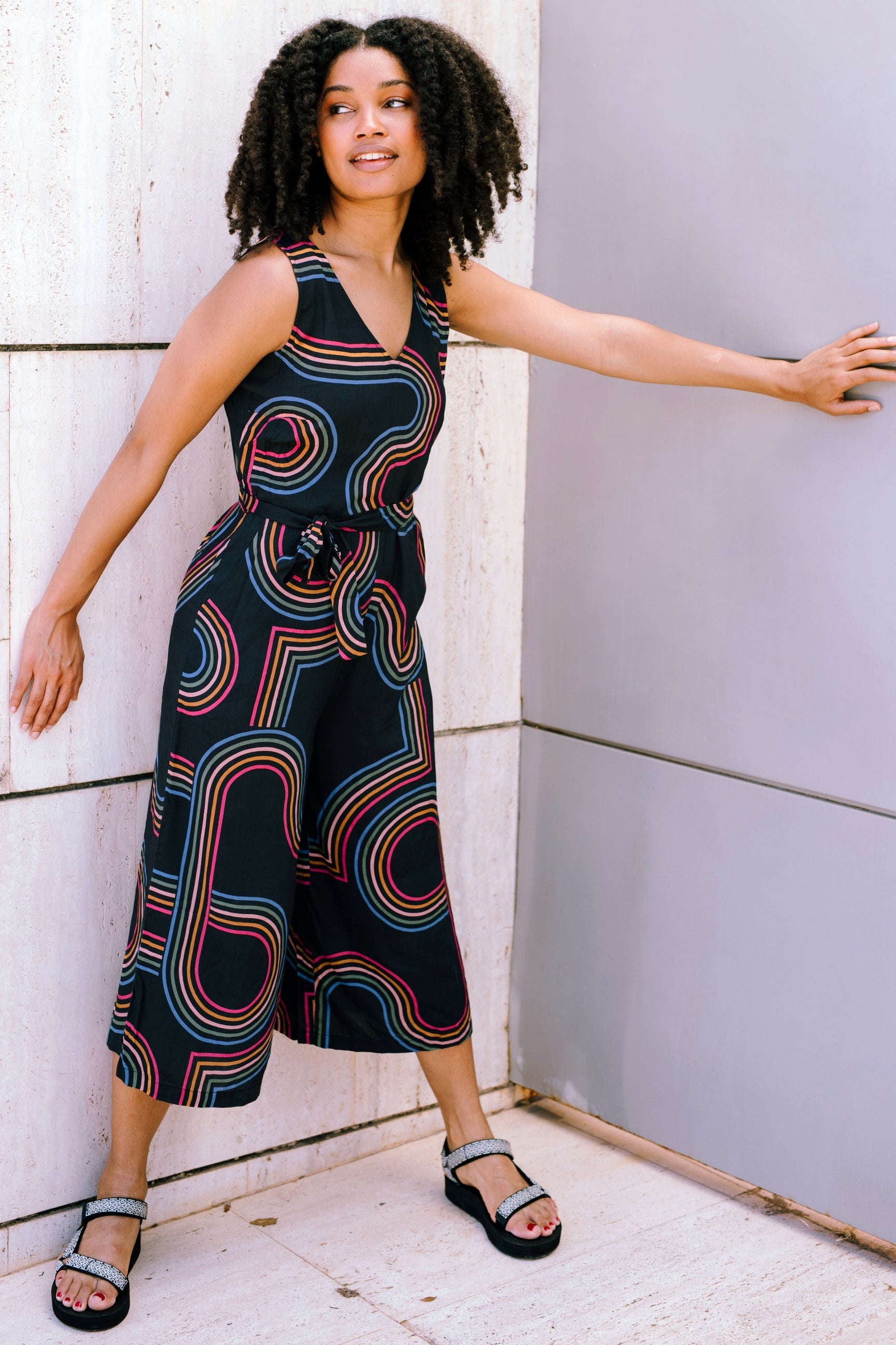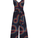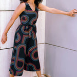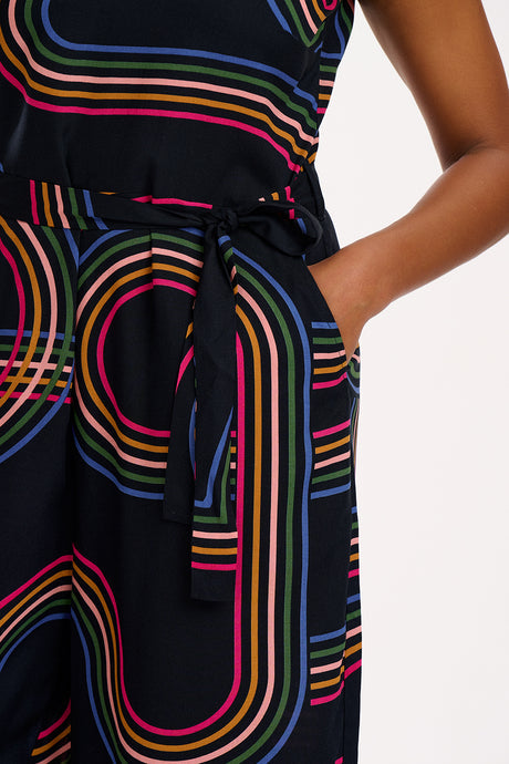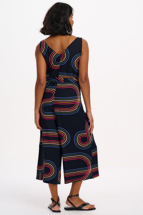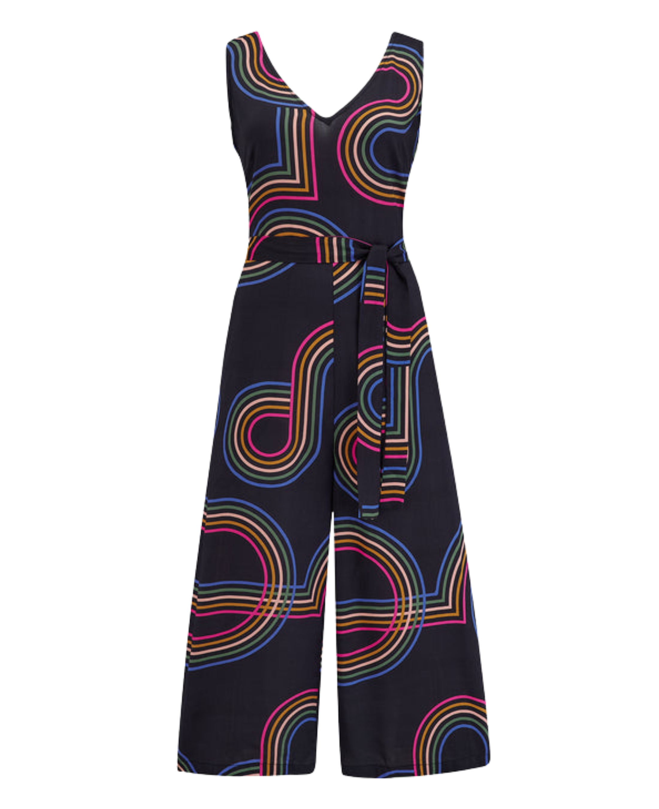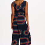 Introducing a stylish sleeveless jumpsuit with a V-neckline at both the front and back. It features an elastic waistband complemented by a fabric belt for a perfect fit. The extra-wide legs provide a comfortable and flattering silhouette, making it a great choice for any occasion. Featuring the new Retro Racer print of 70s-inspired circular graphic lines on a classic black base.