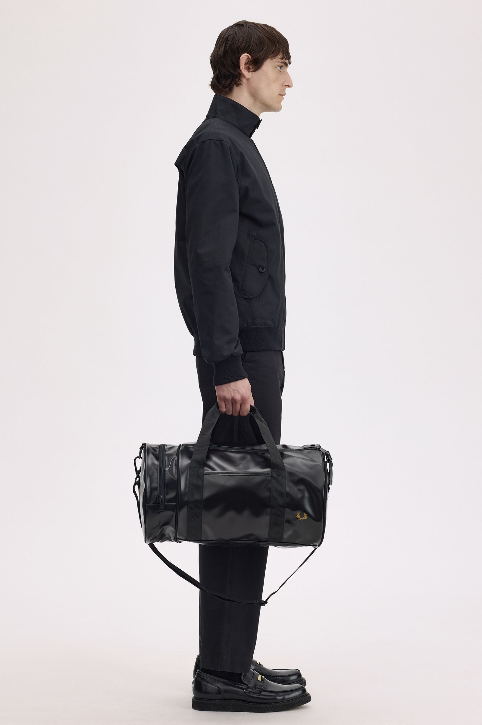 Esta bolsa, confeccionada de manera a garantizar que adquiera un aspecto desgastado con los años, conserva todas las características deportivas clásicas del diseño, como la abertura superior con cremallera doble y bolsillo redondo, las correas tejidas ajustables para llevarla cruzada y dos asas de mano. Además, luce un logotipo estampado dorado en ambos extremos y una corona de laurel repujada en tono dorado metalizado en el panel delantero, para reforzar su carácter inconfundiblemente Fred Perry.