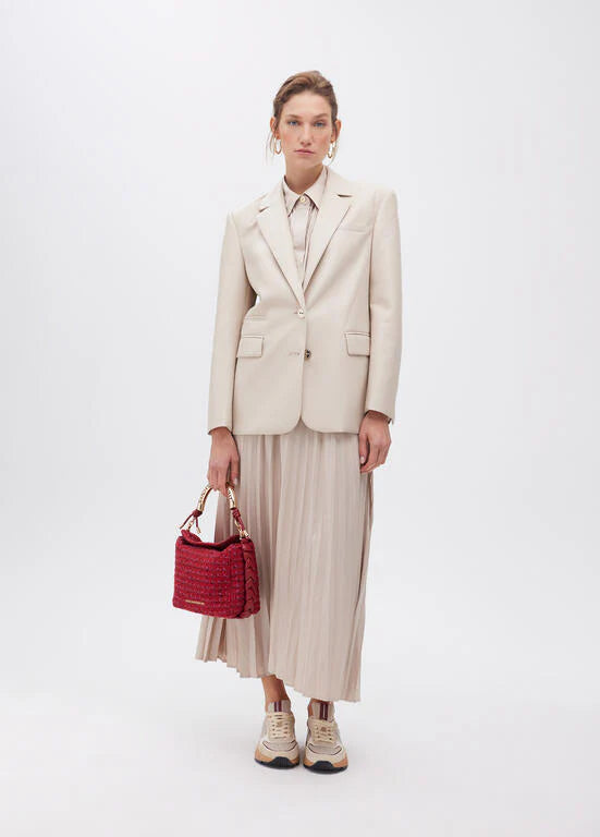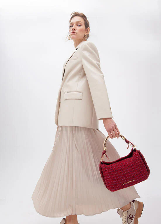 Esta bandolera roja de tejido tweed con asa metalizada personalizada de Lola Casademunt combina estilo y funcionalidad. Su diseño exclusivo aporta un toque sofisticado a cualquier look, mientras que el asa metalizada garantiza comodidad y durabilidad. Perfecta para quienes buscan un accesorio único que resalte su elegancia en cualquier ocasión.