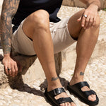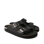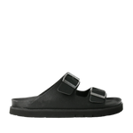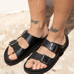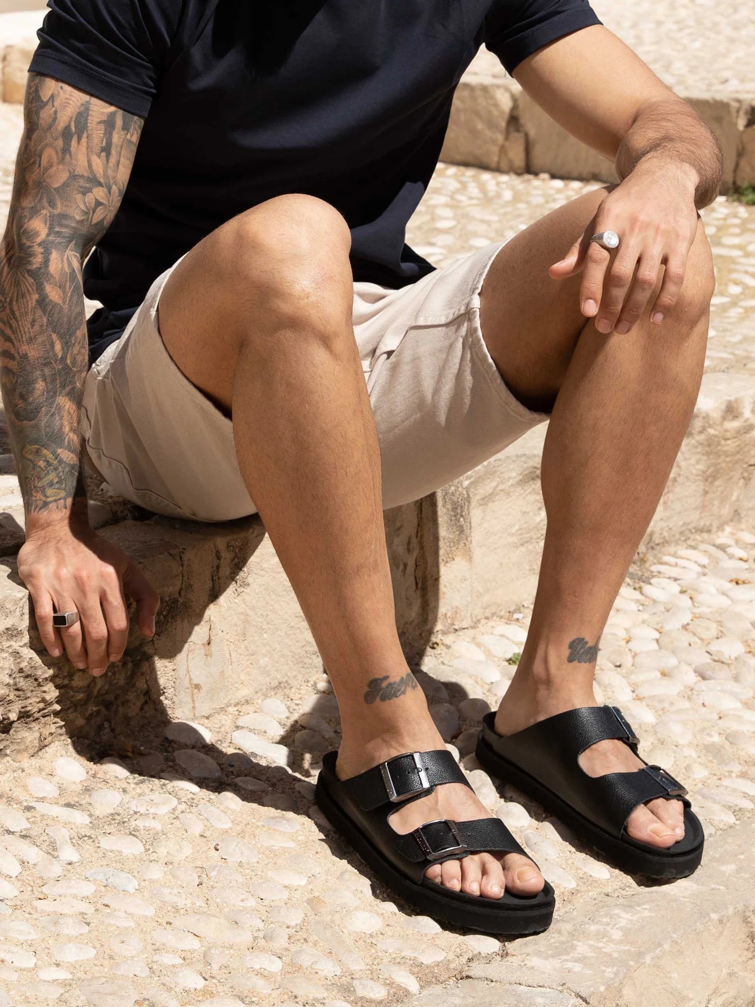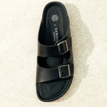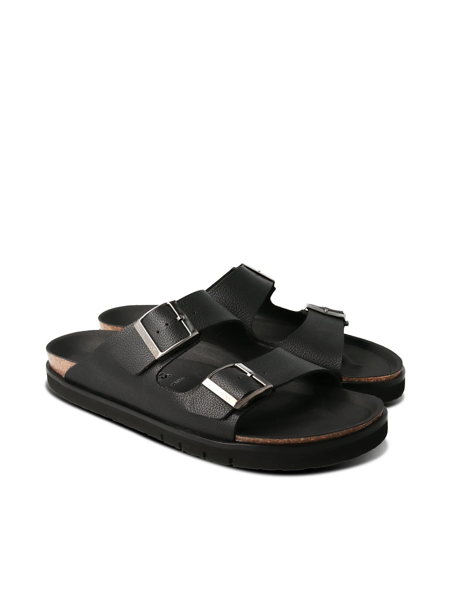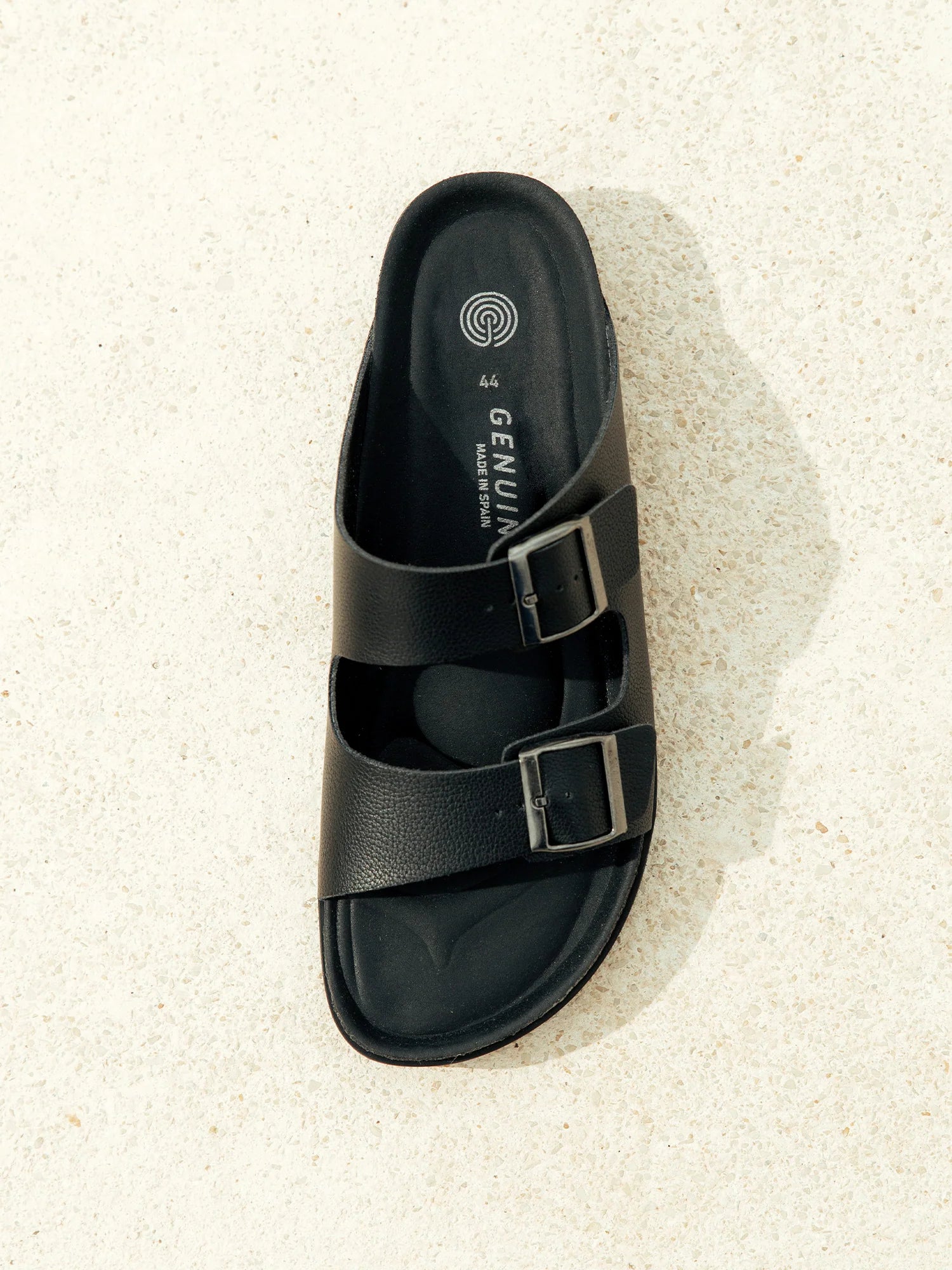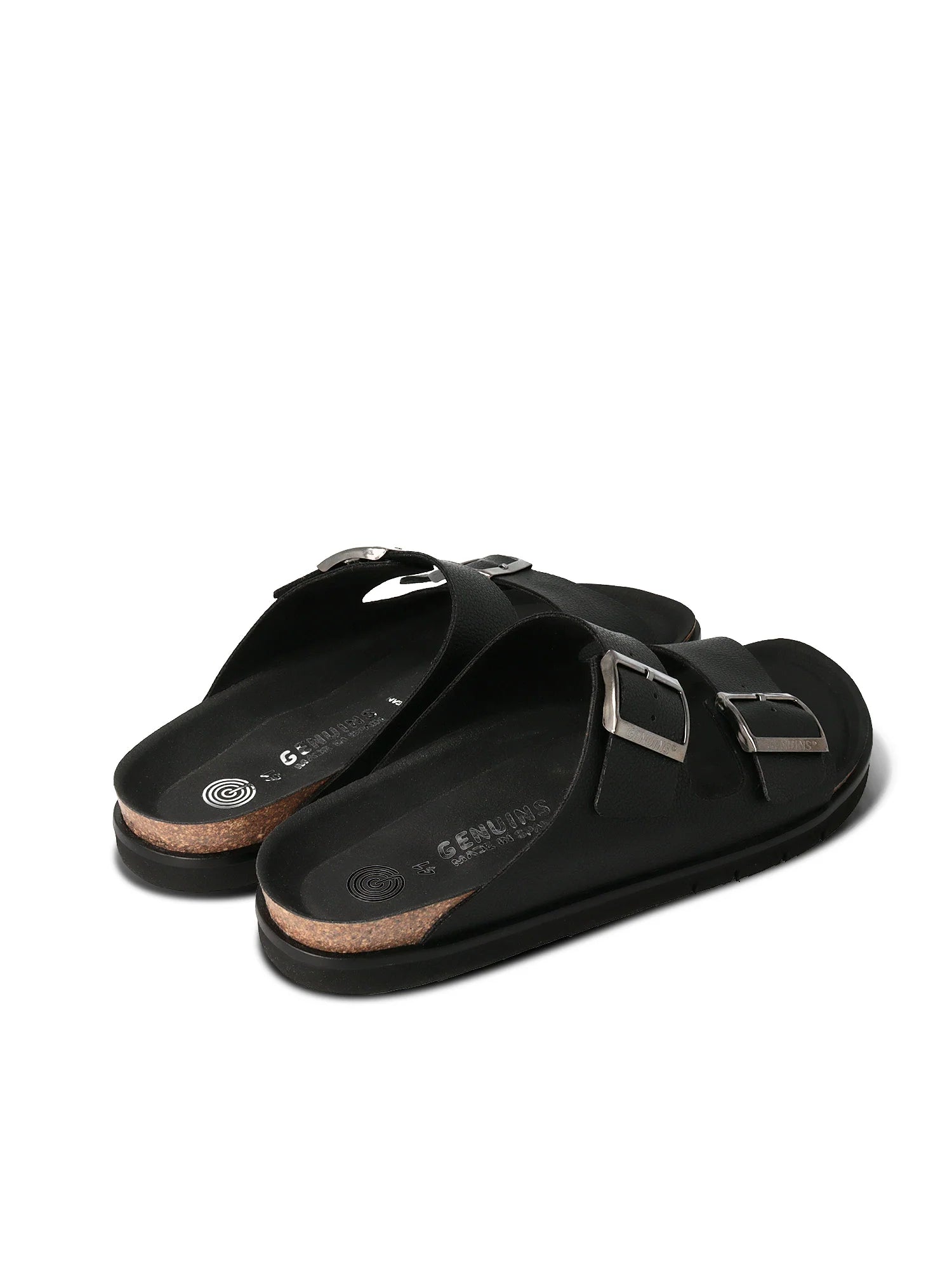 Black sandal with an anatomical footbed and adjustable buckle straps. PETA-approved, cruelty-free, and environmentally friendly vegan footwear. Designed and manufactured in Genuins' Elche factories using sustainable production methods and local suppliers.