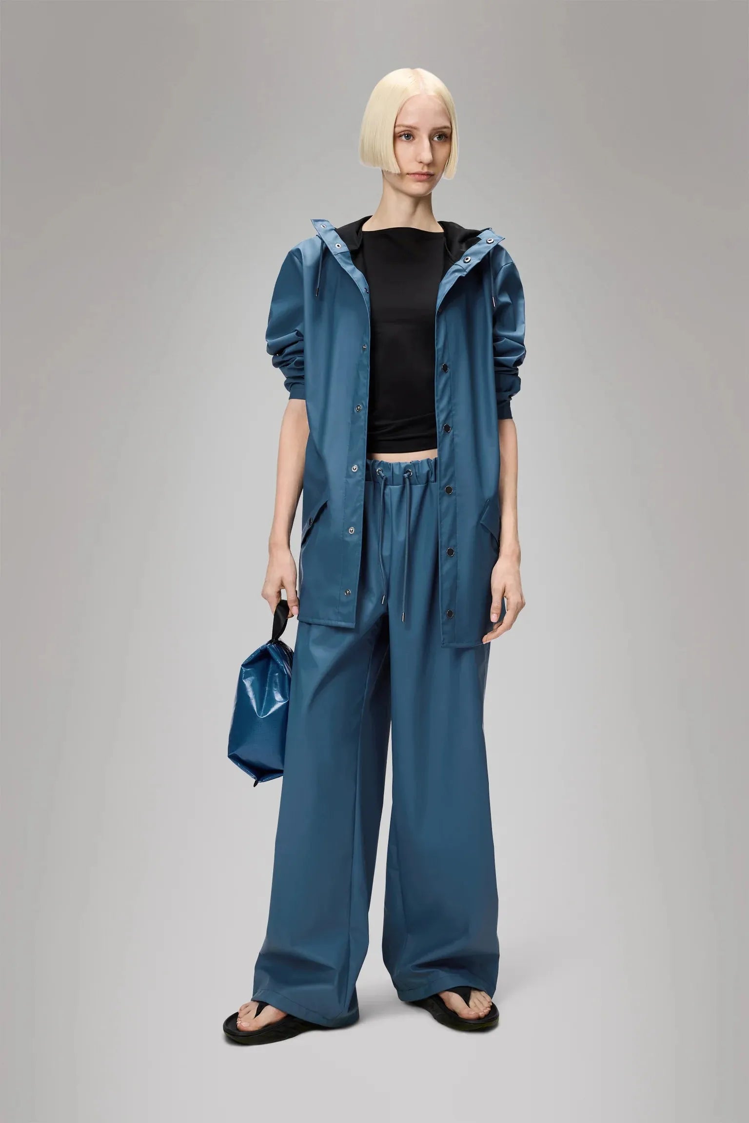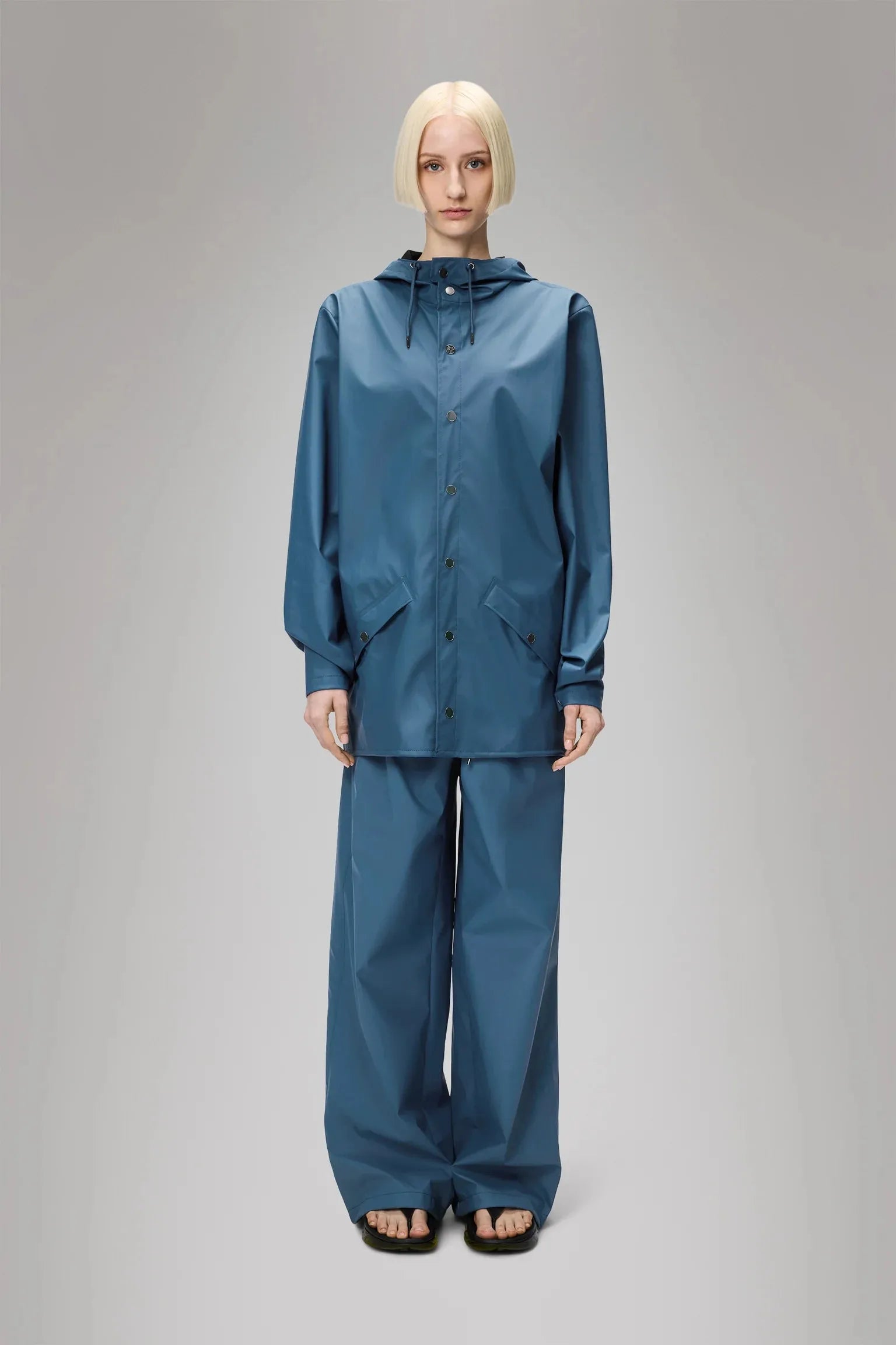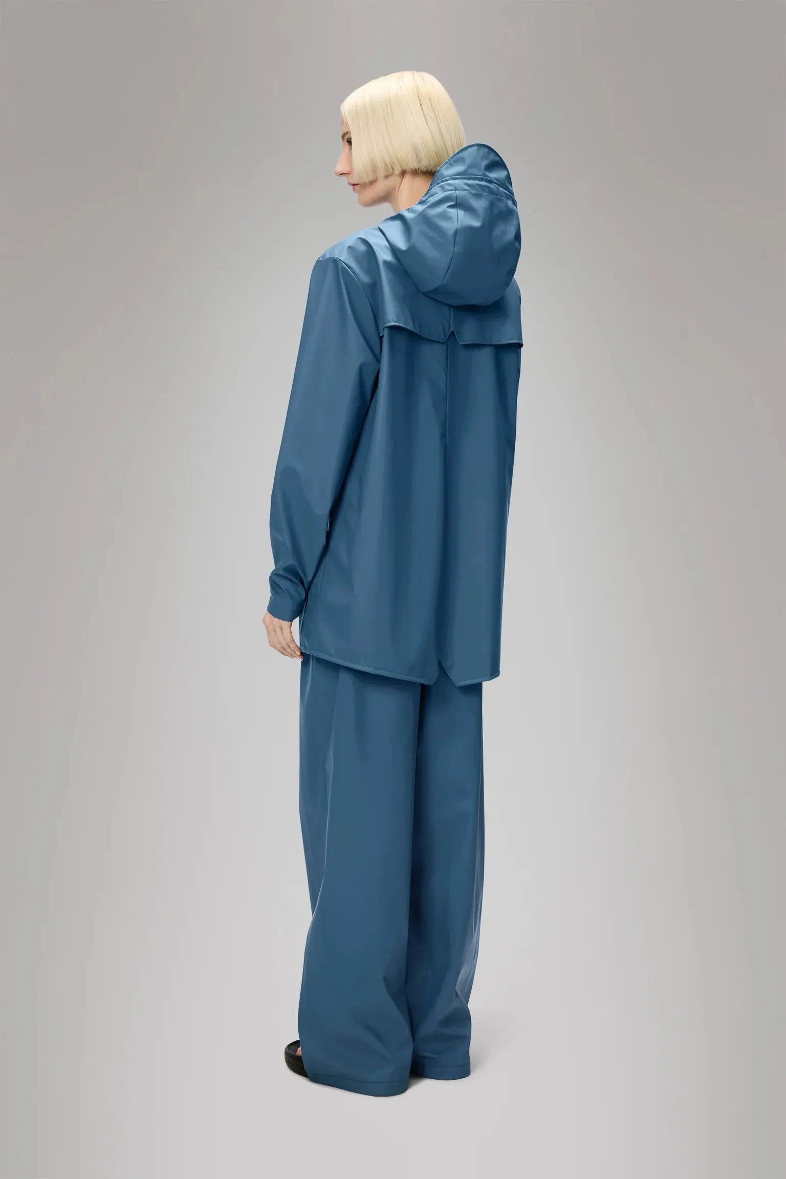The jacket is made from Rains' signature PU fabric with sealed seams. Its construction is lightweight and soft to the touch.