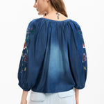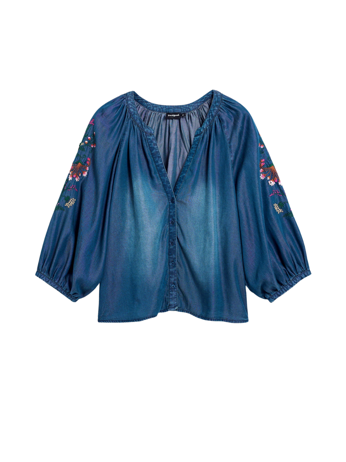 Blusa de 3/4 con efecto abullonado, abotonada por la parte delantera y con bordados decorativos en forma de flor.