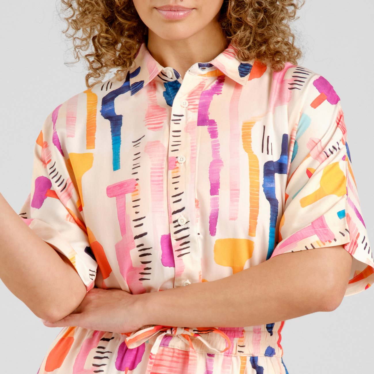 Women's loose-fitting shirt with a classic button-down closure and regular shirt collar. Rounded hem and wide, short sleeves.