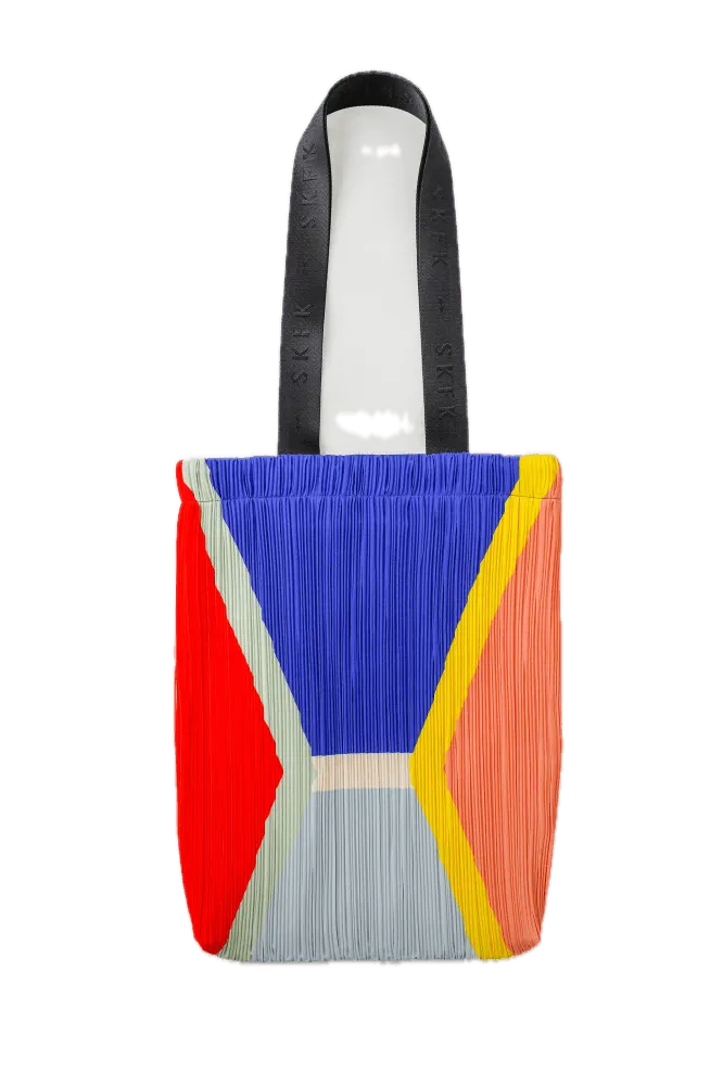 Printed recycled polyester shopping bag. Fully lined and with snap button closure. Multicolor print.