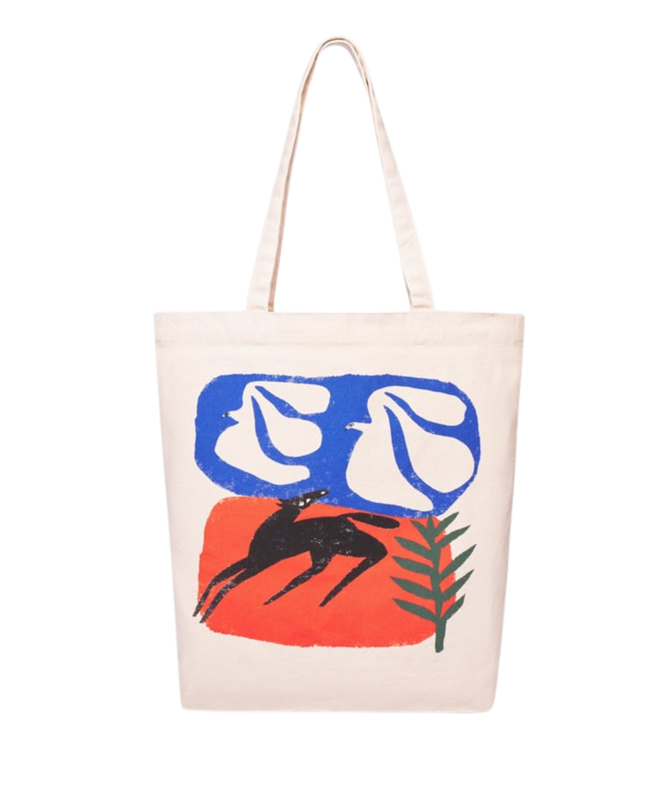 Diseñado en formato amplio con doble asa que permite llevarlo al hombro o en la mano, su tamaño compacto-capaz ofrece comodidad sin renunciar al estilo. El gráfico Foal With Birds aporta un detalle creativo inspirado en la naturaleza, perfecto para quienes buscan un accesorio con carácter. Disponible en tono neutro, facilita su integración en tu armario y combina perfectamente con prendas urbanas y minimalistas.