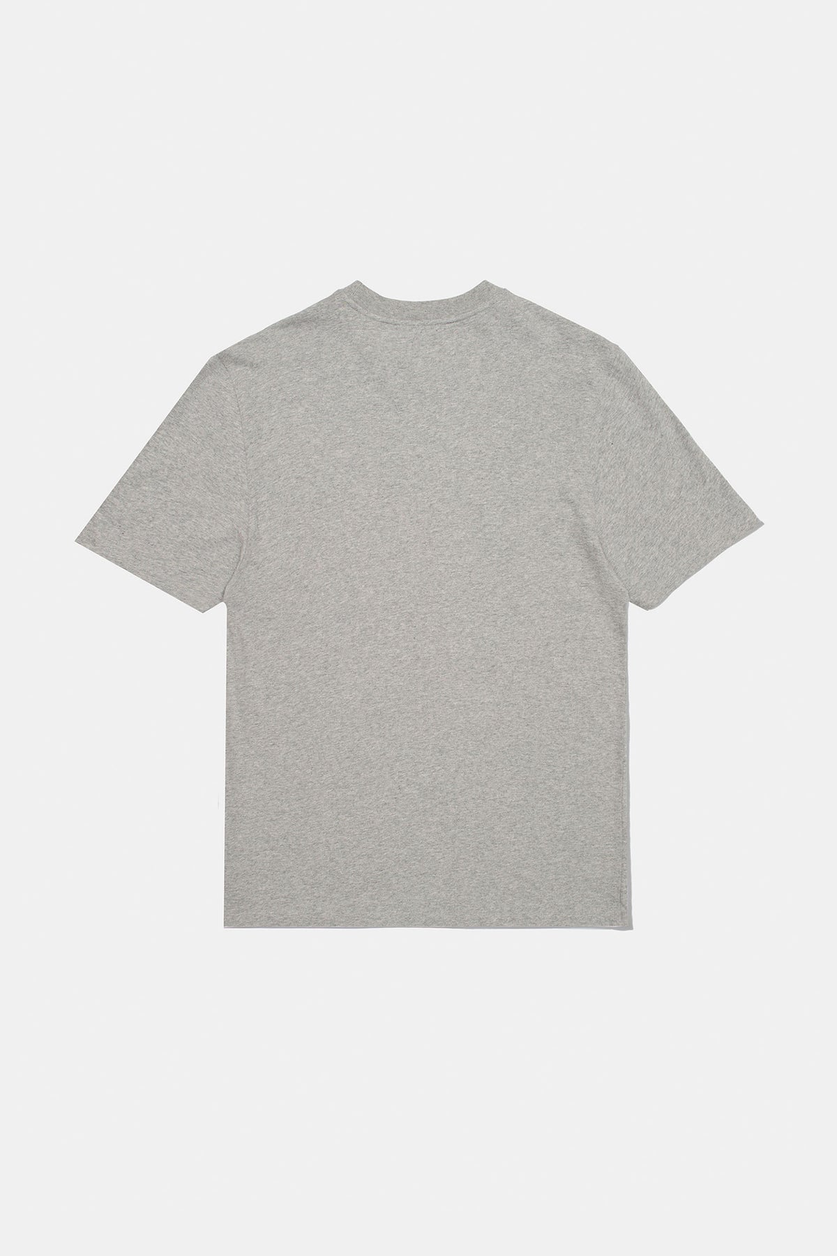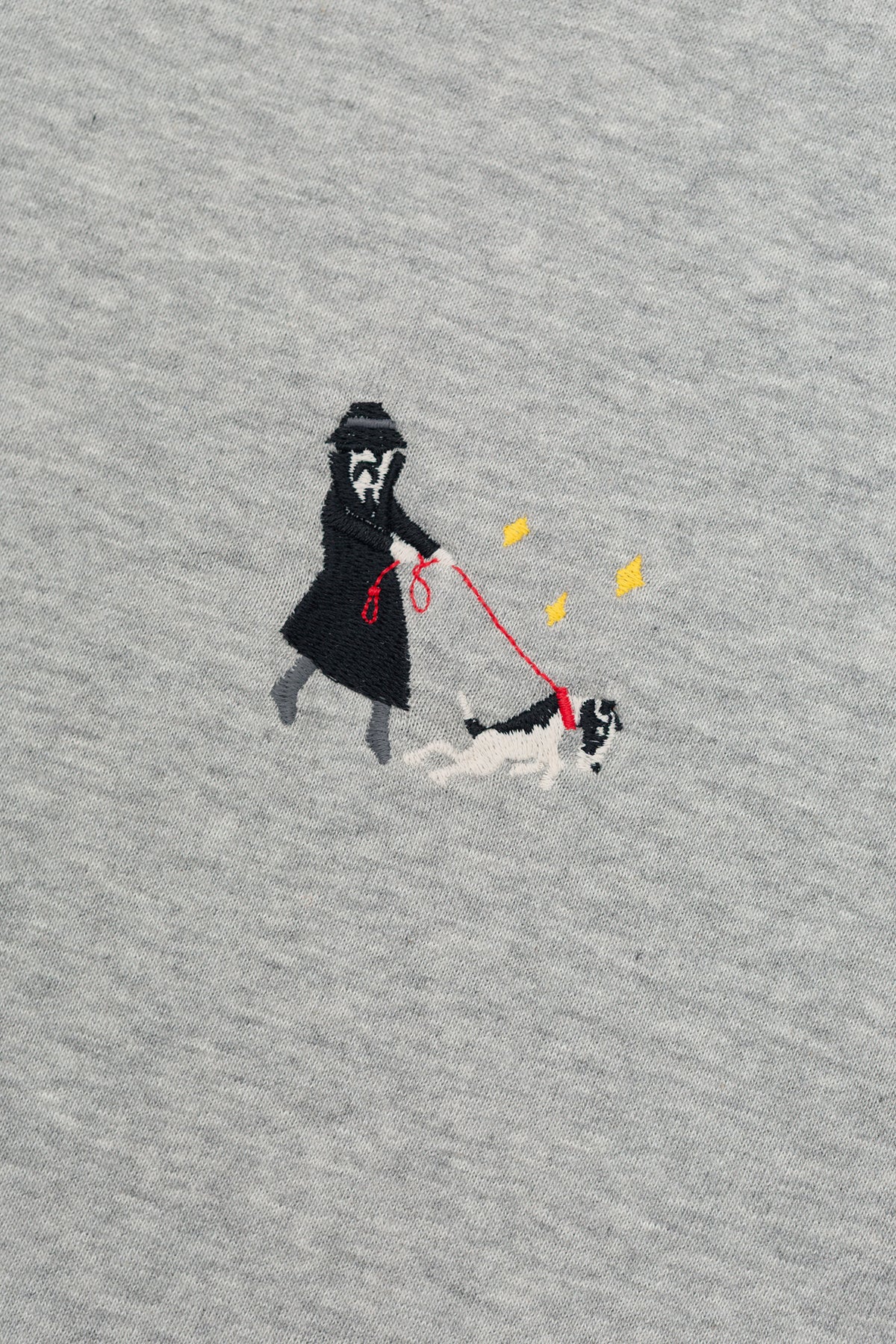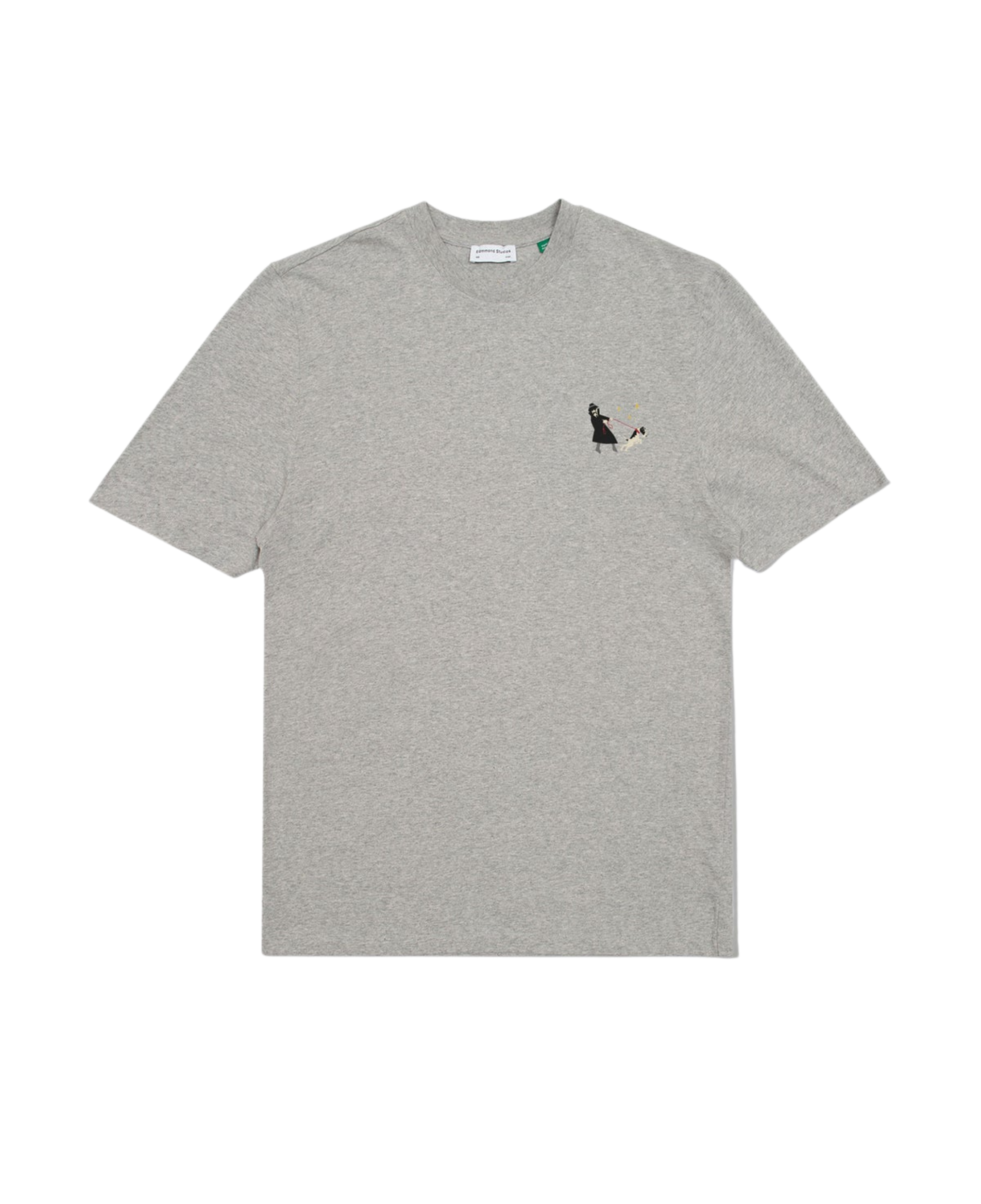 Camiseta gris de manga corta, fabricada con algodón 100% orgánico. Presenta un bordado en la parte frontal superior izquierda "Walkers" que muestra a un espía paseando a su perro. Diseñada con un corte relajado y una longitud perfecta. Fabricada en Portugal.