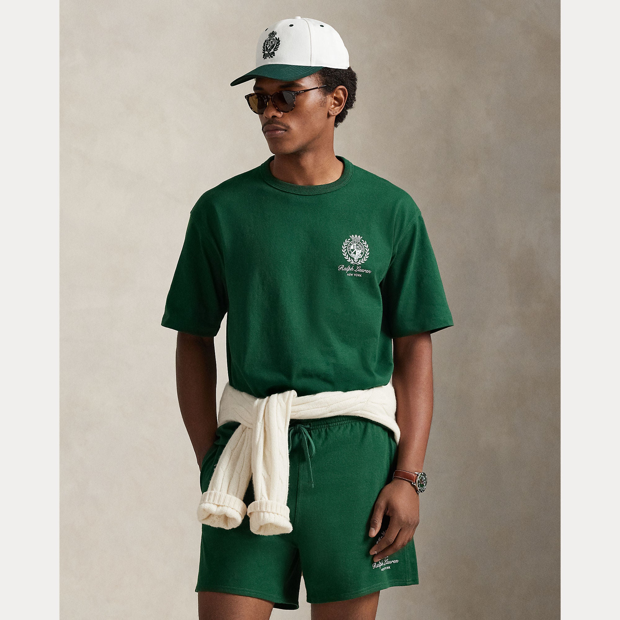 - Gráfico circular de archivo de 1986, "Ralph Lauren" en letra manuscrita y "New York" estampados en el lado izquierdo del pecho y en el centro de la parte trasera.