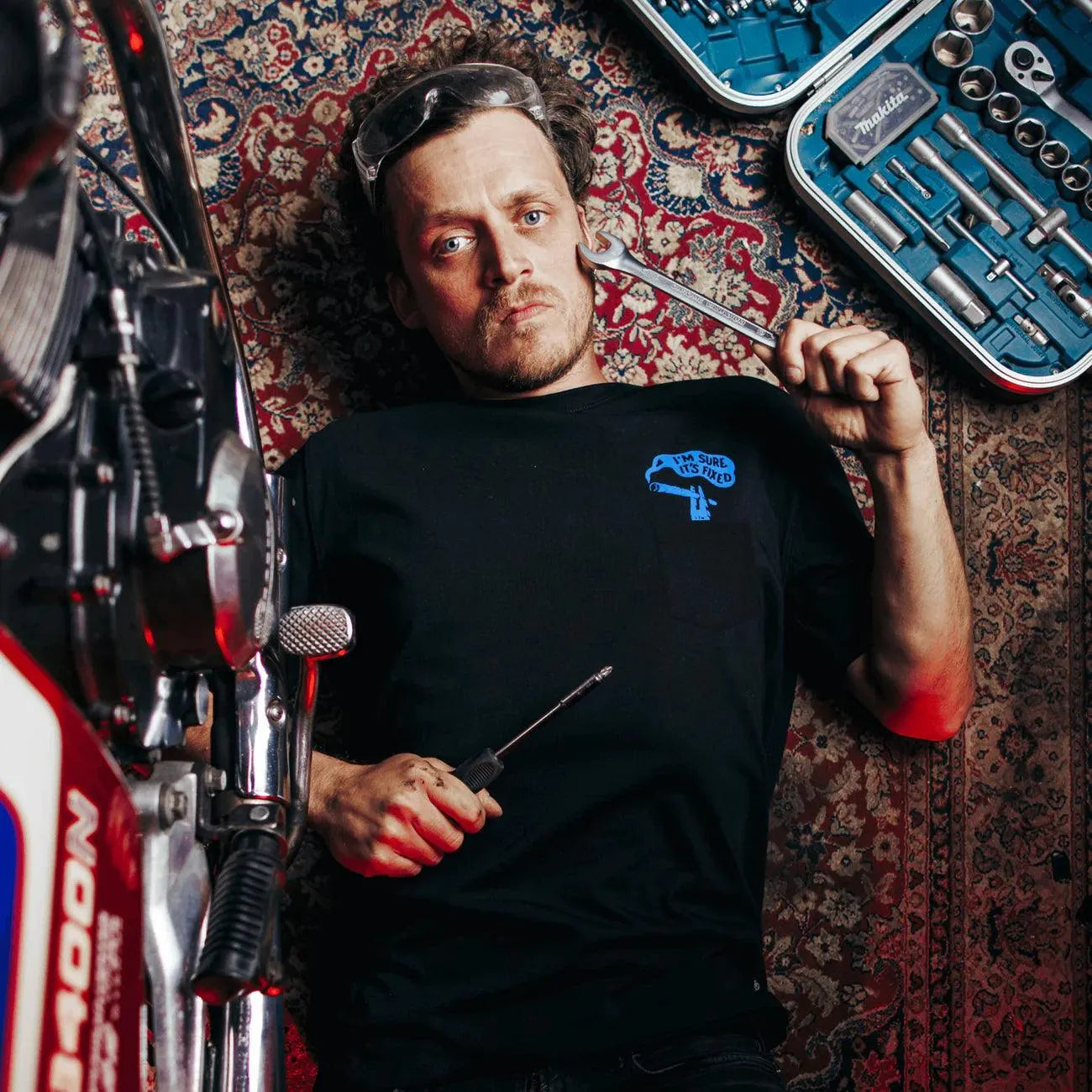 Premium heavyweight black t-shirt with Stoneys Fixation graphic.
