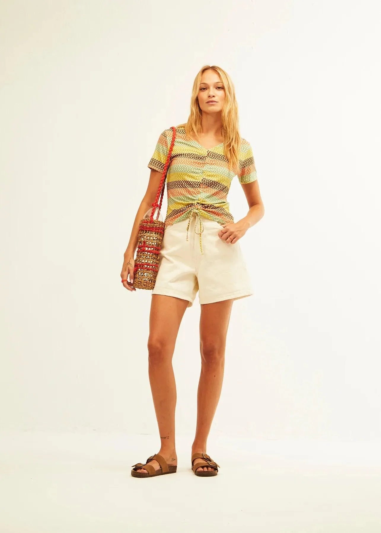 Short-sleeved top with drawstring detail in Accordion Rainbow print. Composition Viscose 95% Elastane 5%.
