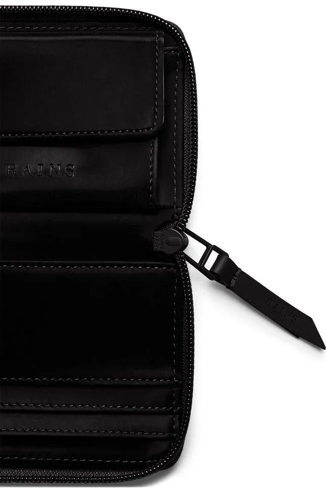 Small wallet with three card slots and a buttoned compartment for loose change. Crafted from Rains' signature matte fabric, this classic zippered wallet is completed with raised Rains logos.