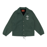 Relaxed fit coach jacket with front and back graphics, branded snap closure, drawcord hem, front hem pockets, 57% cotton, 43% nylon fabric, enzyme-washed polyester microfiber quilted lining.