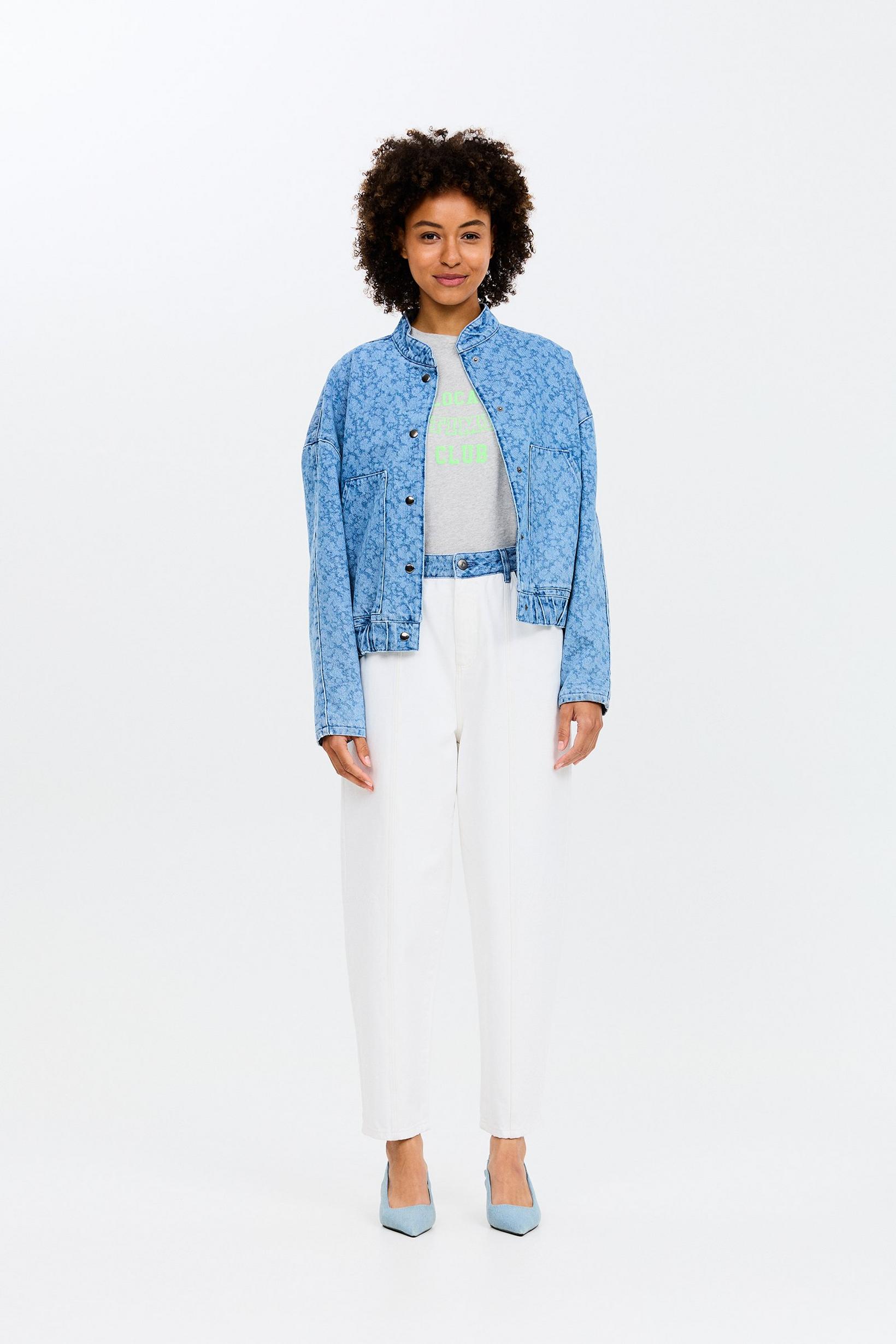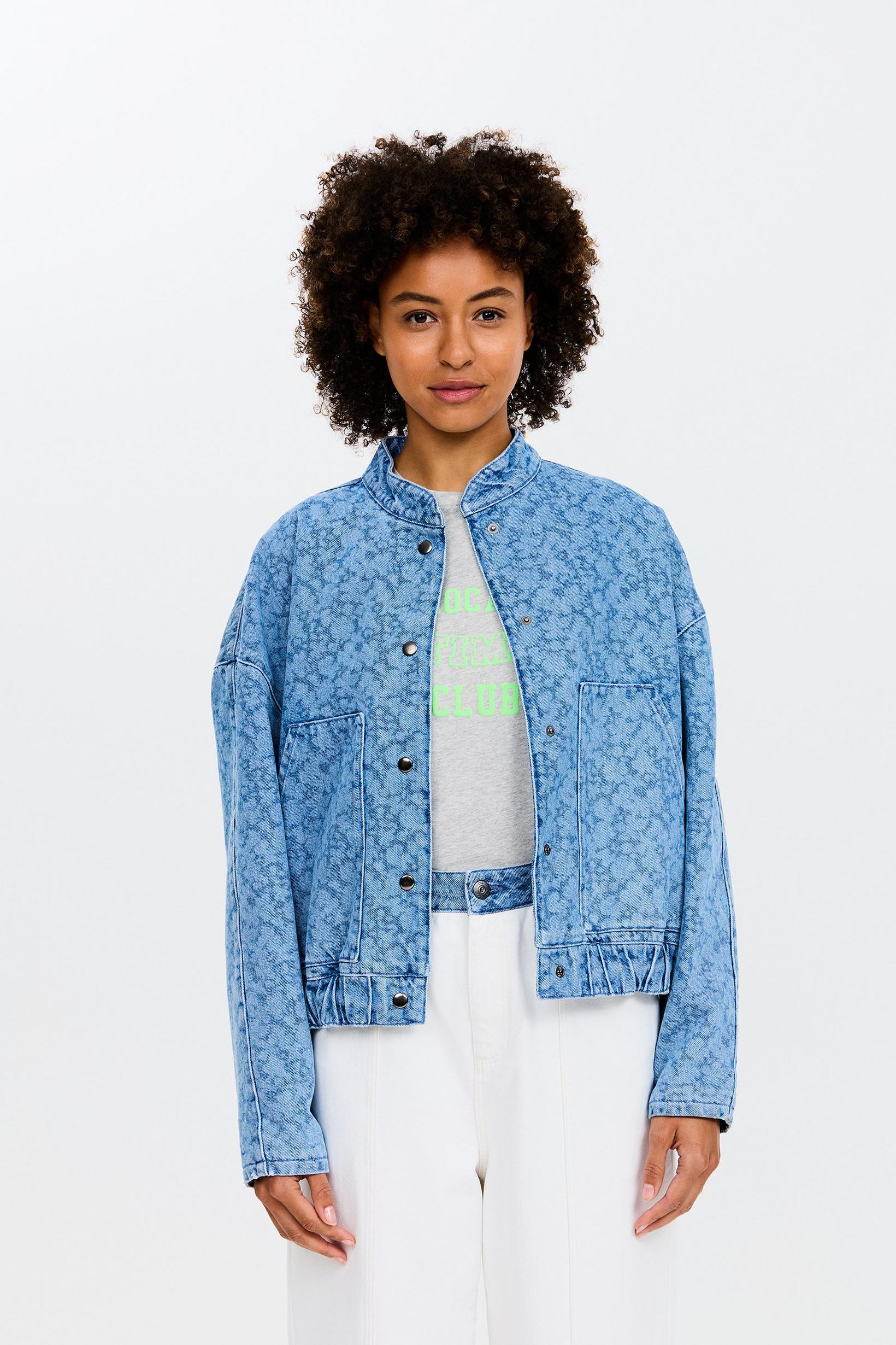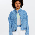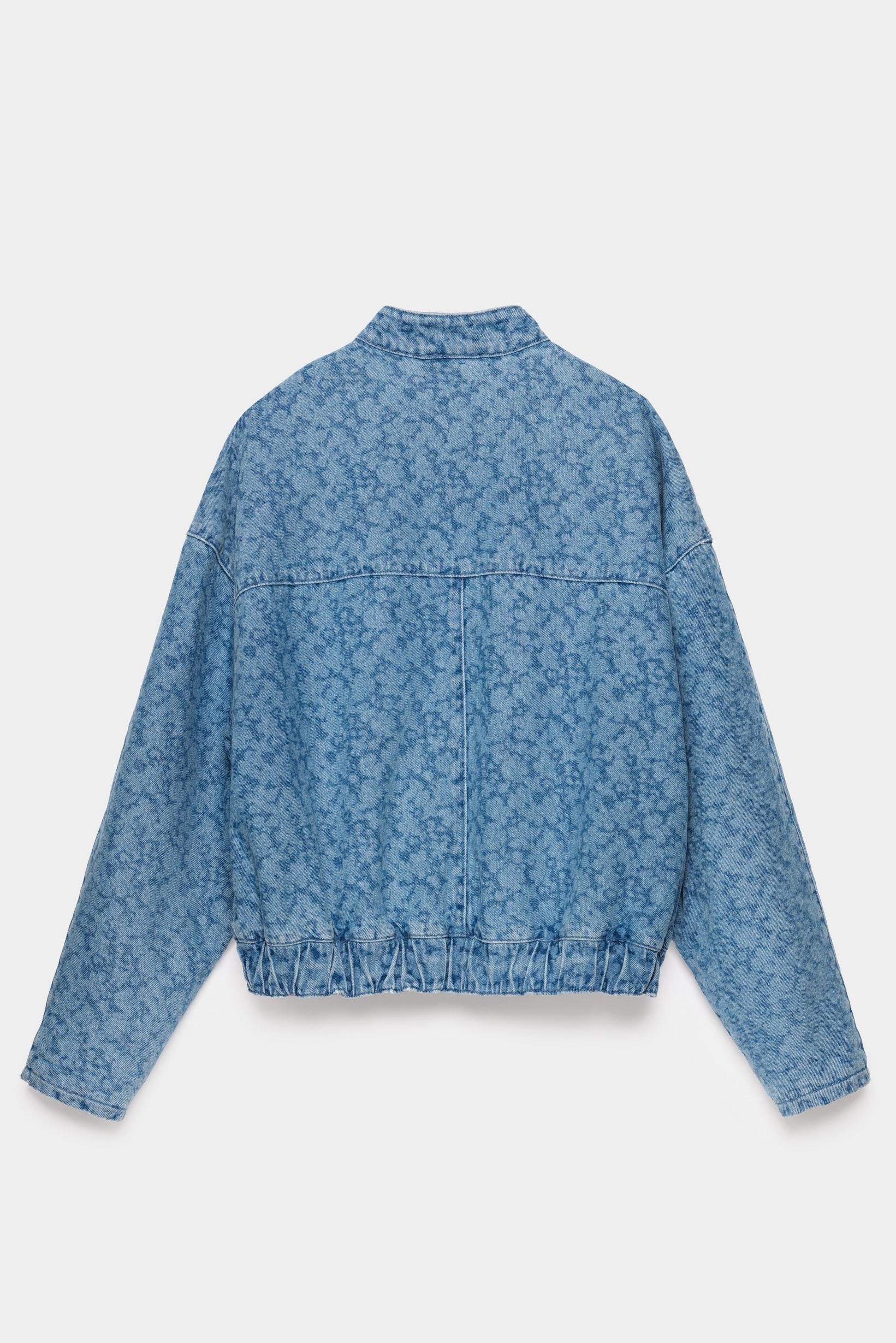 ¡No es la típica chaqueta vaquera! Prepárate para recibir cumplidos con esta chaqueta vaquera corta azul para mujer, estilo bomber. Esta chaqueta corta tiene un toque único gracias al ligero estampado floral láser y a su corte holgado. Acabada con bolsillos, cintura elástica y bolsillos. Pantalones a juego disponibles.