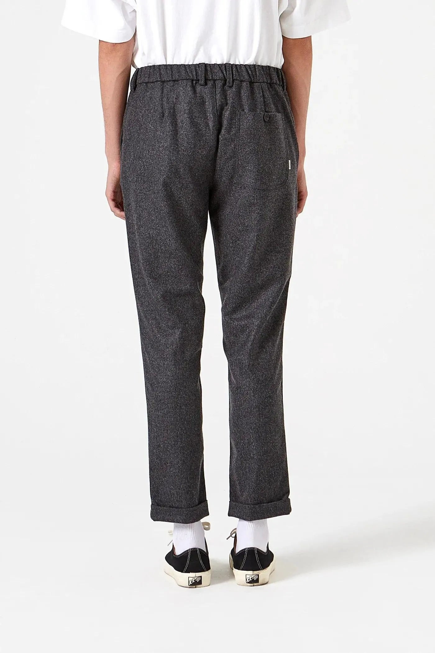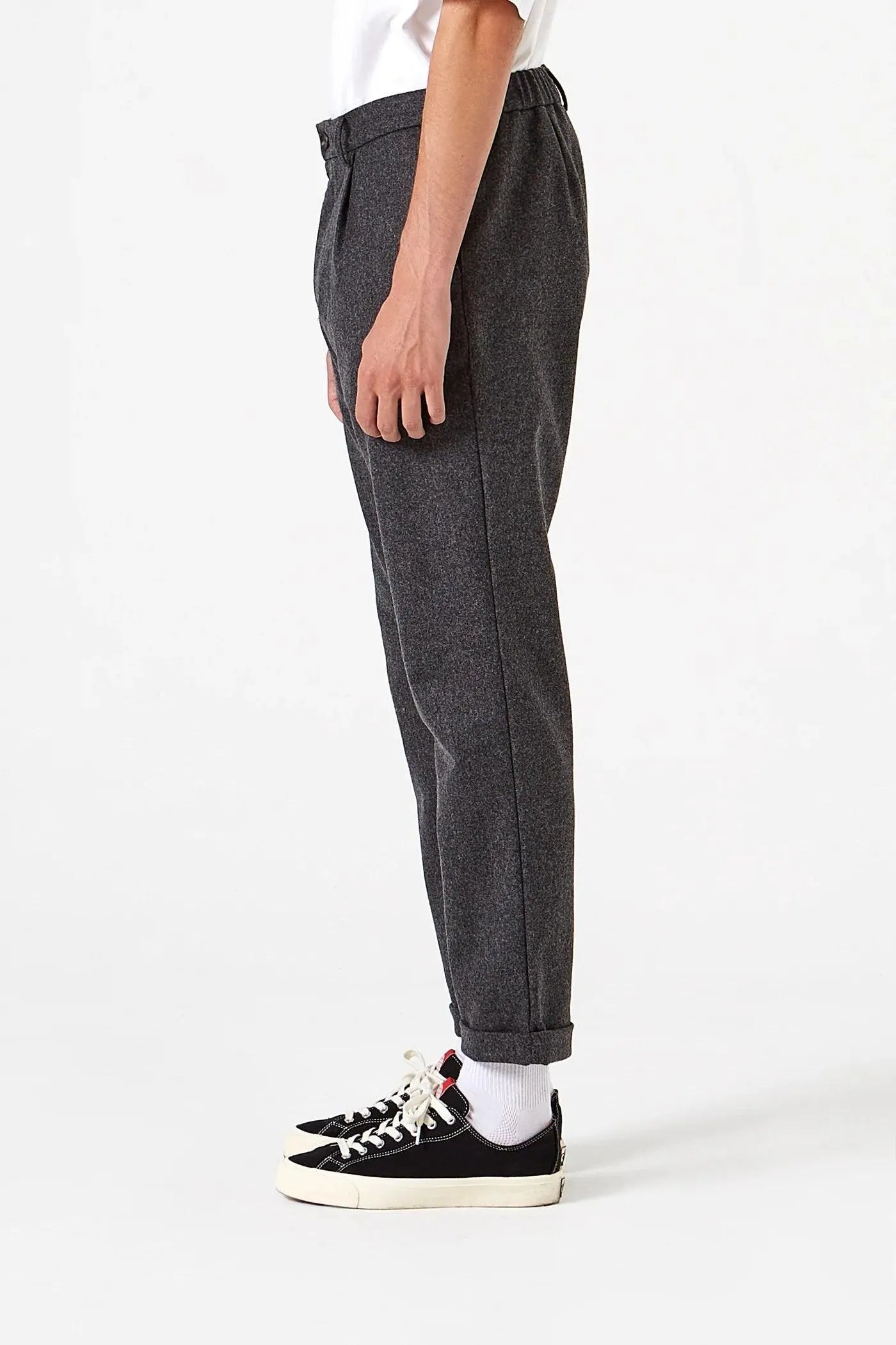 Loose-fit gray pants. Made in a wool blend fabric for a more comfortable fit. They are finished with an elasticated waist.
