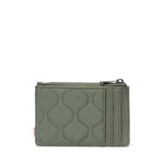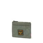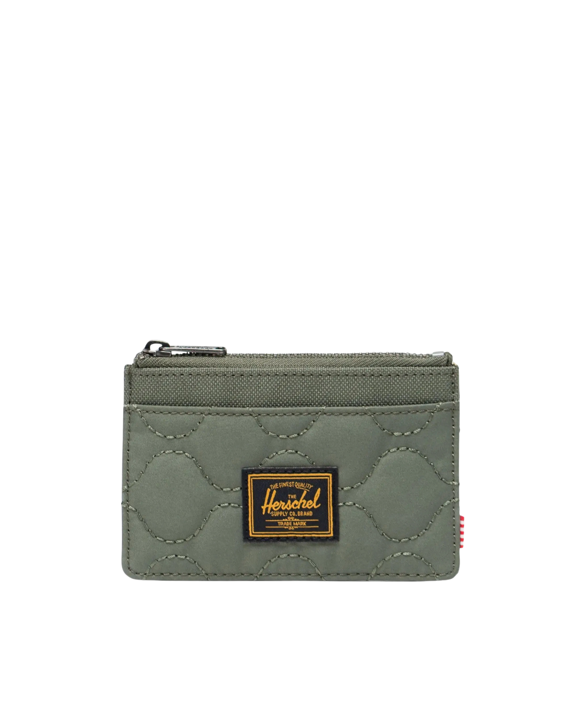 El Herschel Oscar Cardholder Quilted Capsule en color Beetle (verde) destaca por su estética funcional: acabado acolchado “onion quilting” inspirado en equipamiento táctico y bomber jackets vintage. Fabricado con materiales reciclados (100 % poliéster 600D para el exterior, forro en 100 % poliéster reciclado) y protegido con capa RFID que bloquea datos de tarjetas. Cuenta con ranuras para tarjetas (cartas, ID, pases) y un pequeño compartimento con cremallera para efectivo u otros objetos pequeños.