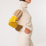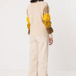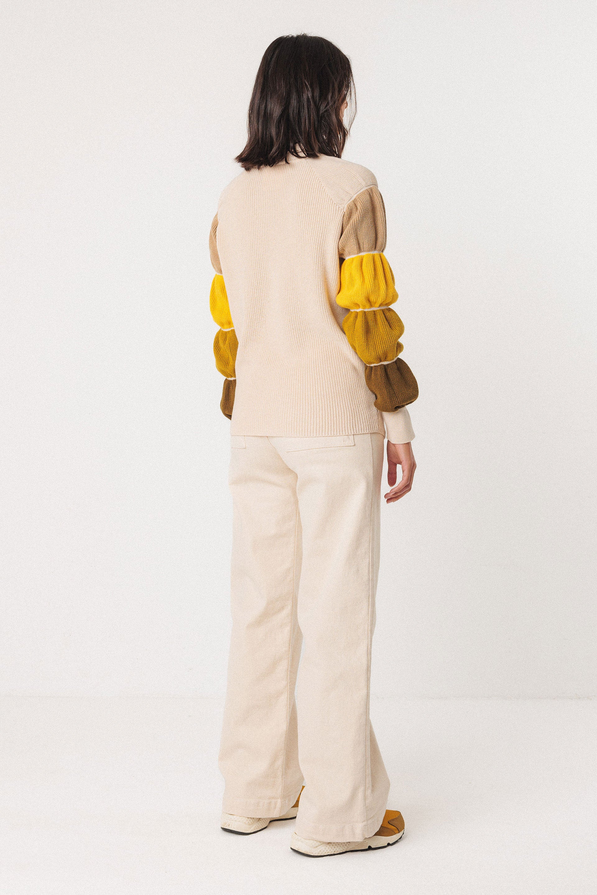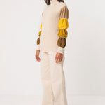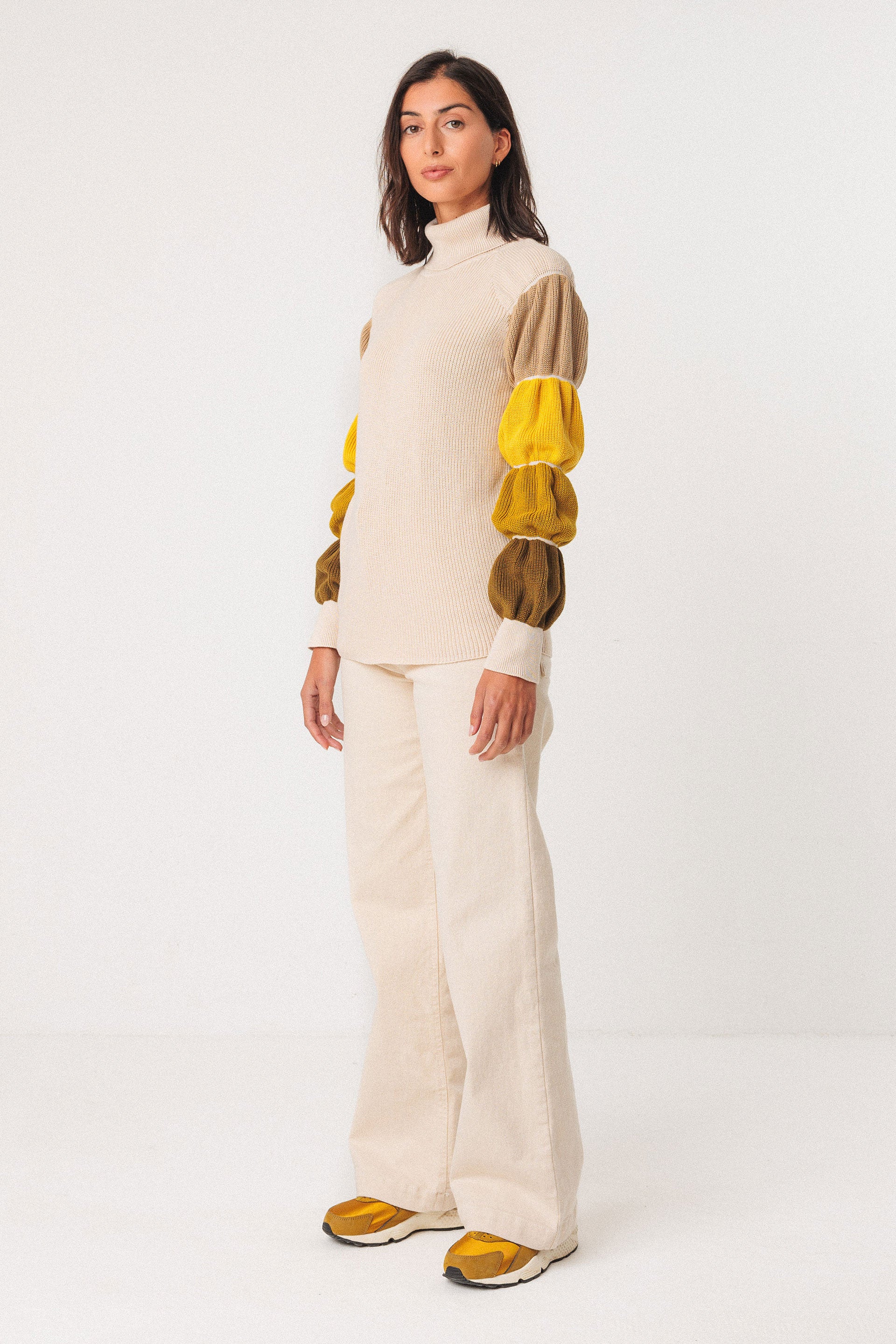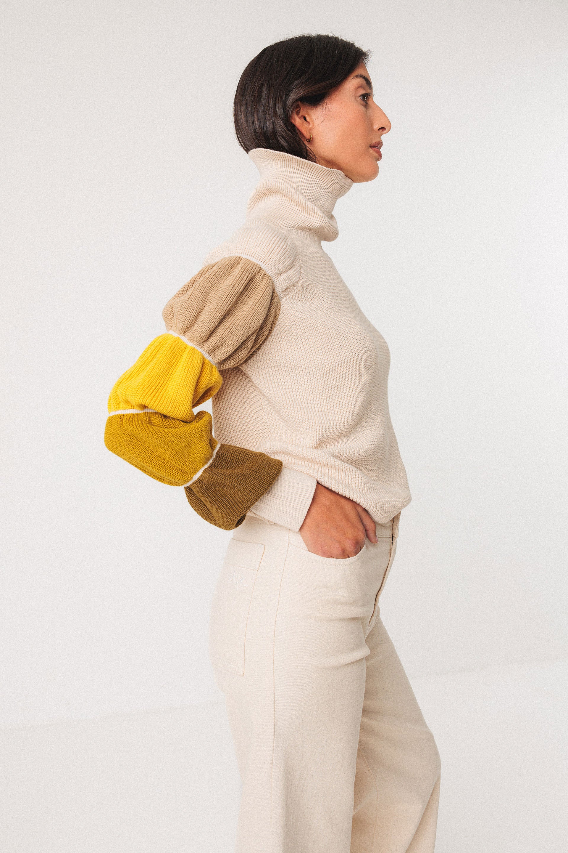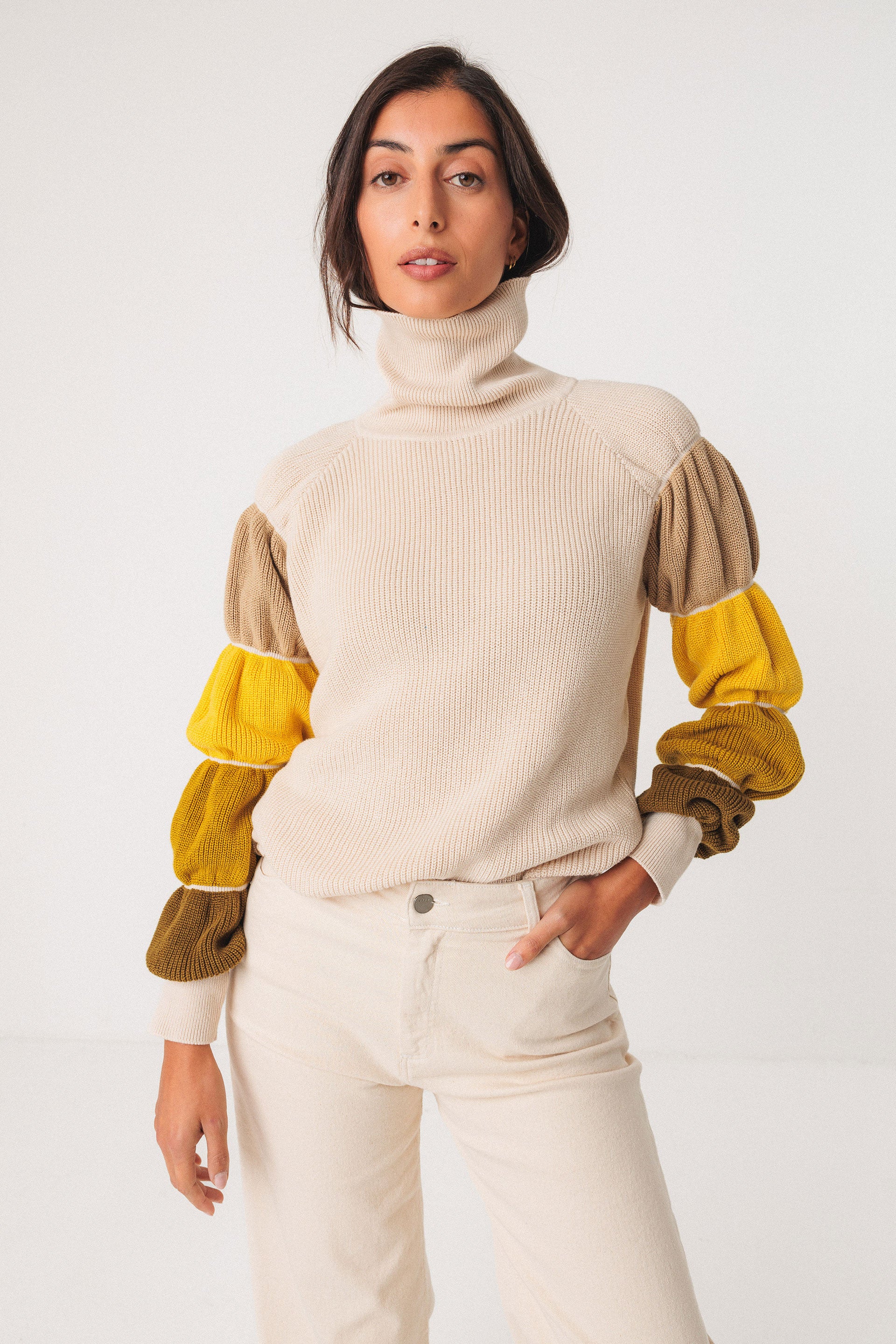 Suéter ceñido de punto semigrueso, cuello alto de canalé y manga larga. Está adornado con un juego de colores en contraste.