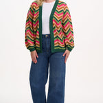 La novedad para 2025, el cárdigan Bella, ofrece un estilo desenfadado con una silueta relajada abierta por delante y un favorecedor escote en V. Confeccionado en un suave punto calado, este atrevido cárdigan presenta un llamativo patrón en zigzag en tonos verdes, rosas y marrones terrosos, con detalles de puntos texturizados que le aportan un toque adicional de interés. Sin cierres, Bella refleja el ajuste de nuestro superventas Yvette, un jersey versátil y llamativo perfecto para combinar con prendas básicas o vaqueros.