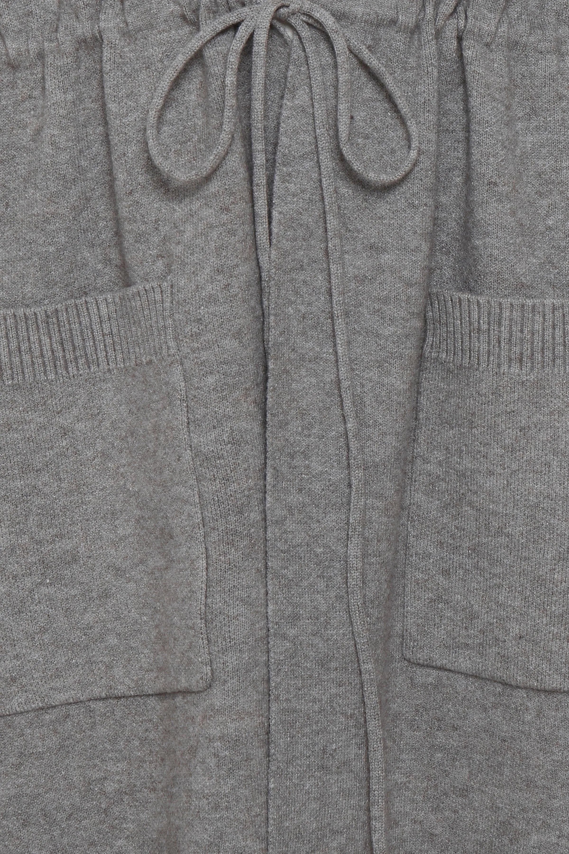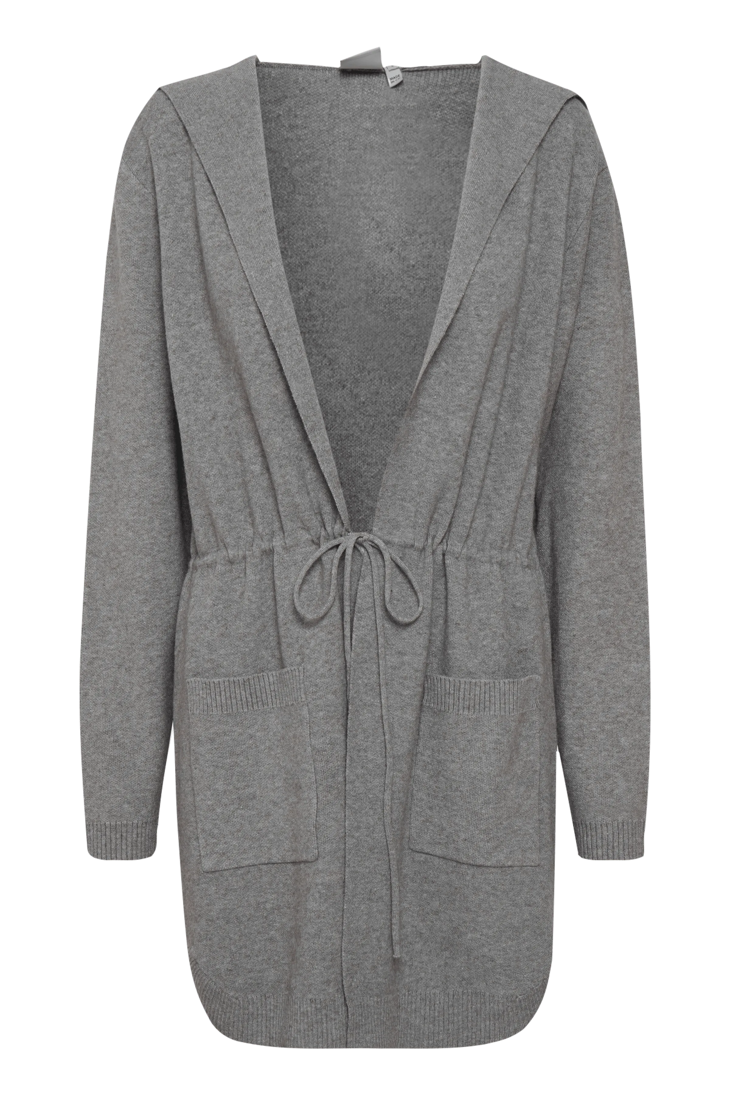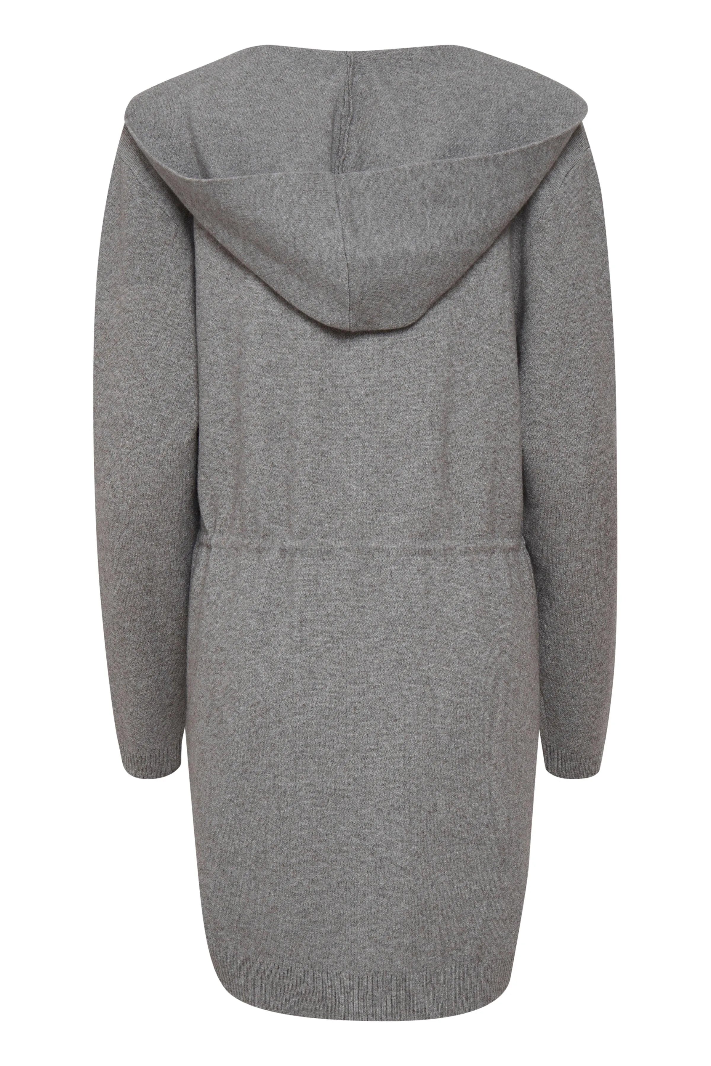 Gray knit cardigan or jacket with hat and pockets.