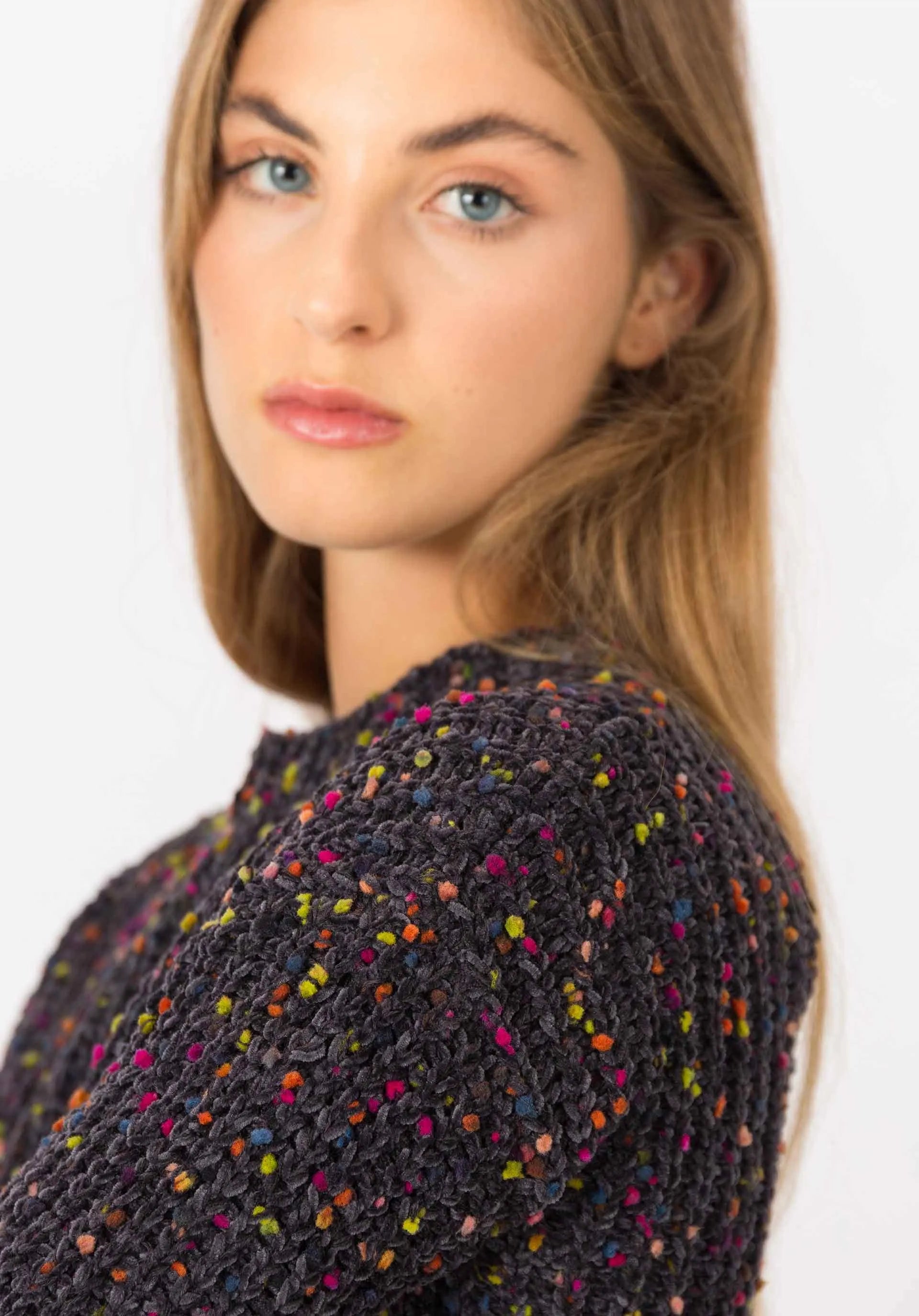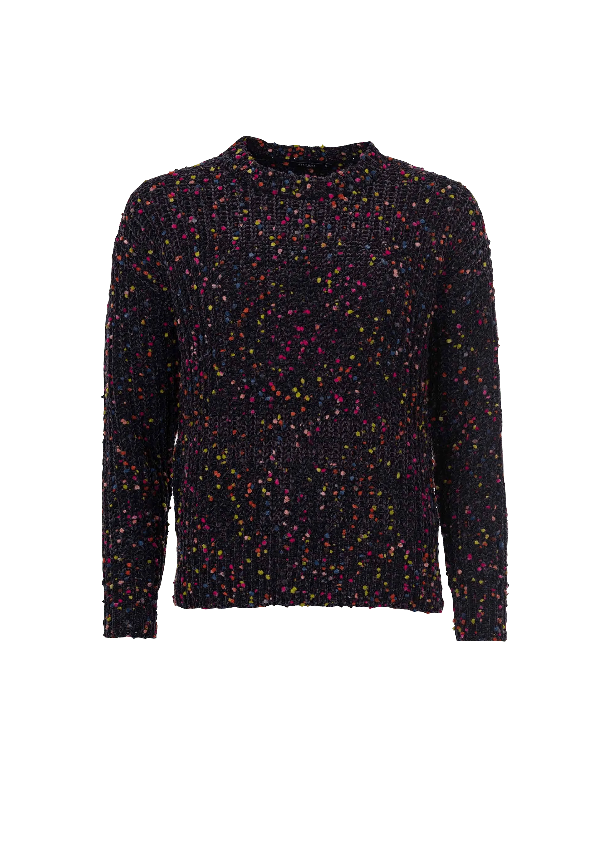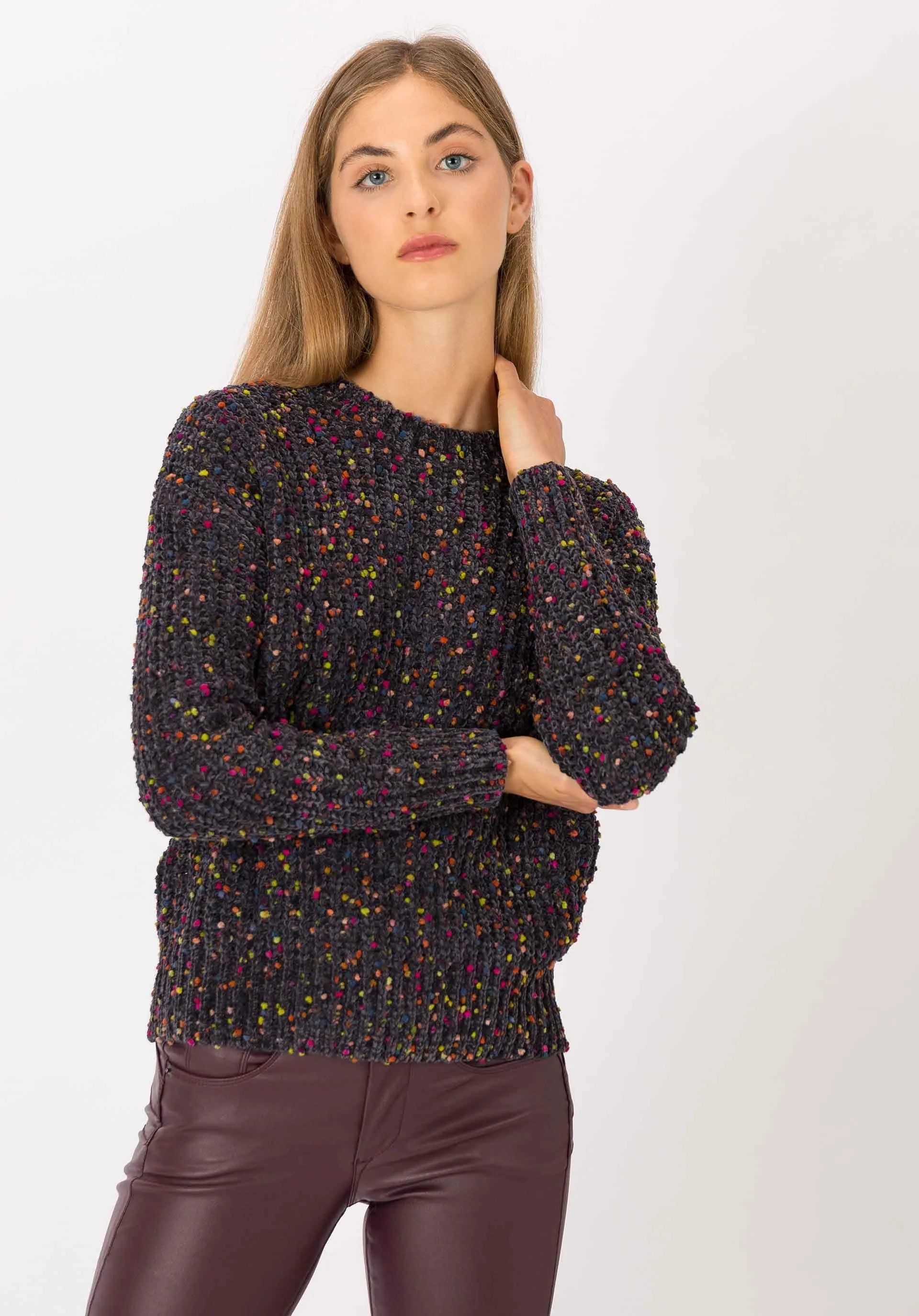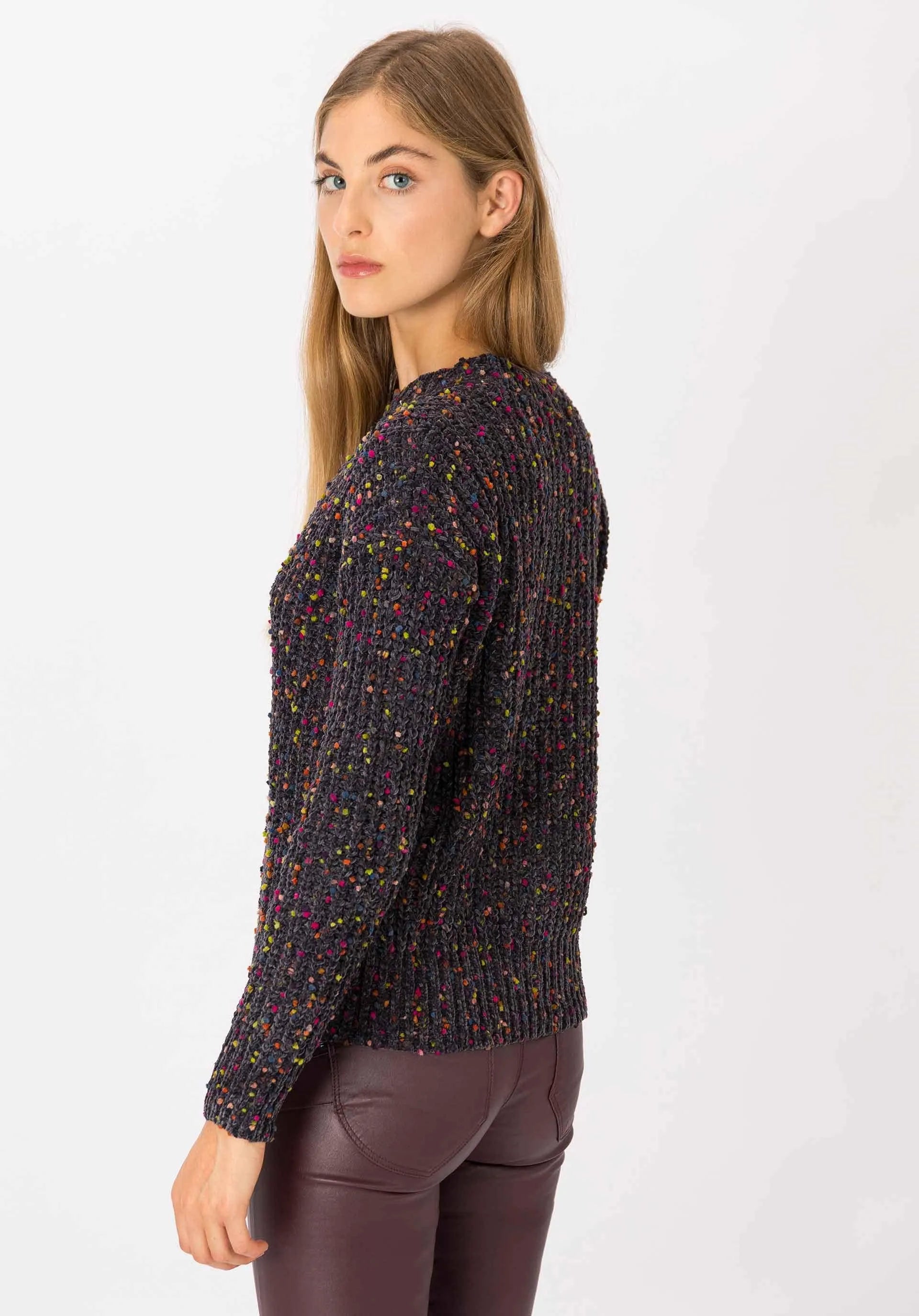 Knitted sweater with round neck and long sleeves. Pom pom detail.