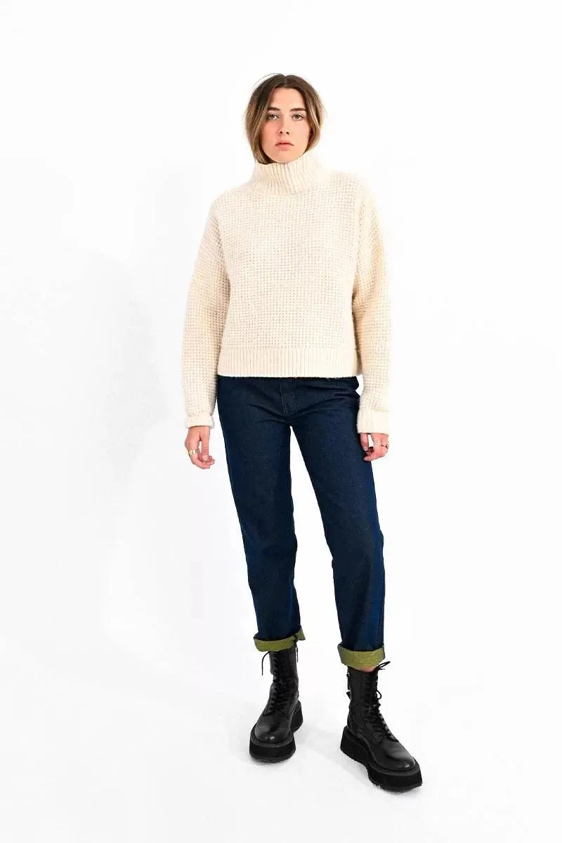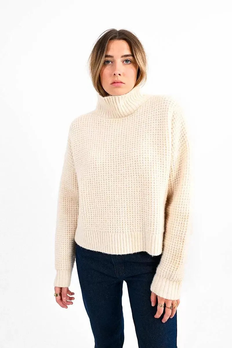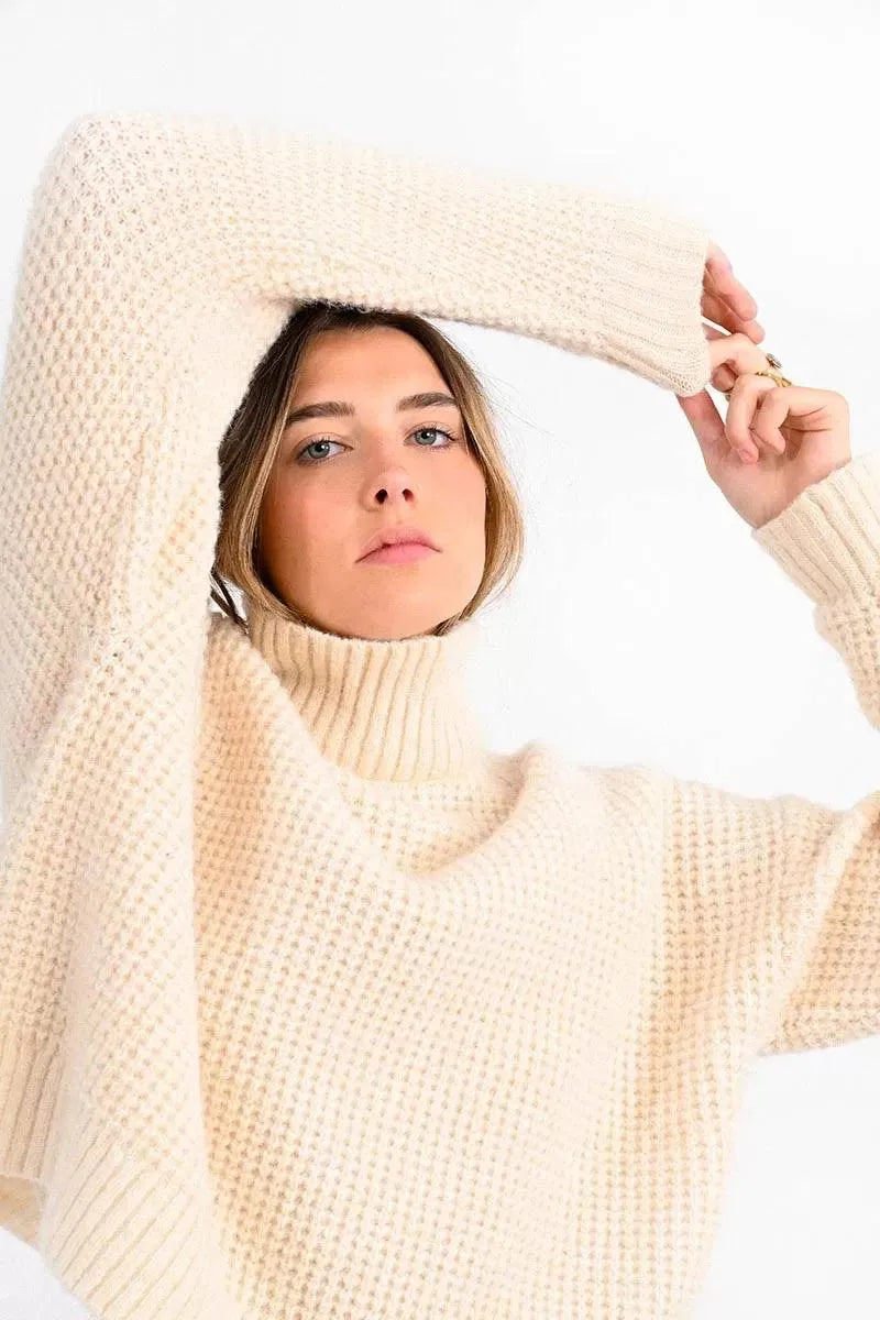 Long-sleeved sweater, high neck and straight cut. Model in soft fabric and mixed knit.