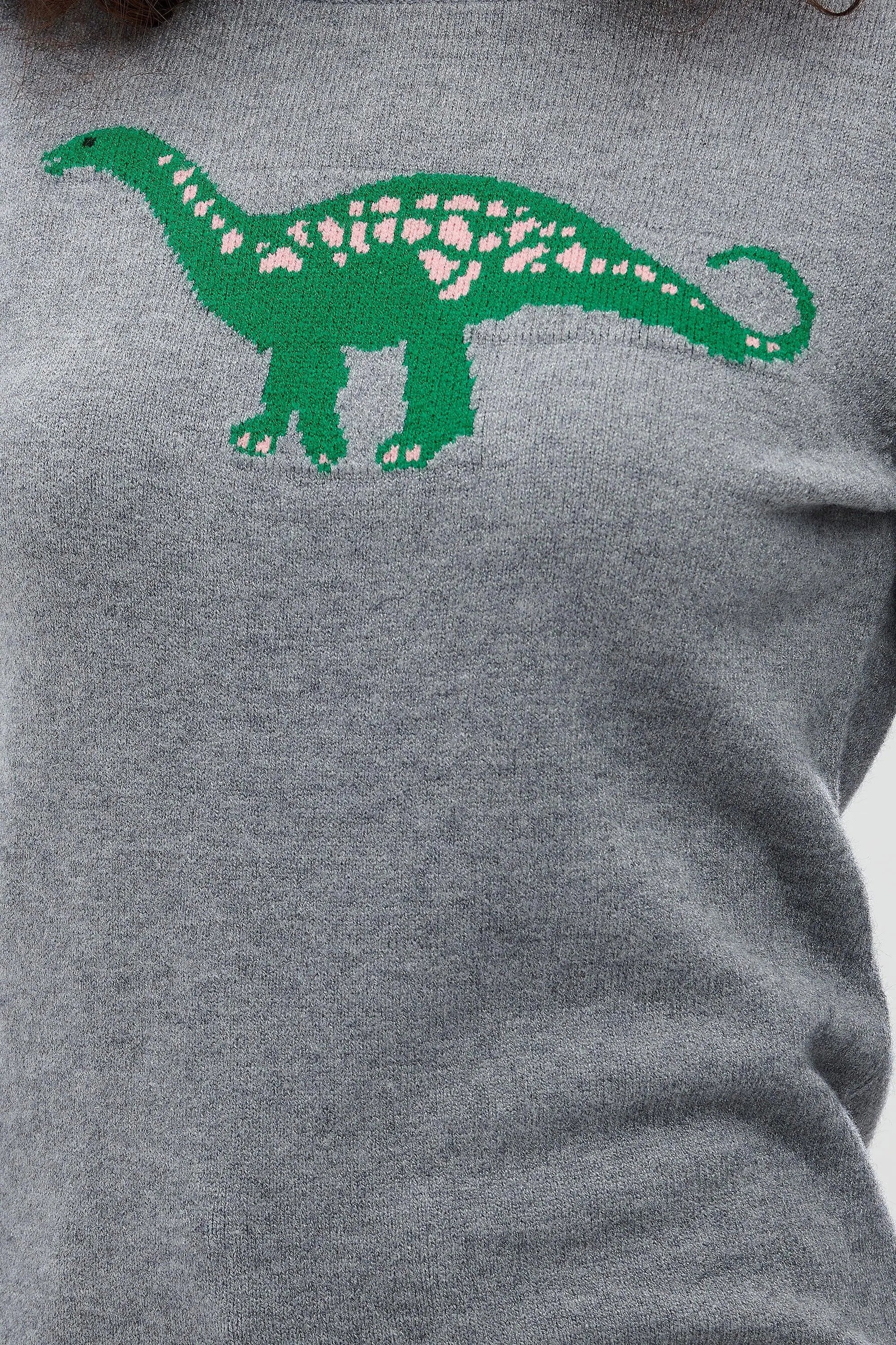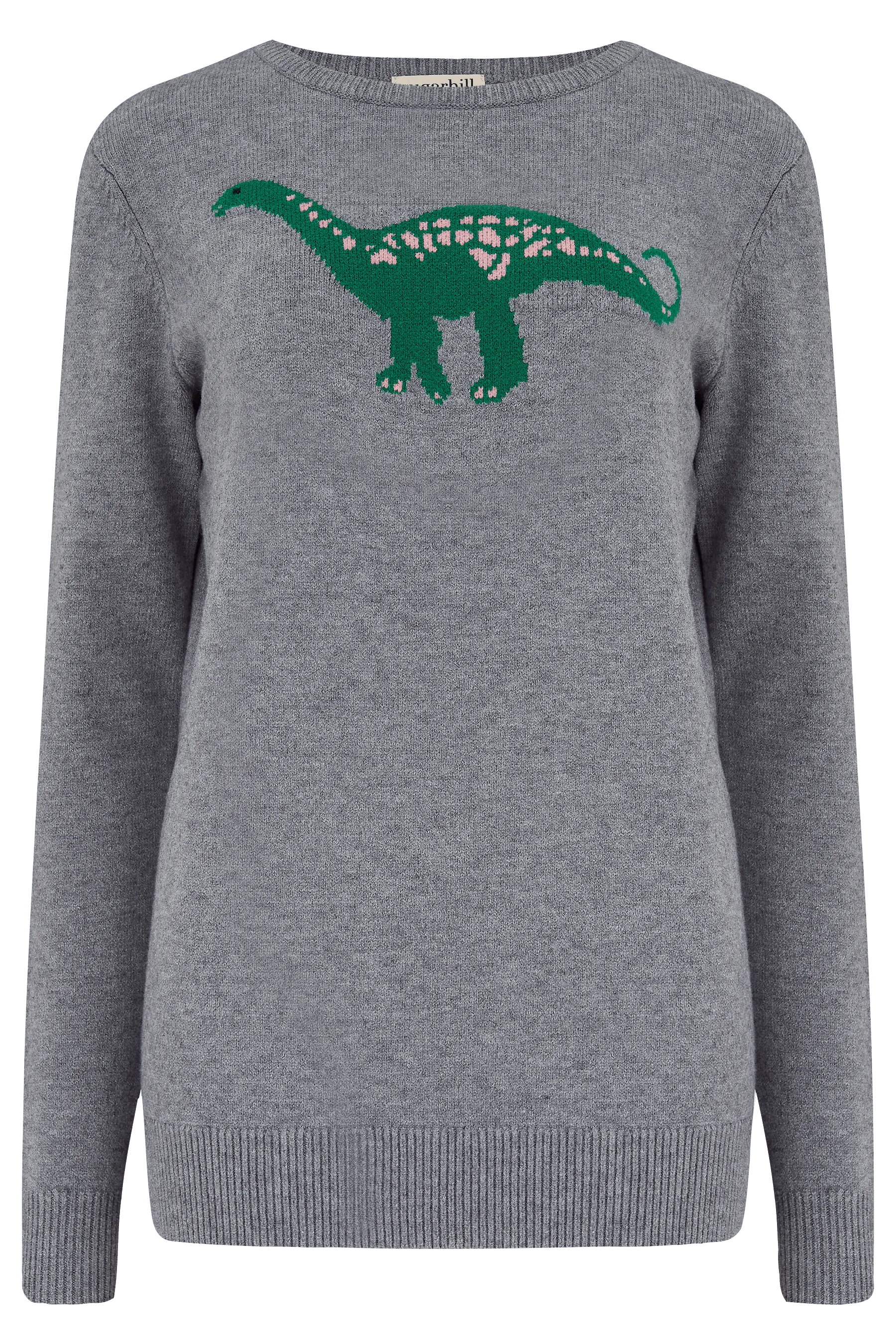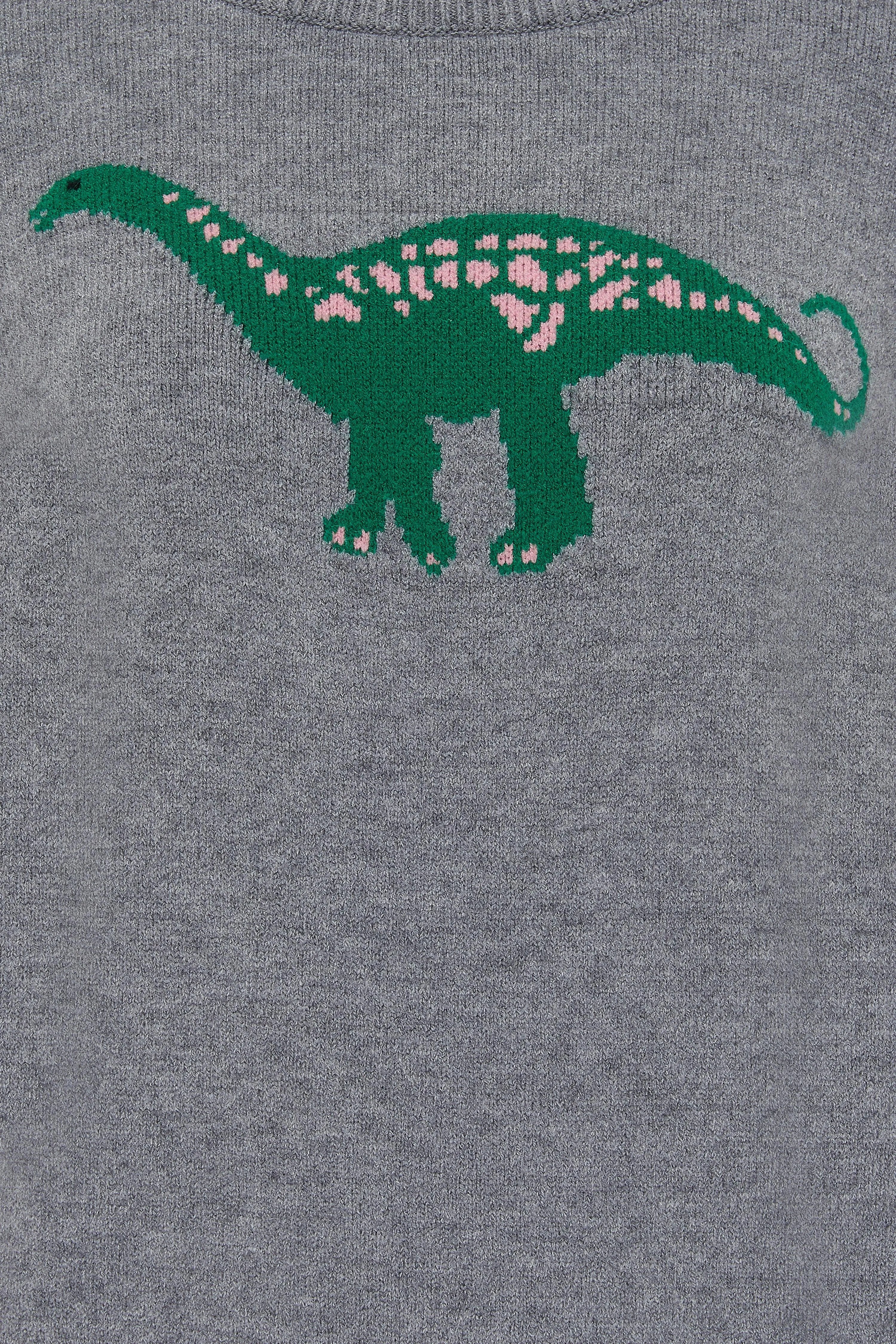 A slim fit jumper with a round neckline and a central dinosaur intarsia on the bust. We love an eye-catching sweater and Stacey's green dinosaur in a chunky, relaxed knit charcoal jumper is the perfect combination of comfort and style.