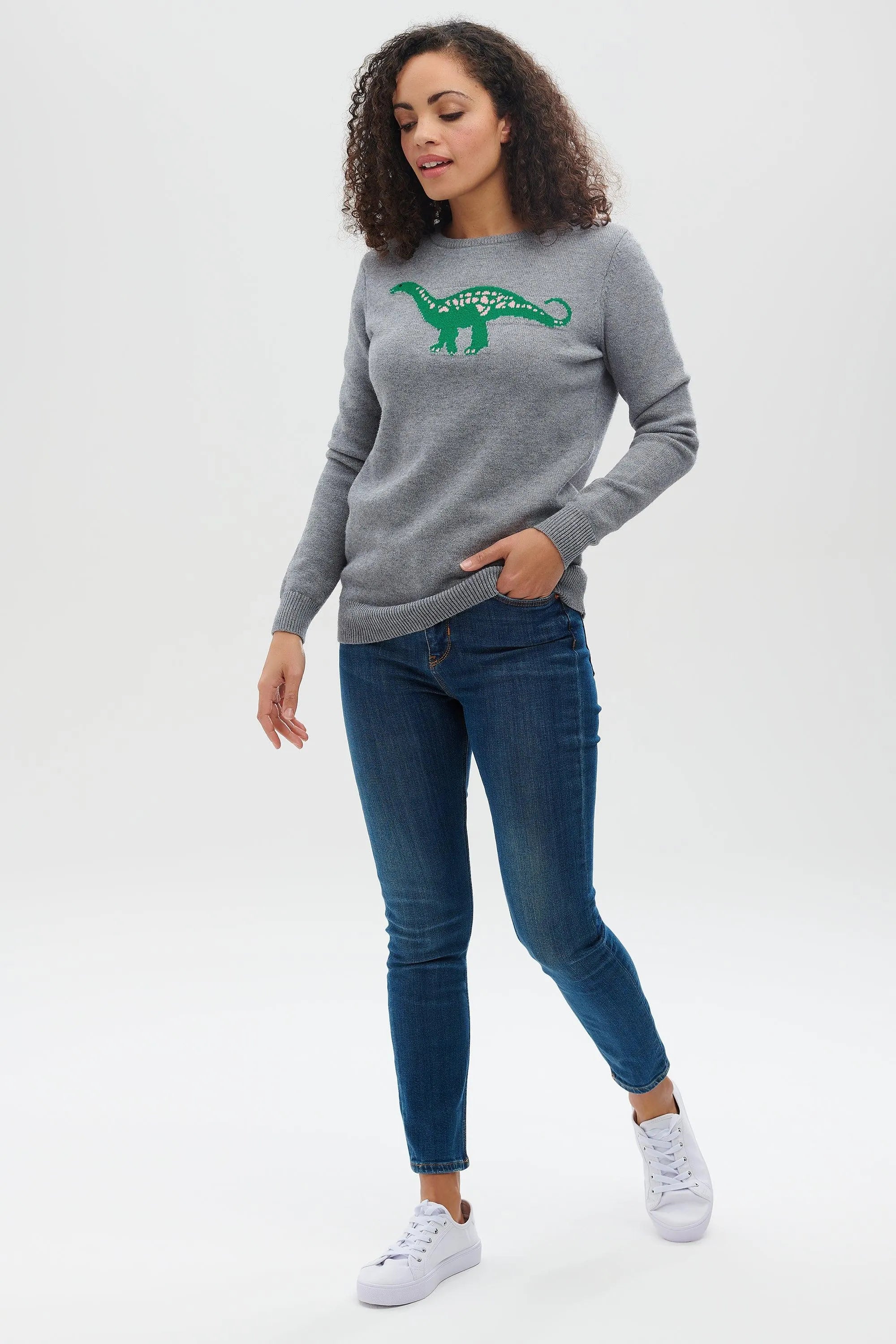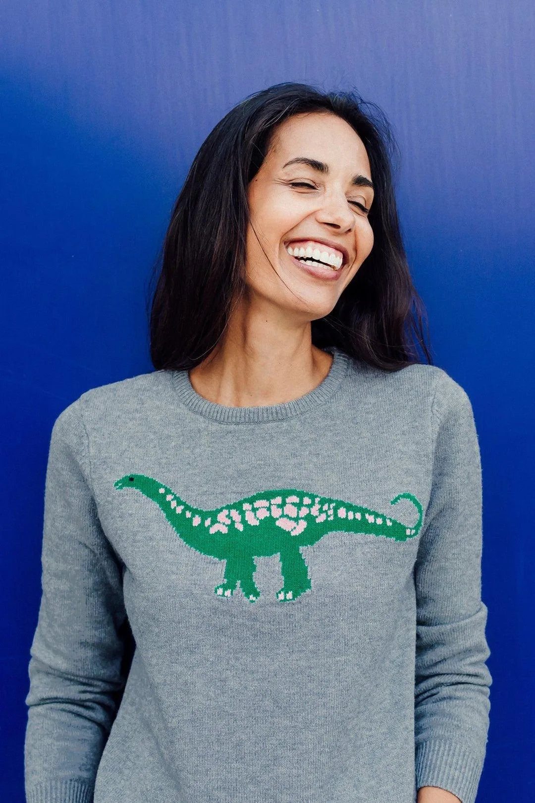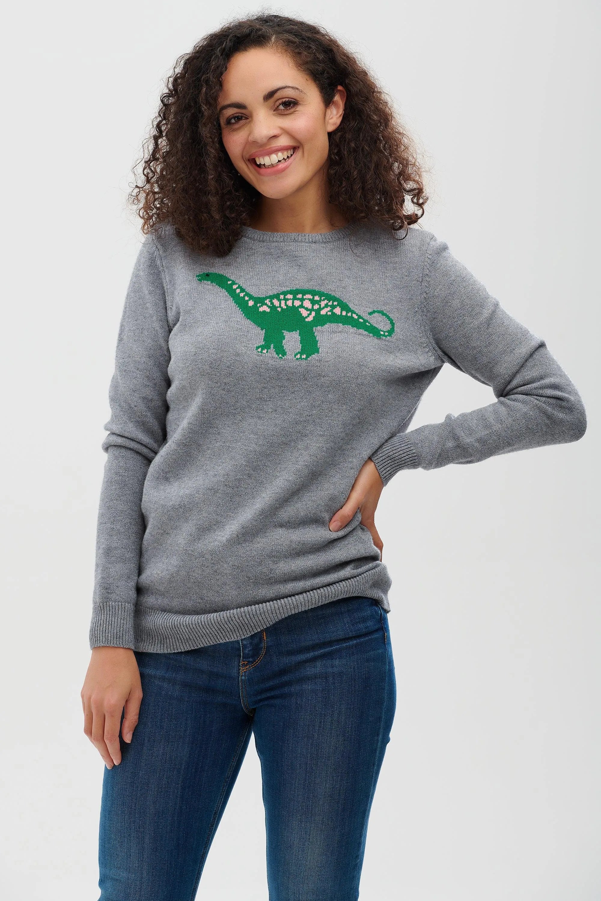 A slim fit jumper with a round neckline and a central dinosaur intarsia on the bust. We love an eye-catching sweater and Stacey's green dinosaur in a chunky, relaxed knit charcoal jumper is the perfect combination of comfort and style.