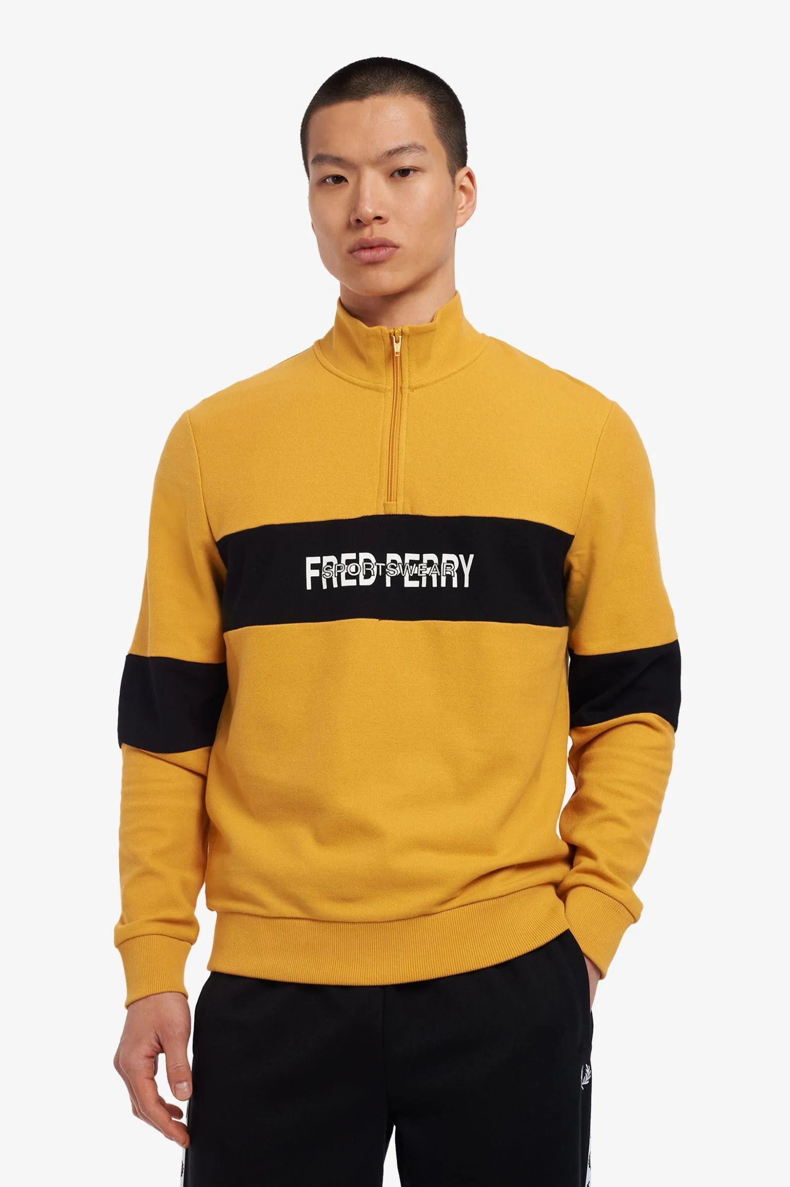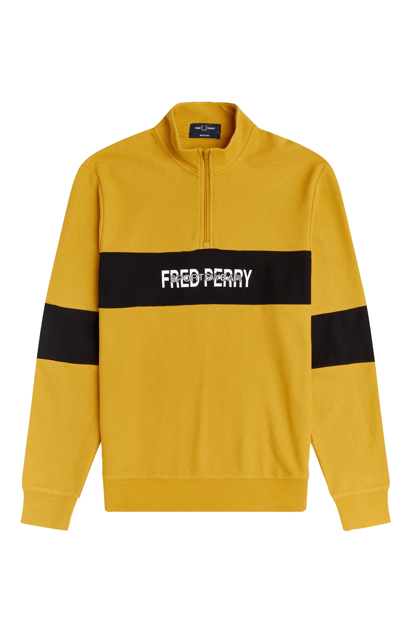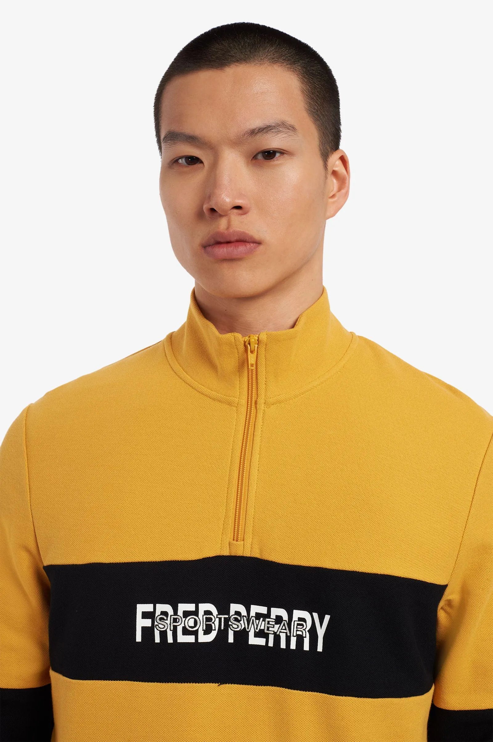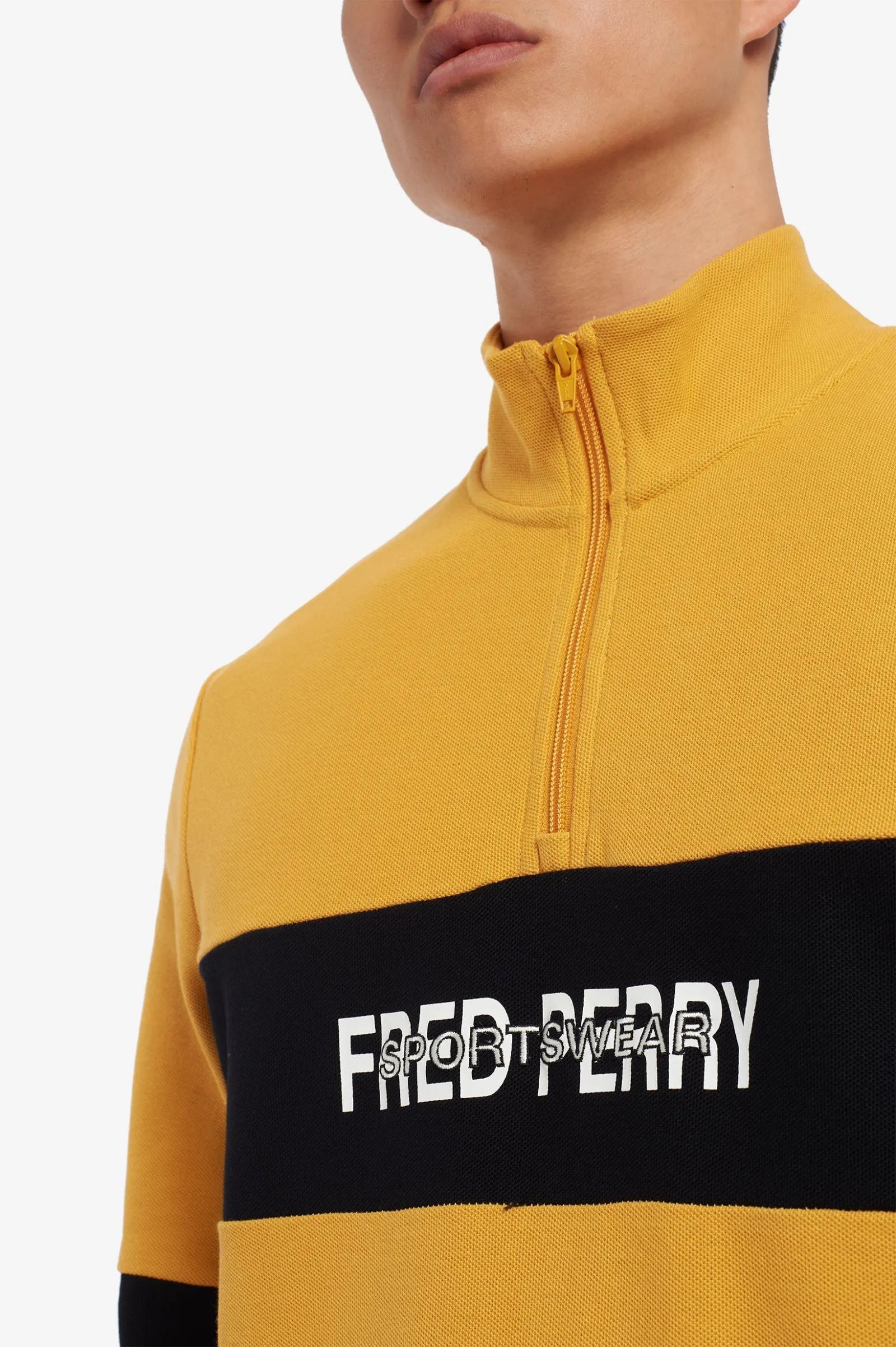 Chunky cotton piqué / Half-zip with funnel neck / Contrast chest panels and sleeves / Ribbed hem and cuffs / Printed and embroidered chest branding