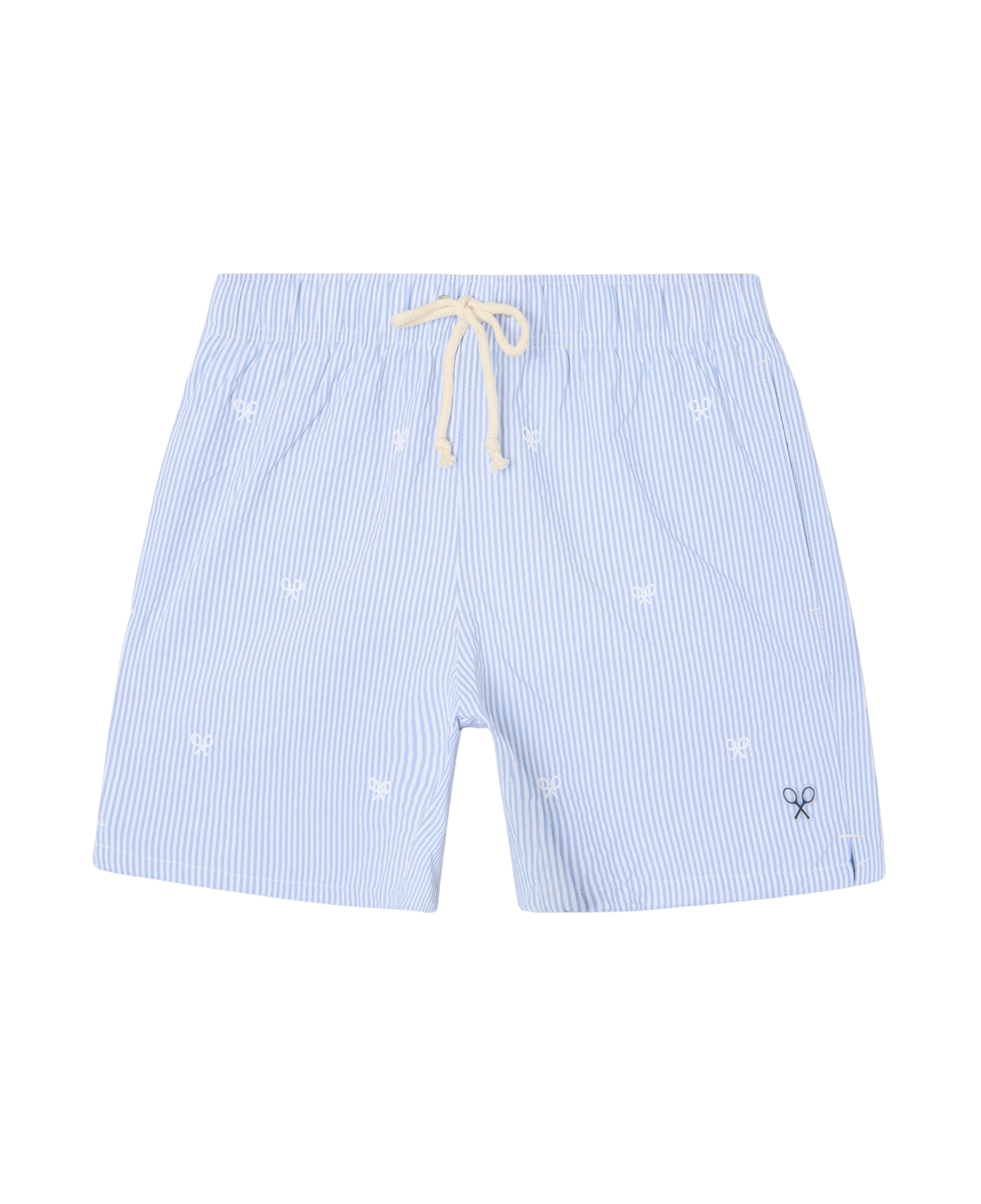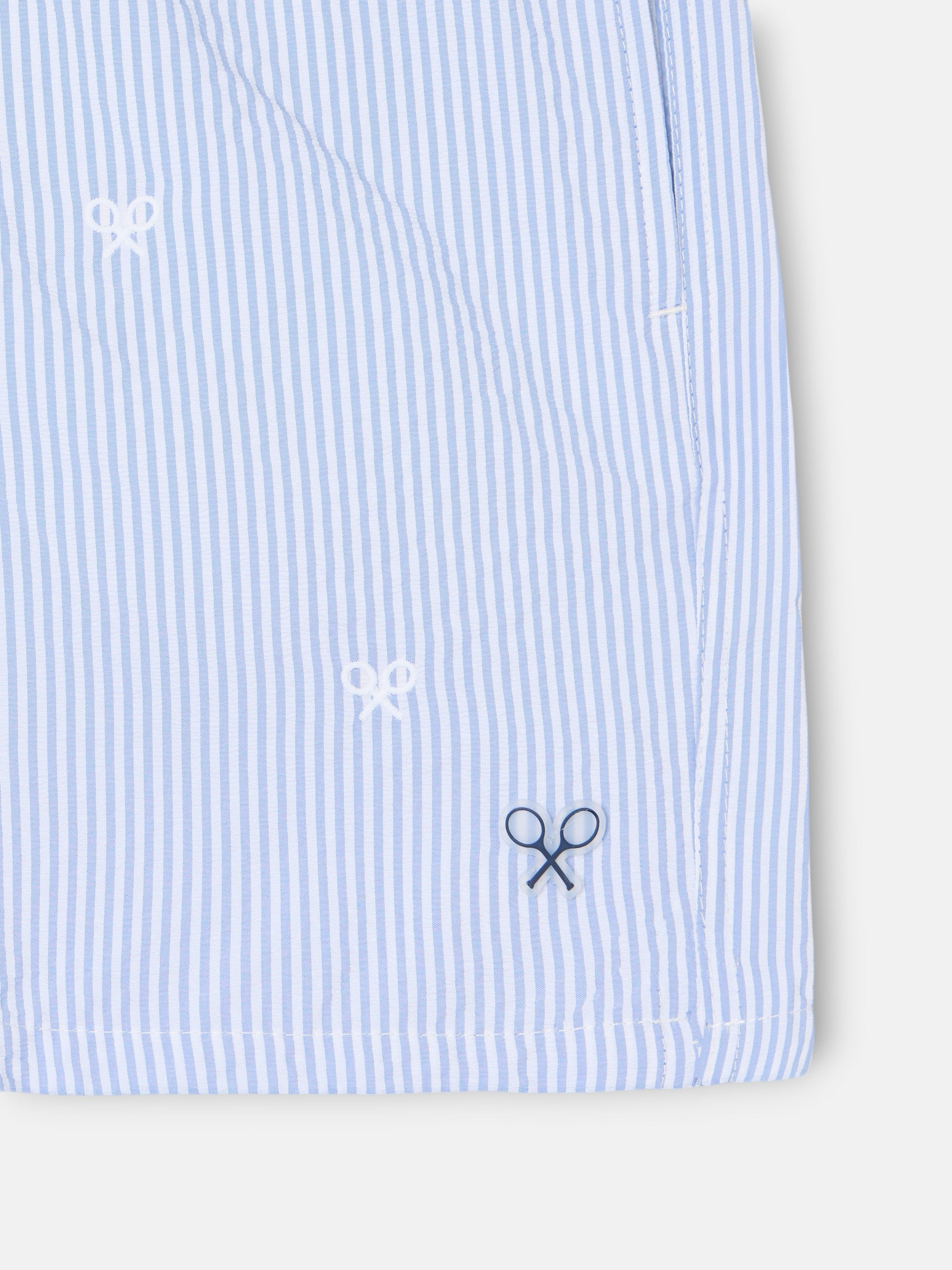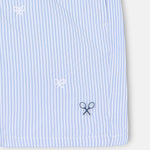 Bañador estampado con rayas finas. Presenta cintura elástica con ajustable personalizado y red interior. Cuenta con detalle de logo y de etiqueta tejida en bolsillo.