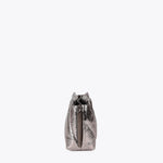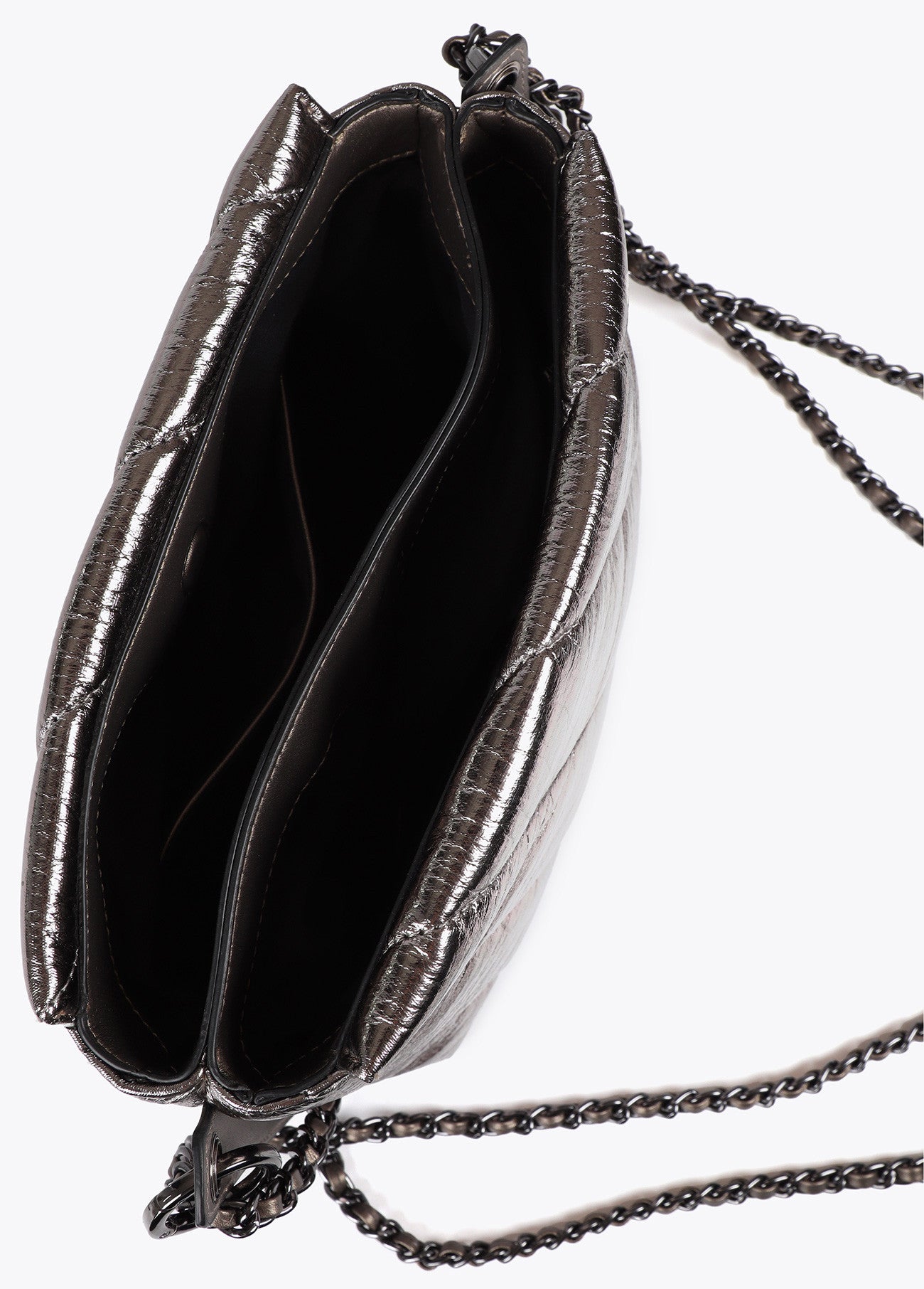 Bandolera con tejido metalizado y diseño acolchado. Incluye cierre imantado y cadena ajustable. Interior forrado con compartimentos múltiples para organización.