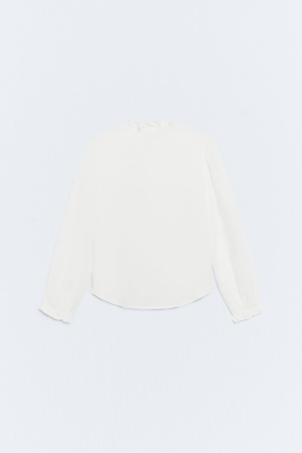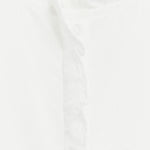 La Camisa Volantes Emiliana en color blanco de eseOese es una blusa femenina de diseño romántico confeccionada en 100 % algodón BCI, con tejido tipo plumetti que aporta ligereza y textura. Presenta cuello redondo, detalles fruncidos en cuello, puños y botonadura, y cierre con botones ocultos. Su corte recto ofrece un ajuste cómodo y fluido, idóneo para combinar tanto con looks casual-chic como más formales.