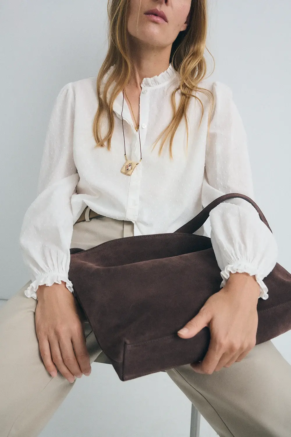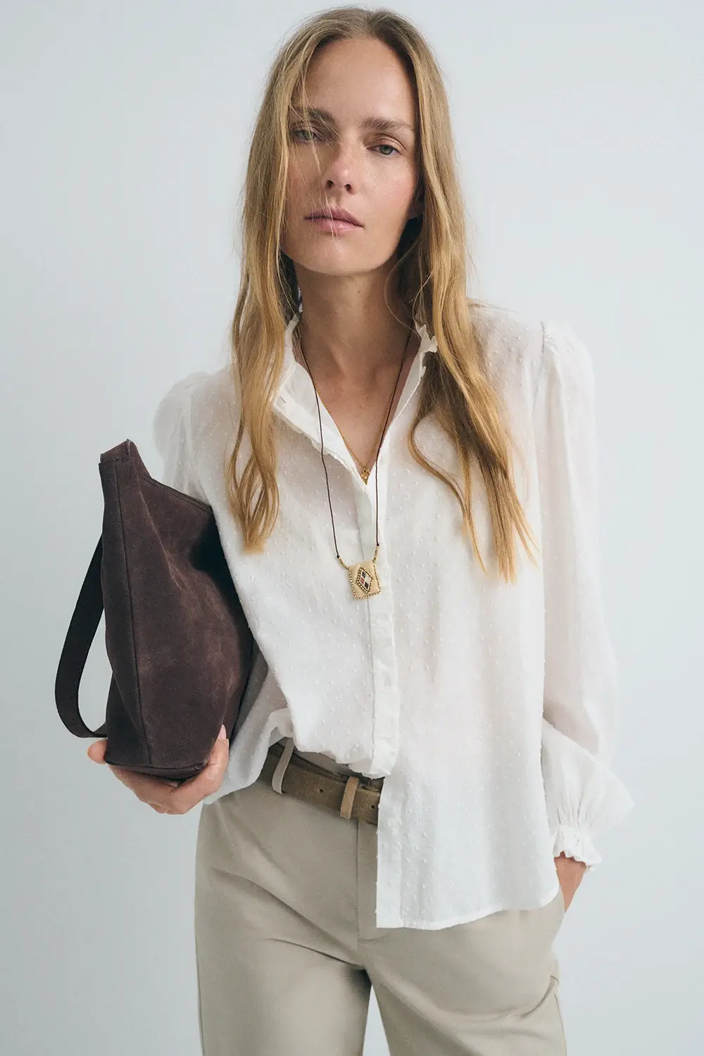 • Detalles: frunces en cuello, botonadura invisible y puños abotonados