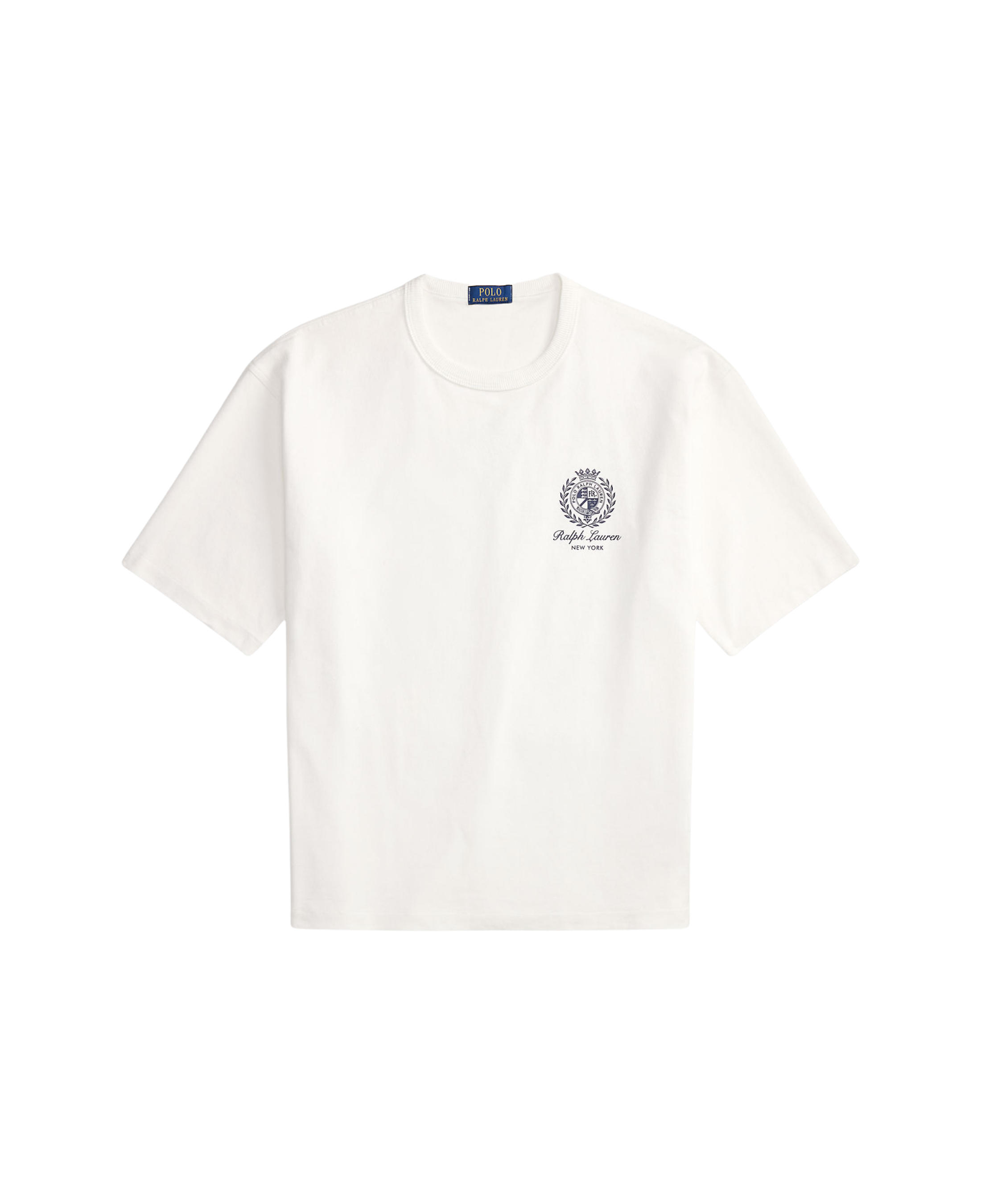 - Gráfico circular de archivo de 1986, "Ralph Lauren" en letra manuscrita y "New York" estampados en el lado izquierdo del pecho y en el centro de la parte trasera.