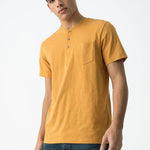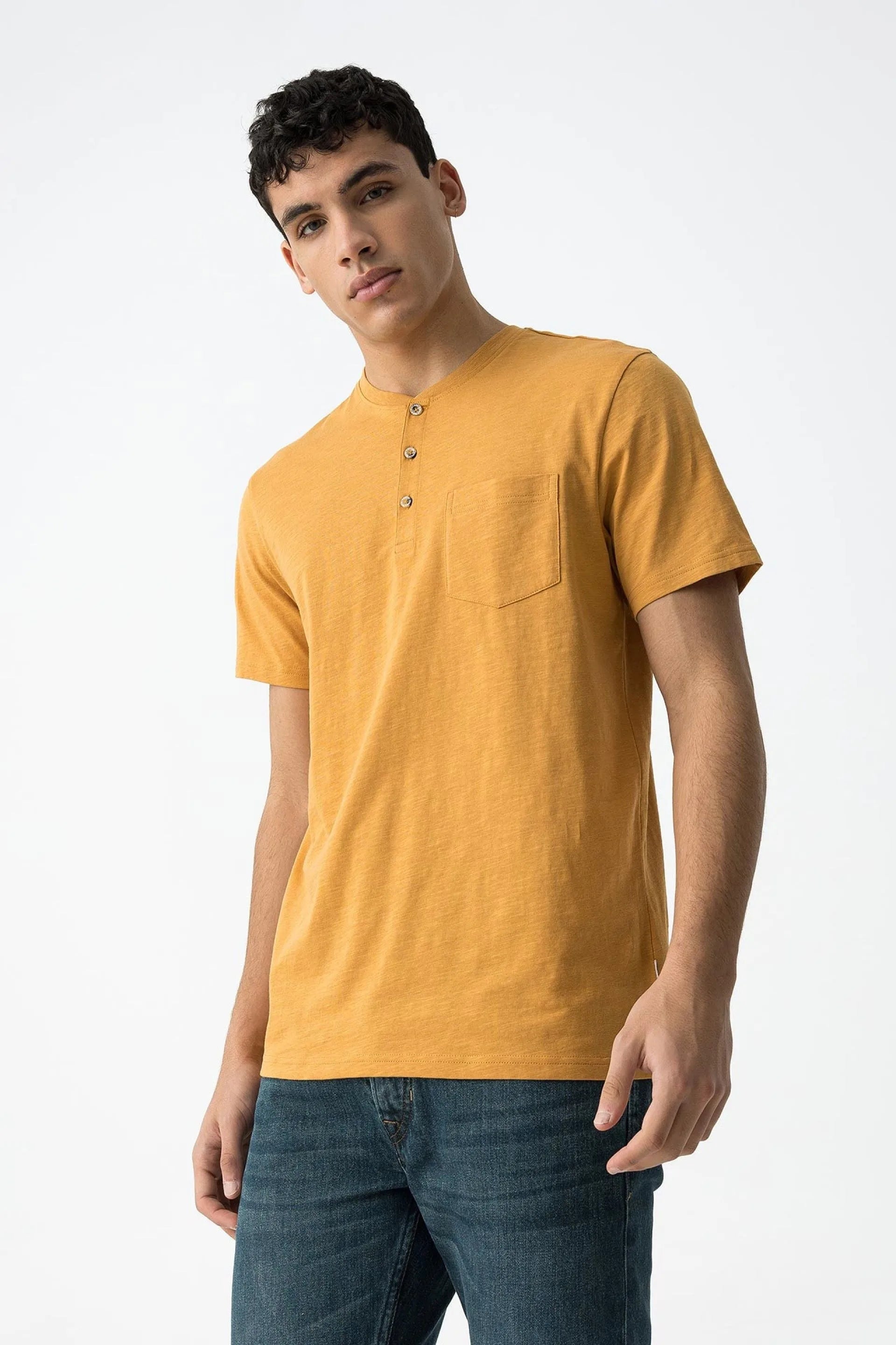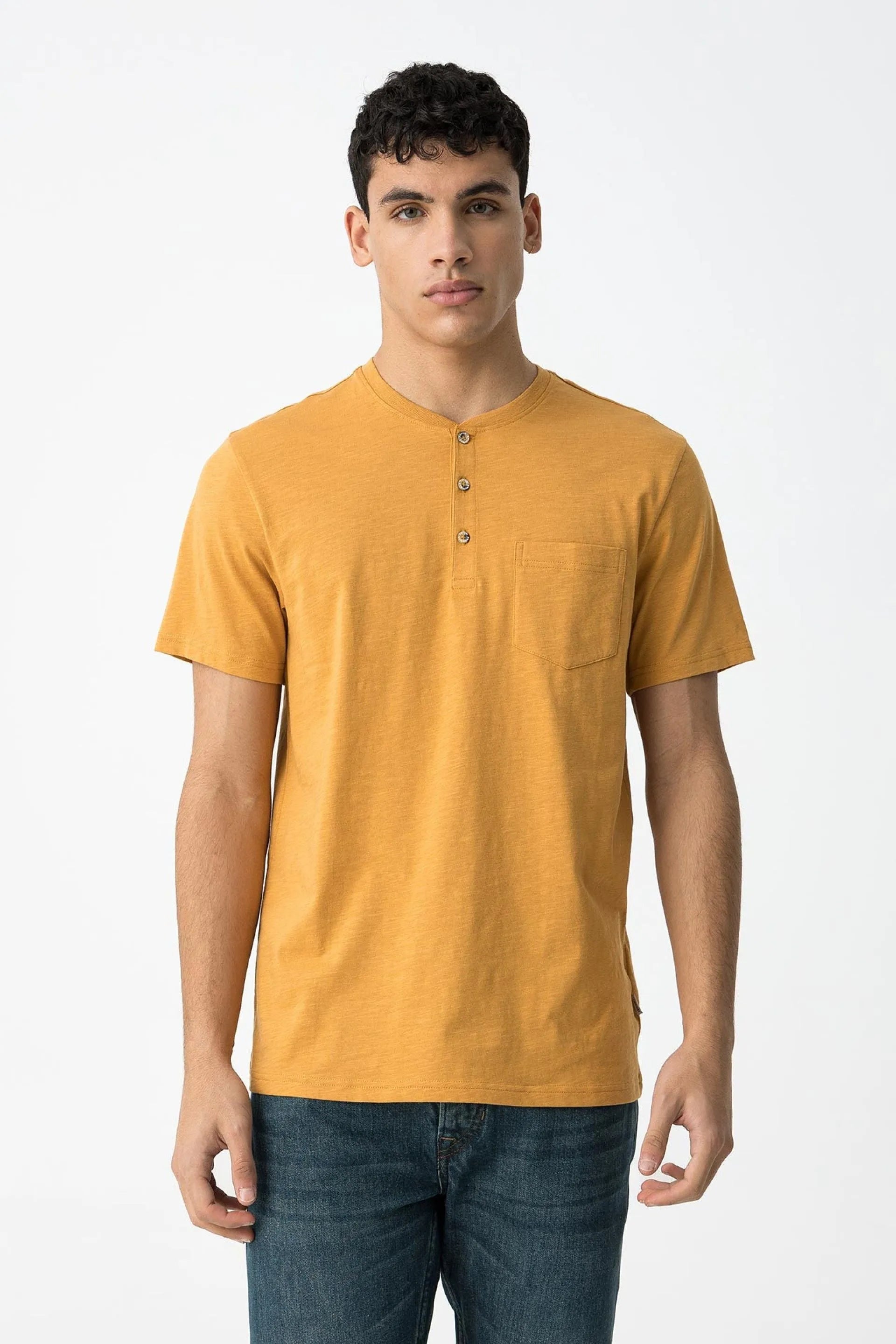 Regular-fit T-shirt with short sleeves and a round neck. Front pocket. Front button closure.
