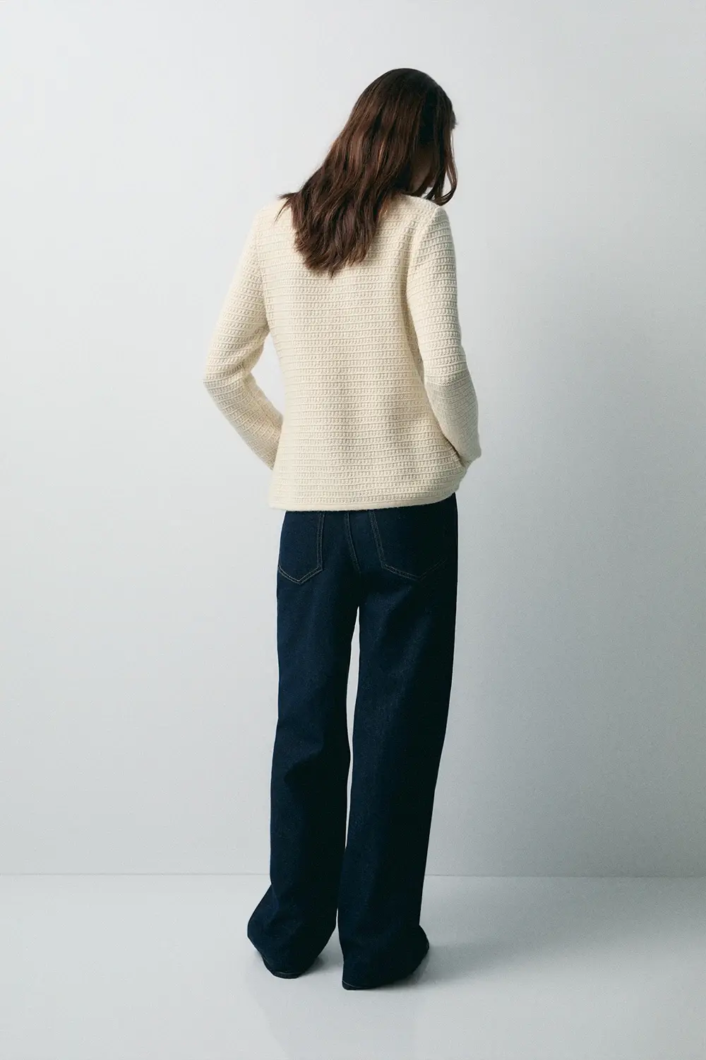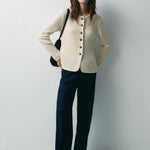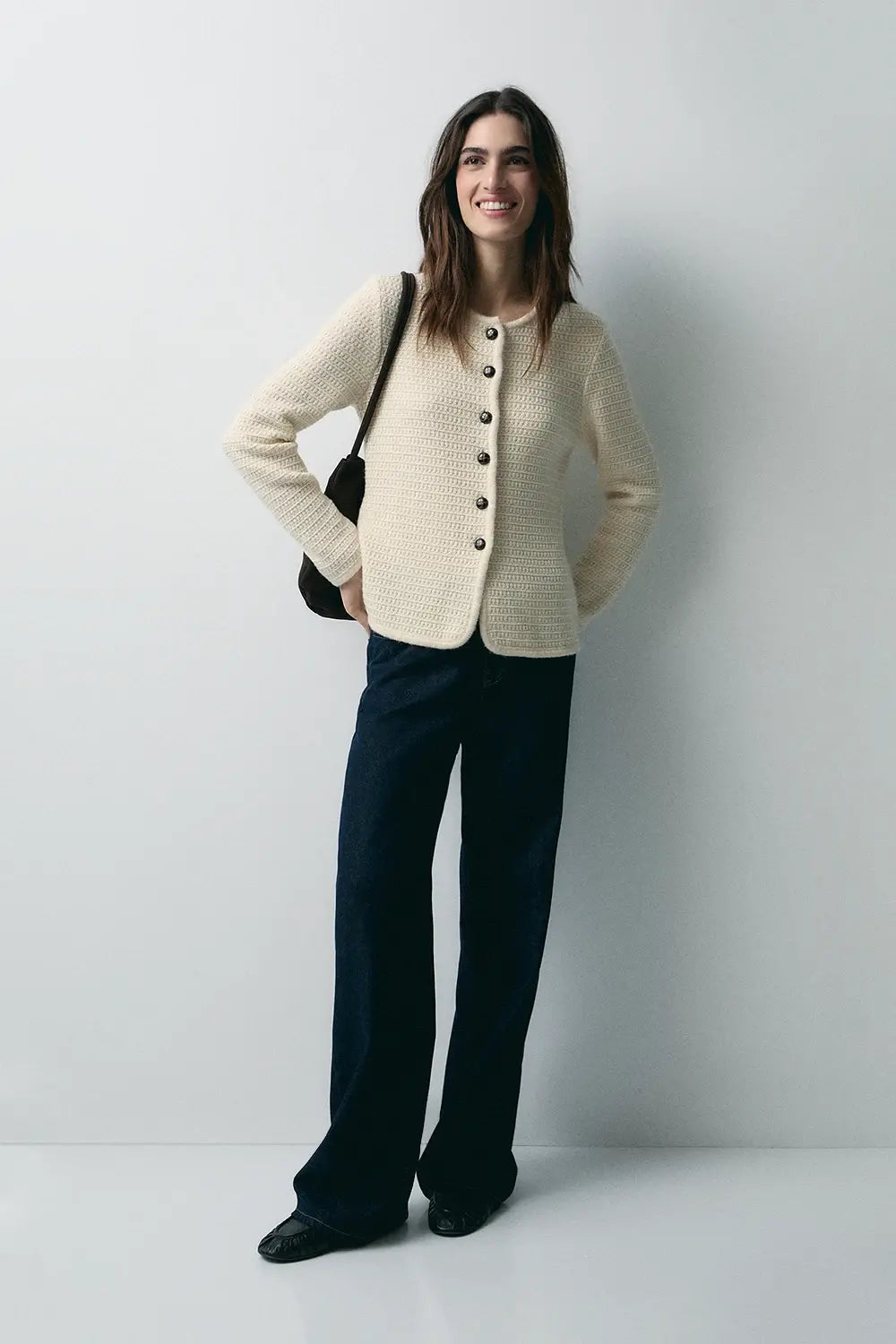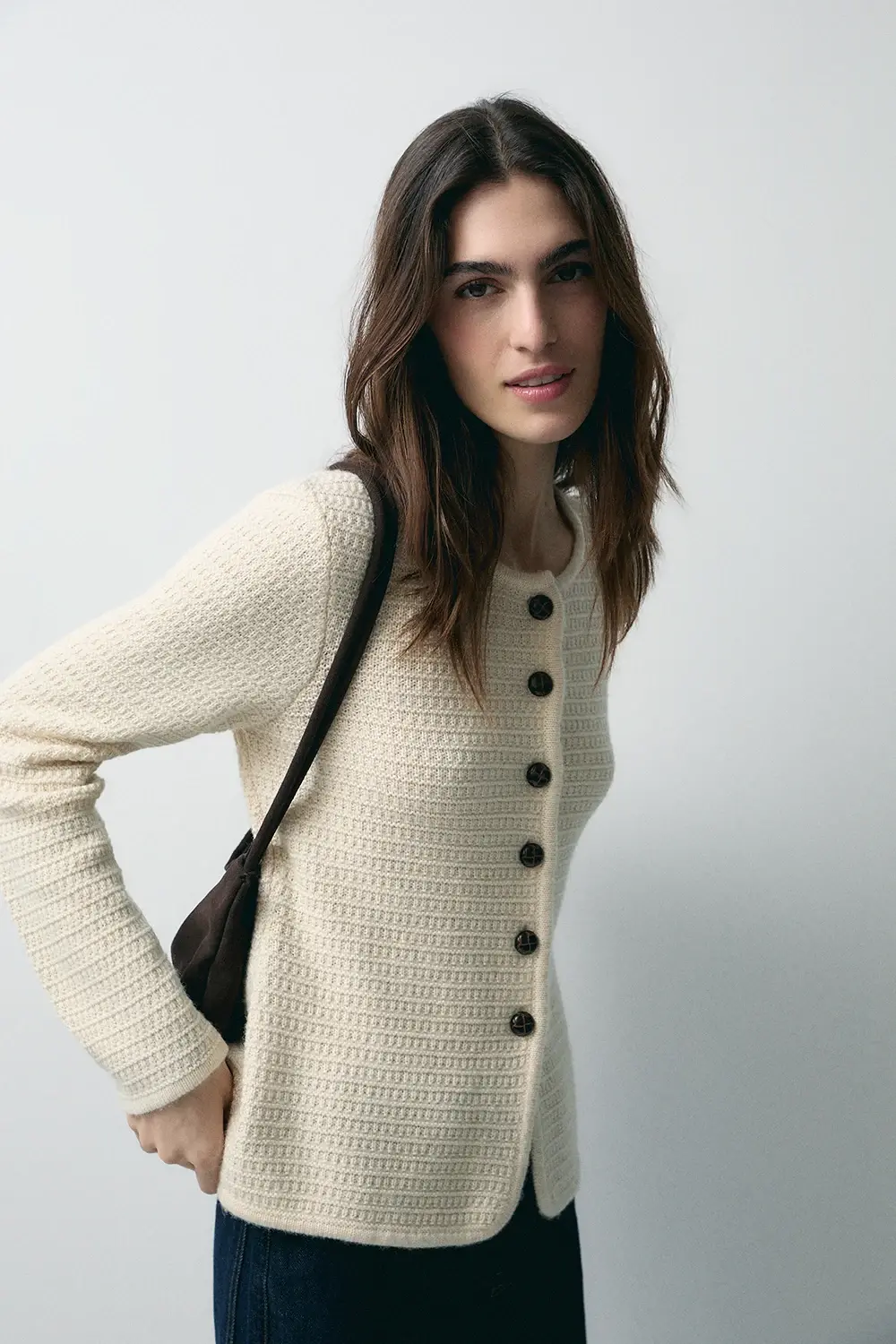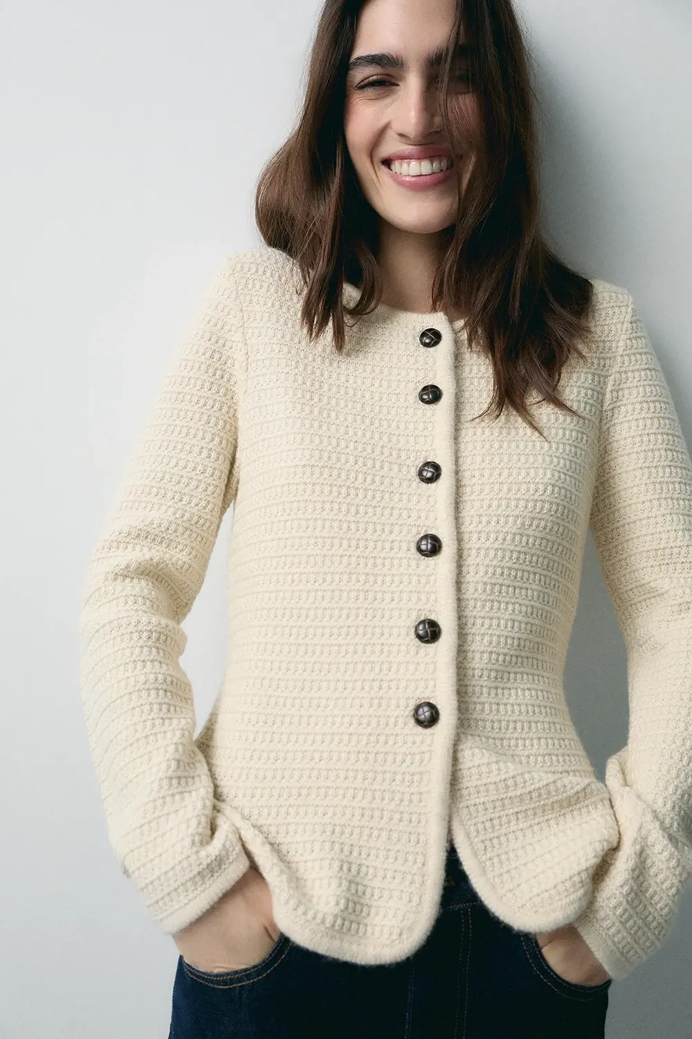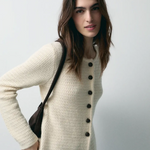El Cardigan Lana Cuello Caja Ecru de la firma eseOese es una prenda de punto elegante confeccionada en una mezcla premium con predominio de lana, lo que garantiza calidez, textura suave y una caída favorecedora. Su diseño incluye cuello caja, botones delanteros sutiles y largo que cubre hasta la cadera, lo que lo convierte en una capa perfecta para estilismos de entretiempo o para superponer sobre vestidos o camisas. El tono ecru aporta luminosidad y combina con facilidad dentro del armario.